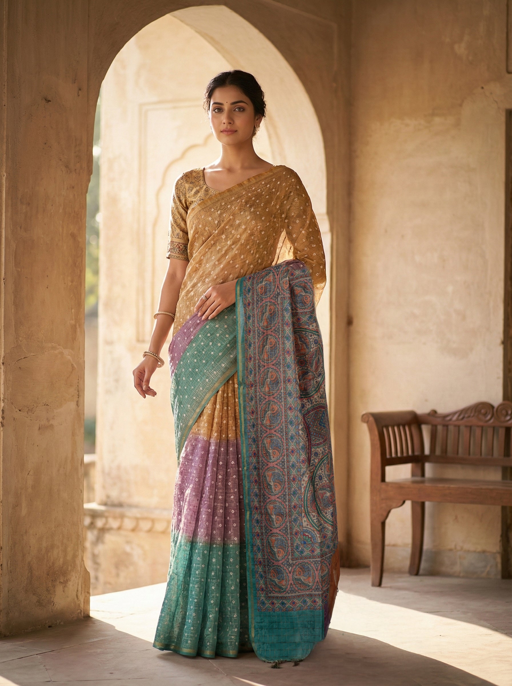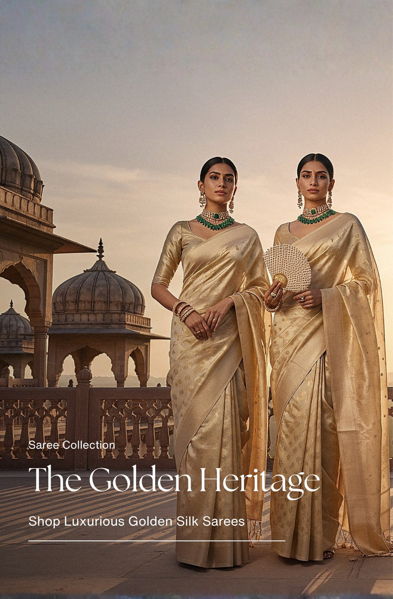 Golden Color Saree With Patterns In Shades Of Pink