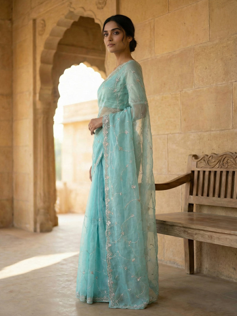 Organza Silk Embroidery Aqua-Blue Floral Saree