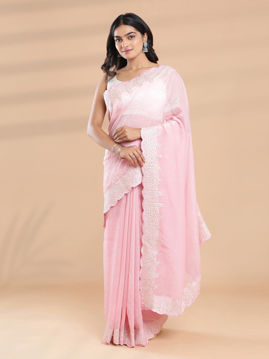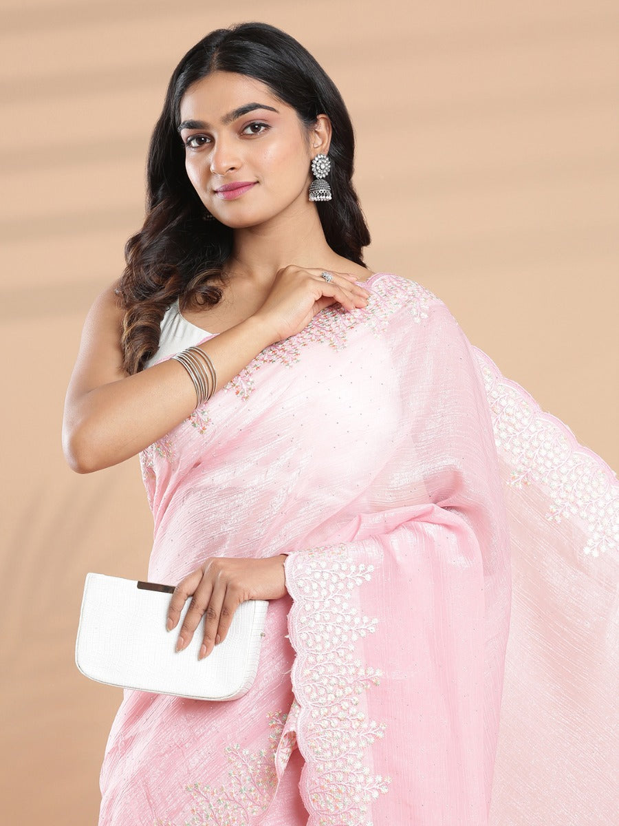Baby Pink Color Soft Crush Organza Saree With Embroidery Design On Border
