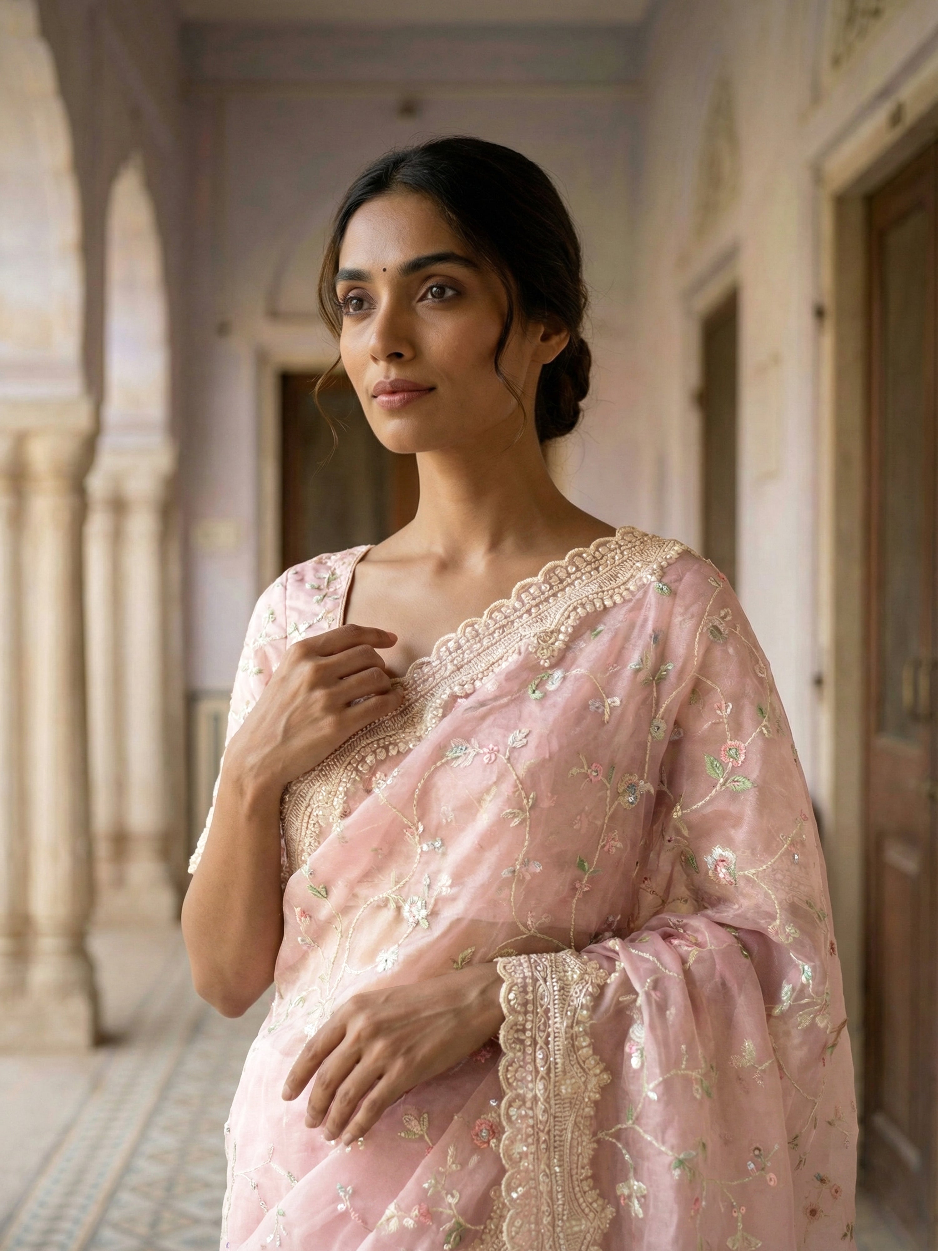 The saree is beautifully finished with an intricate scalloped lace border, adding a luxurious and refined touch. The embroidery features subtle thread and floral detailing that complements the airy, elegant drape. Paired with a matching baby pink embroidered blouse, this ensemble offers a flawless, coordinated look.