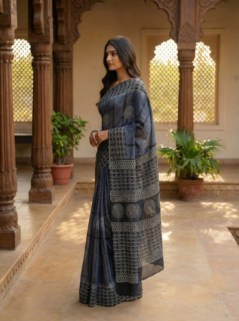 The saree features a printed body with subtle tree-inspired motifs, enhanced by a contrast black pallu and a distinctive triangle line border design that adds a modern geometric touch. The coordinated printed black blouse completes the look, making it suitable for office wear, casual outings, and simple festive occasions.