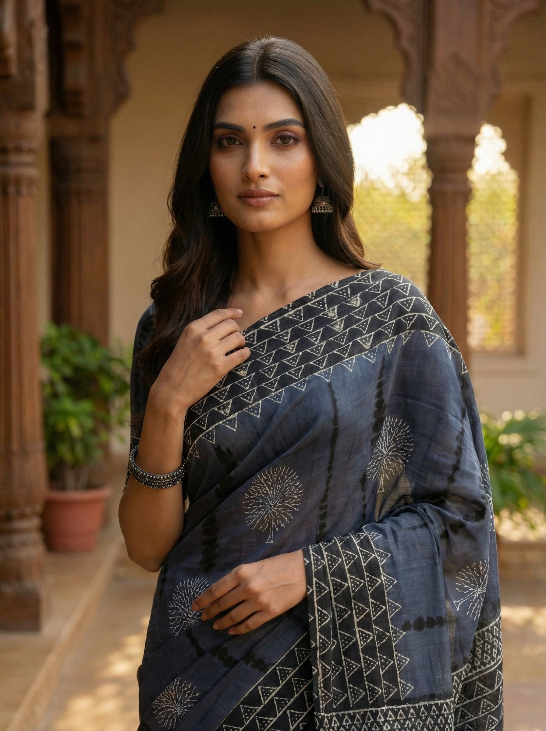 Elevate your everyday look with this elegant Soft Cotton Saree in Black Dark Ash, designed for comfort and effortless style. The saree features an all-over printed body pattern complemented by a contrast black printed pallu, enhancing its modern appeal.