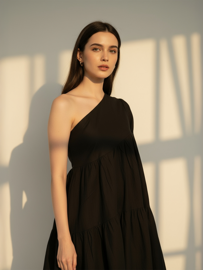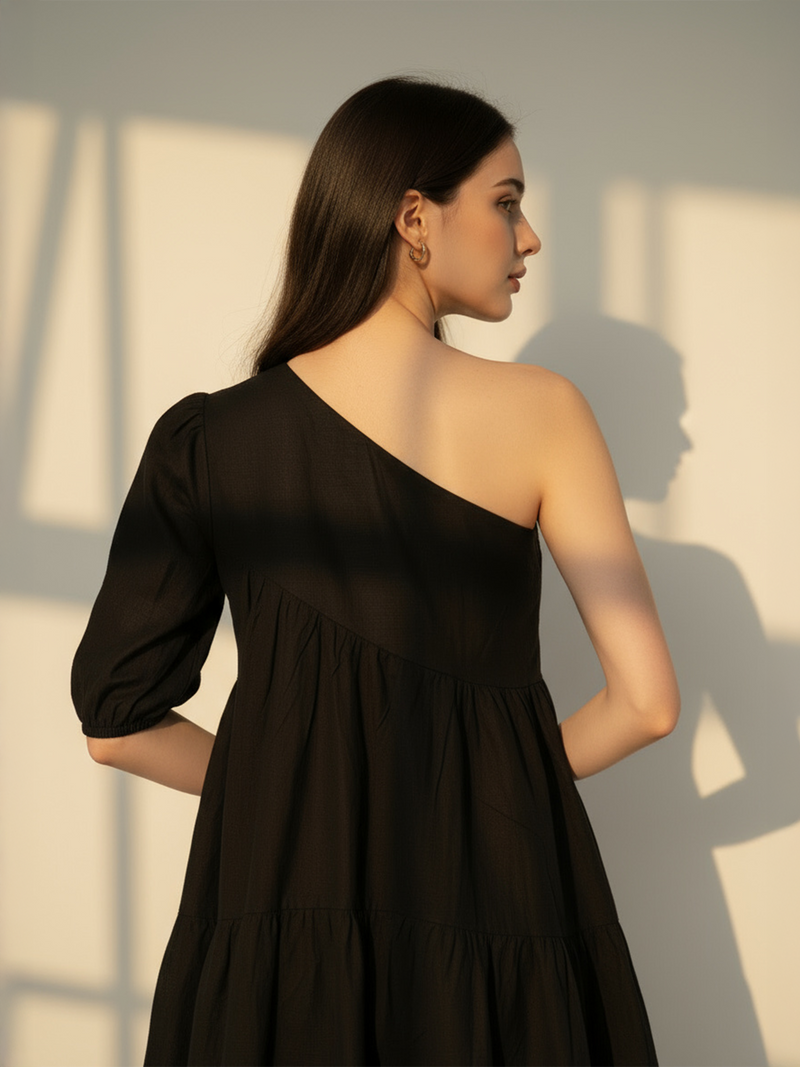 Make a statement in this chic black one-shoulder dress, crafted from premium Flex fabric for a sleek, comfortable fit. The short flared silhouette and single sleeve design add modern flair — a stunning pick in dresses for women who love standout style.