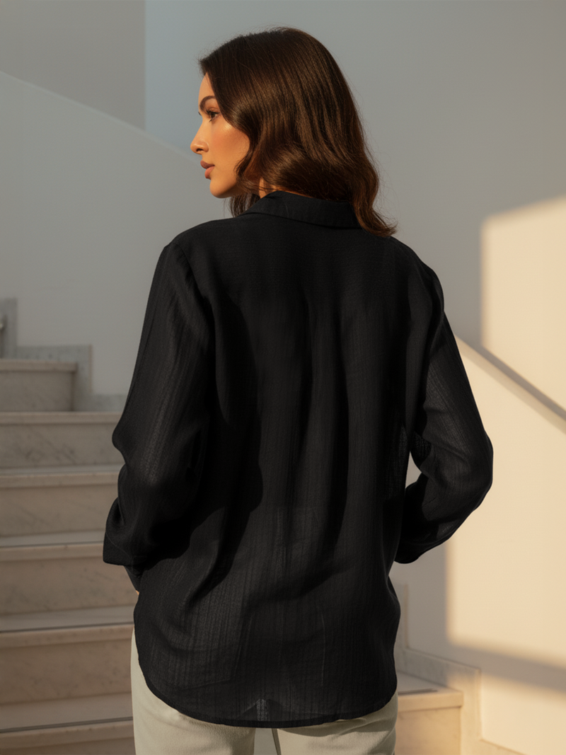 Relax tshirt in black crafted in crafted in poly satin, cut to a regular fit and finished with full sleeves. Weekday-to-weekend ease.