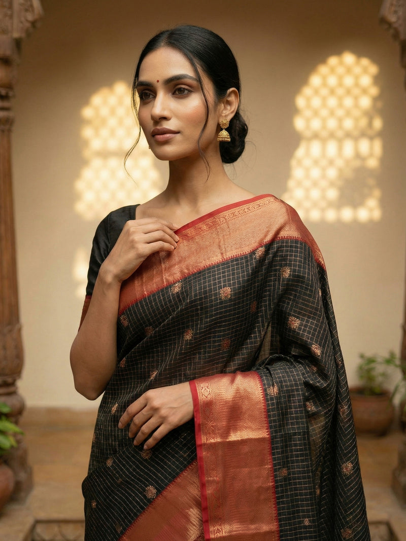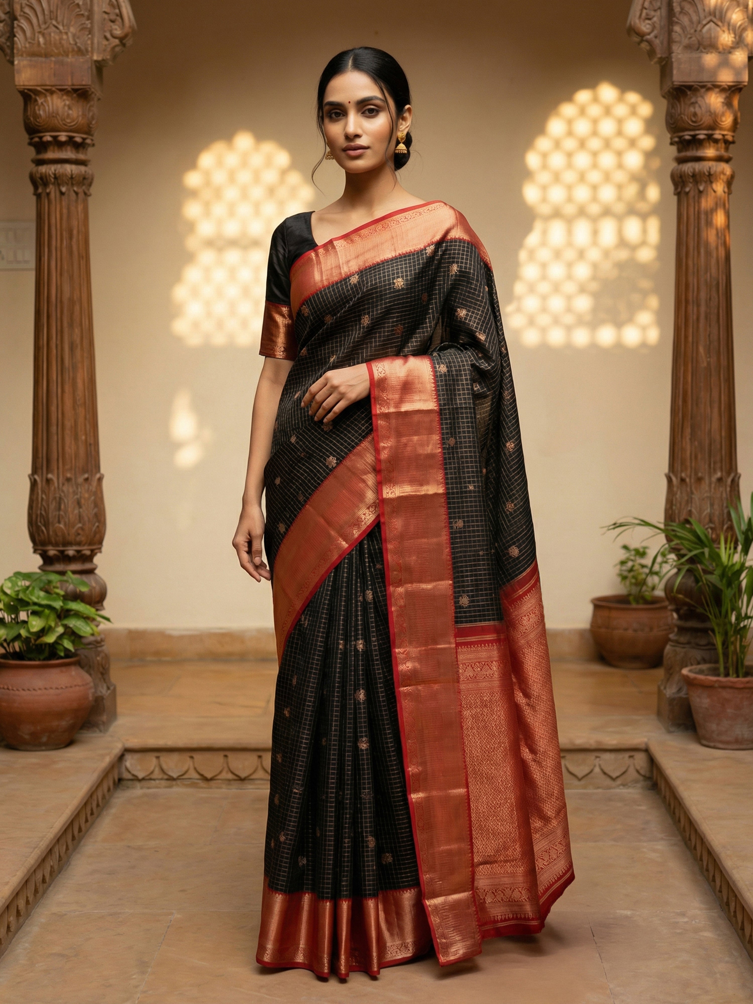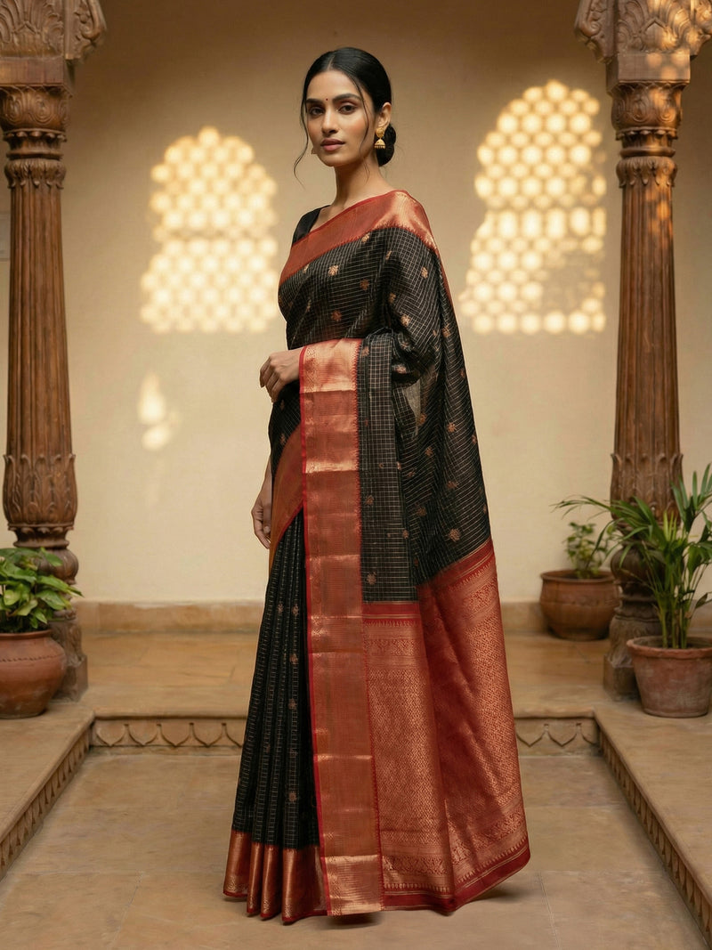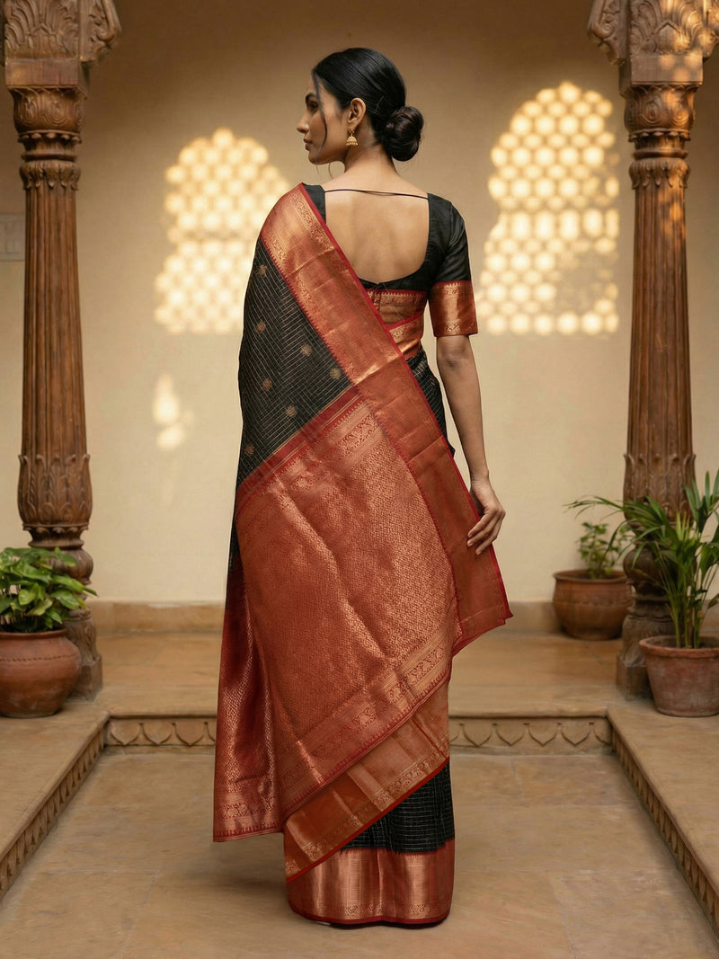 This classic Black and Red Kancheepuram pure silk saree beautifully reflects the richness of traditional South Indian craftsmanship. Woven from authentic Kancheepuram pure silk, the saree features a deep black body adorned with fine self-woven checks and subtle zari buttis, adding understated elegance. The striking red zari border and richly woven red pallu lend a bold and regal contrast, enhancing the saree’s timeless appeal.
