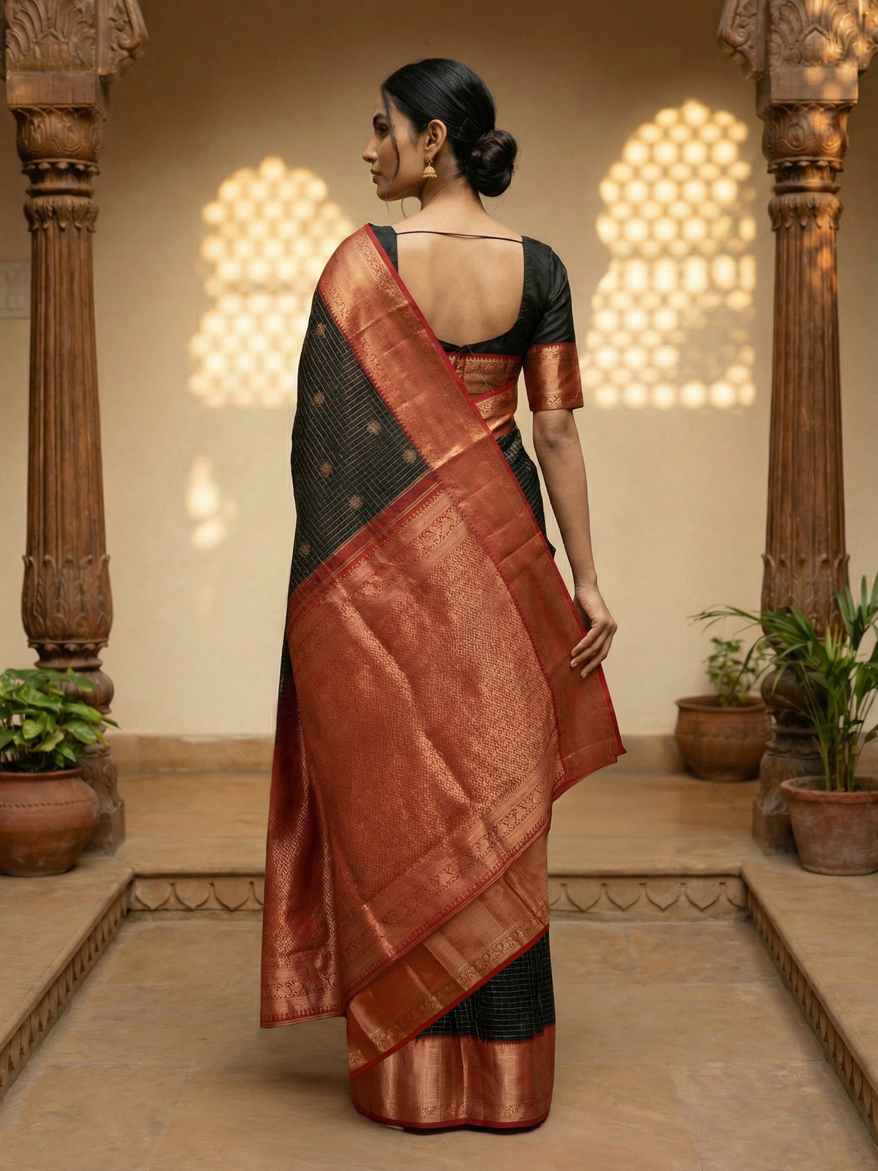Black & Red Zari Kancheepuram Pure Silk Saree with Traditional Border