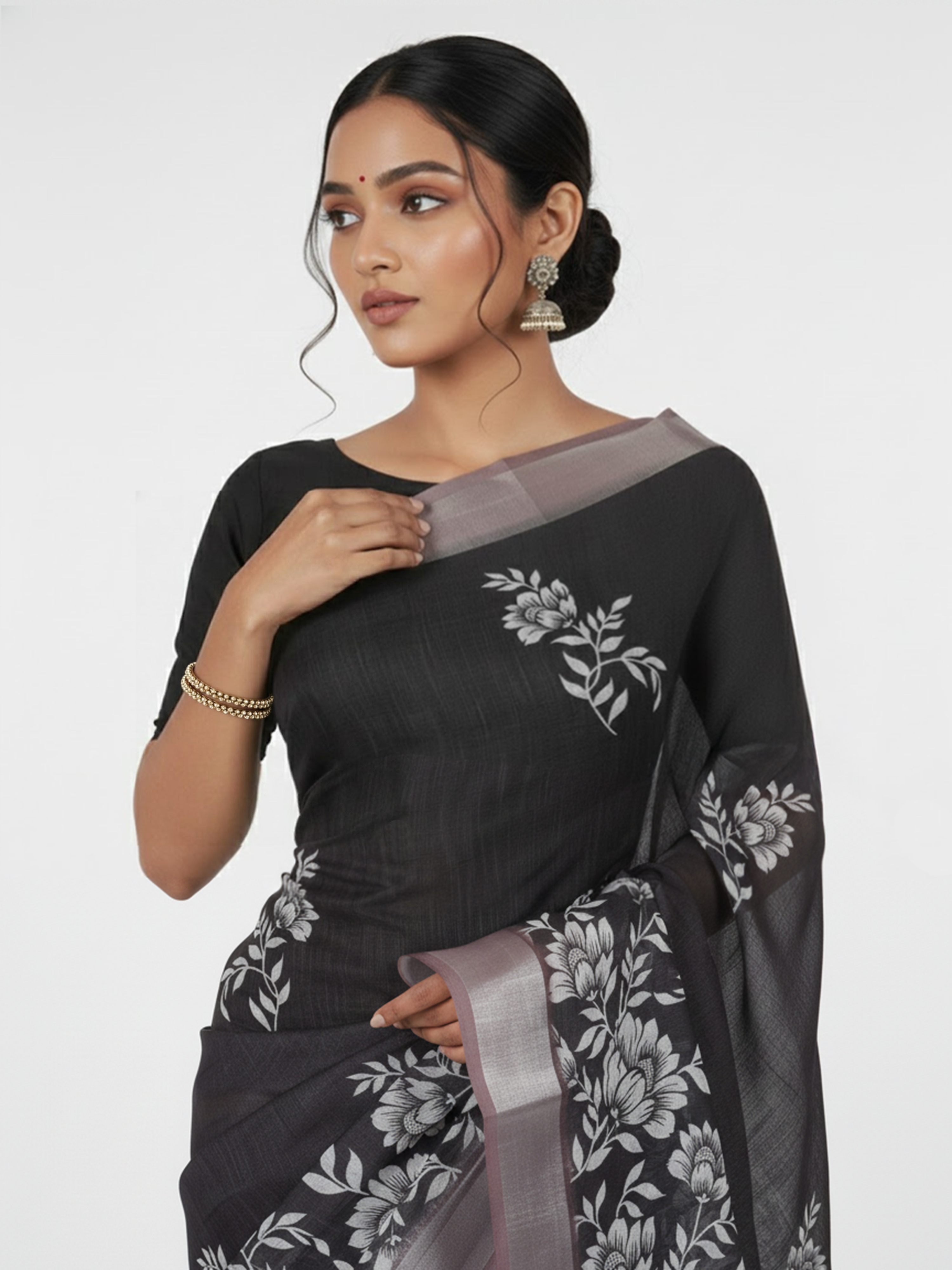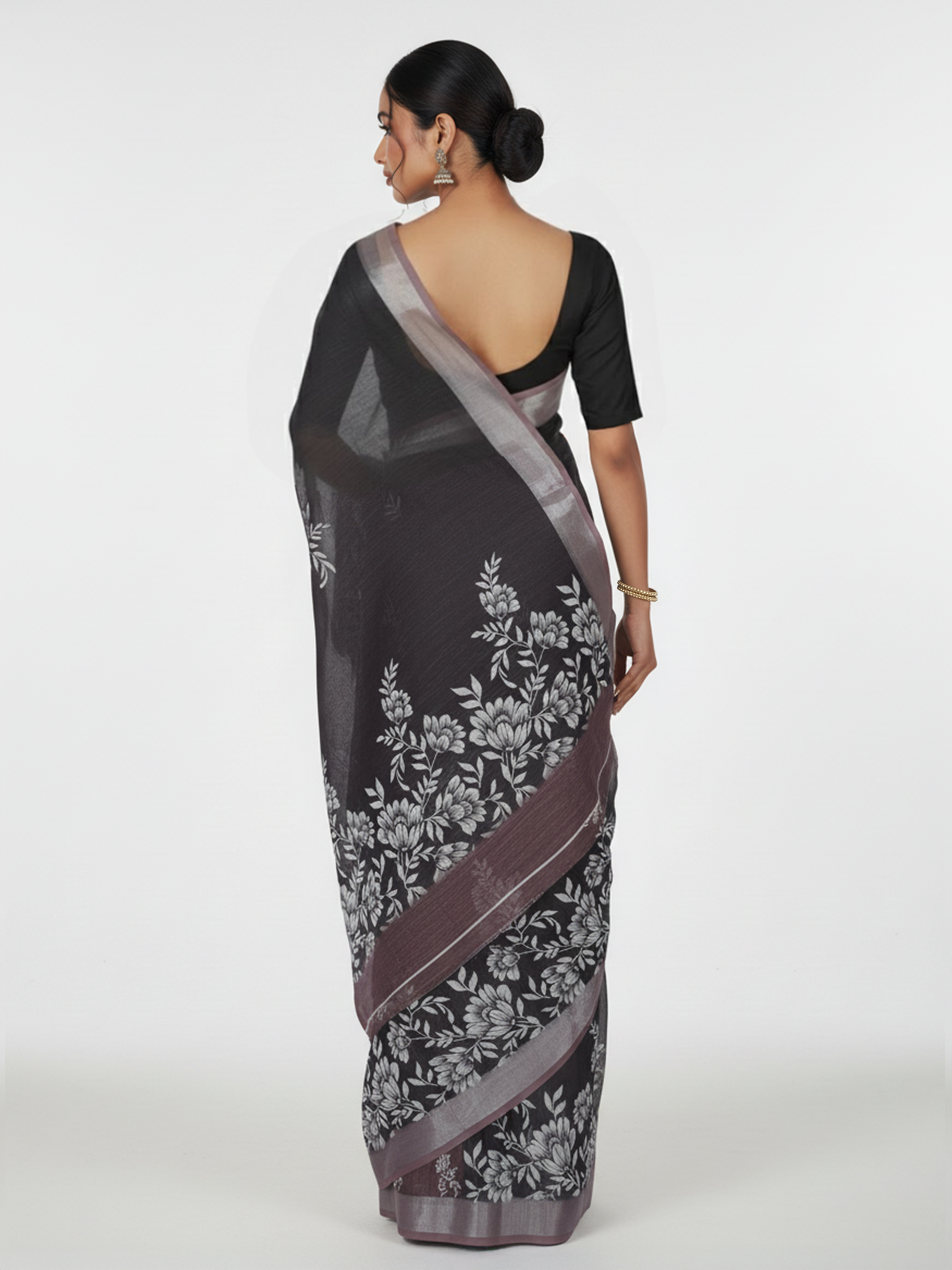 Stylish semi linen saree in black and light brown with printed design and silver Bavanji border.