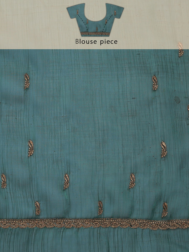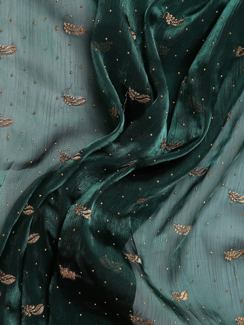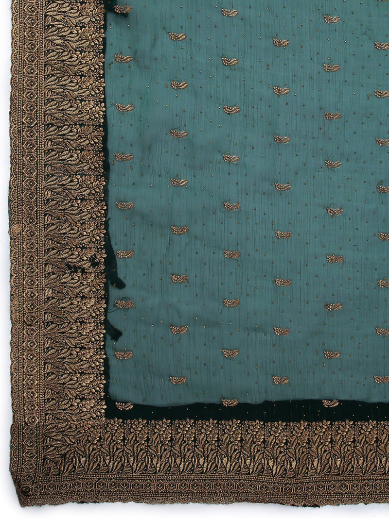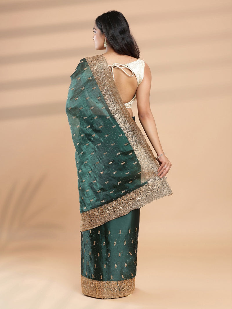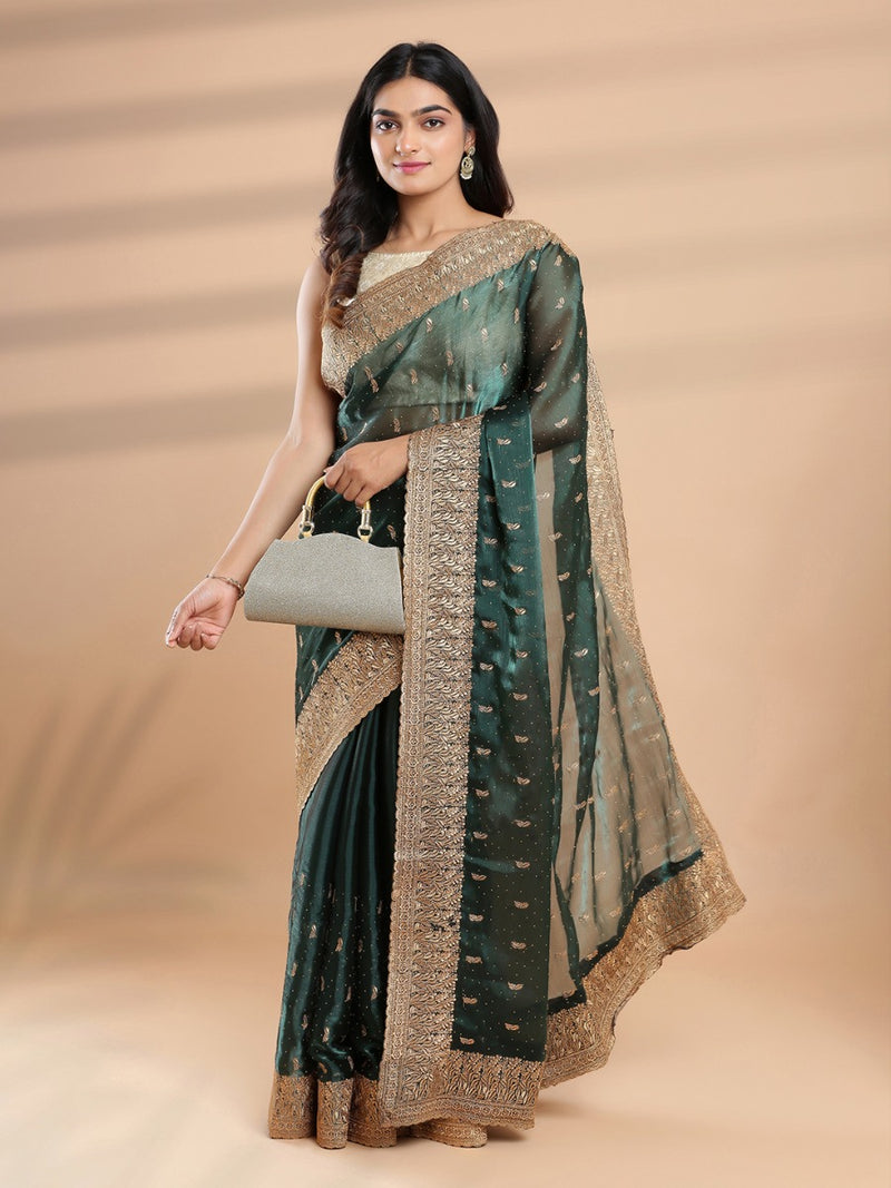 Bottle Green Color Organza Saree With Golden Small Buttas & Mini Stone Works