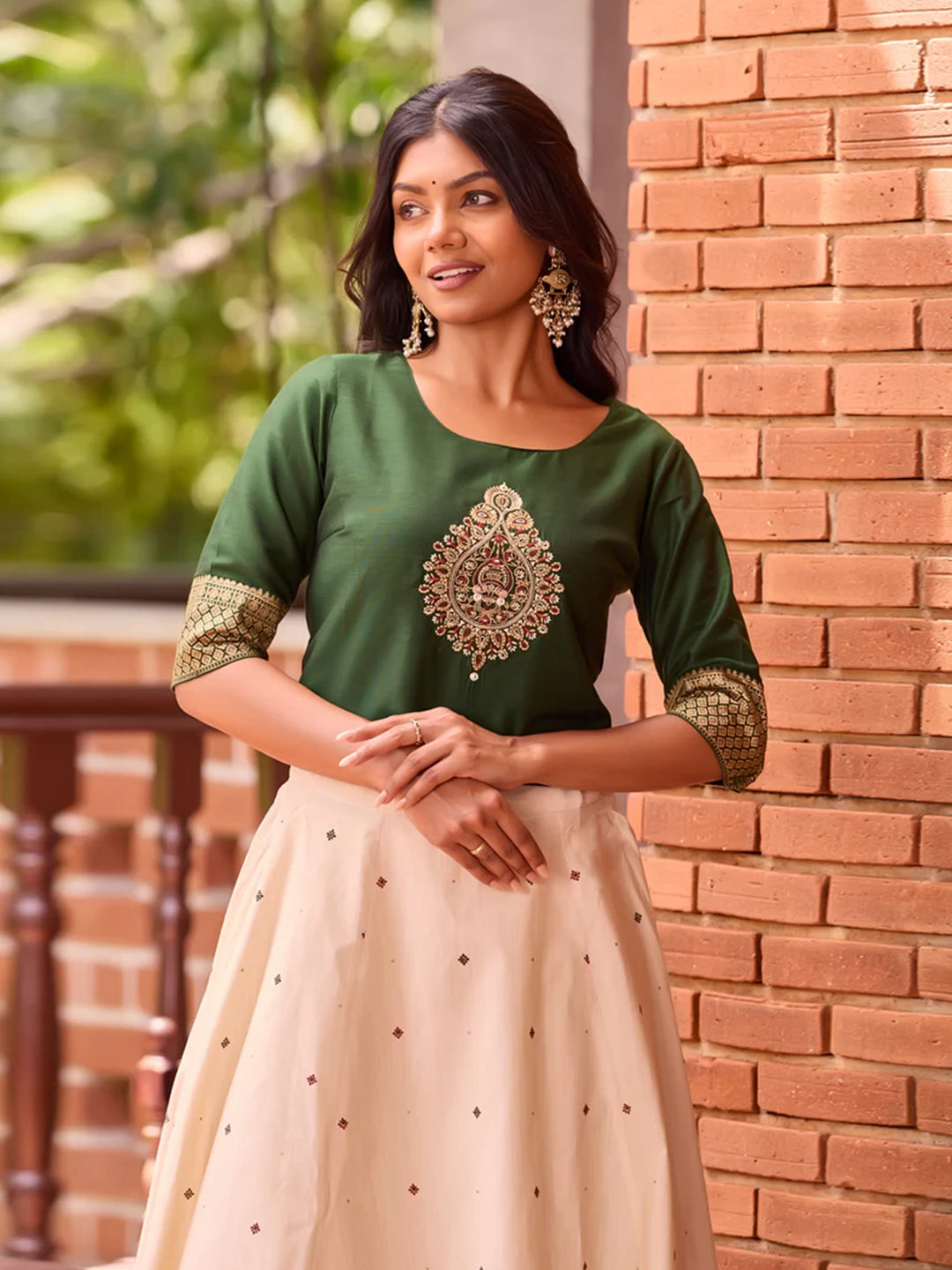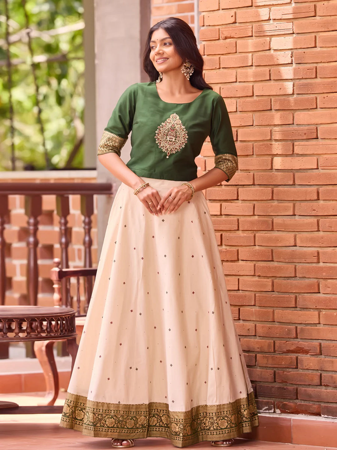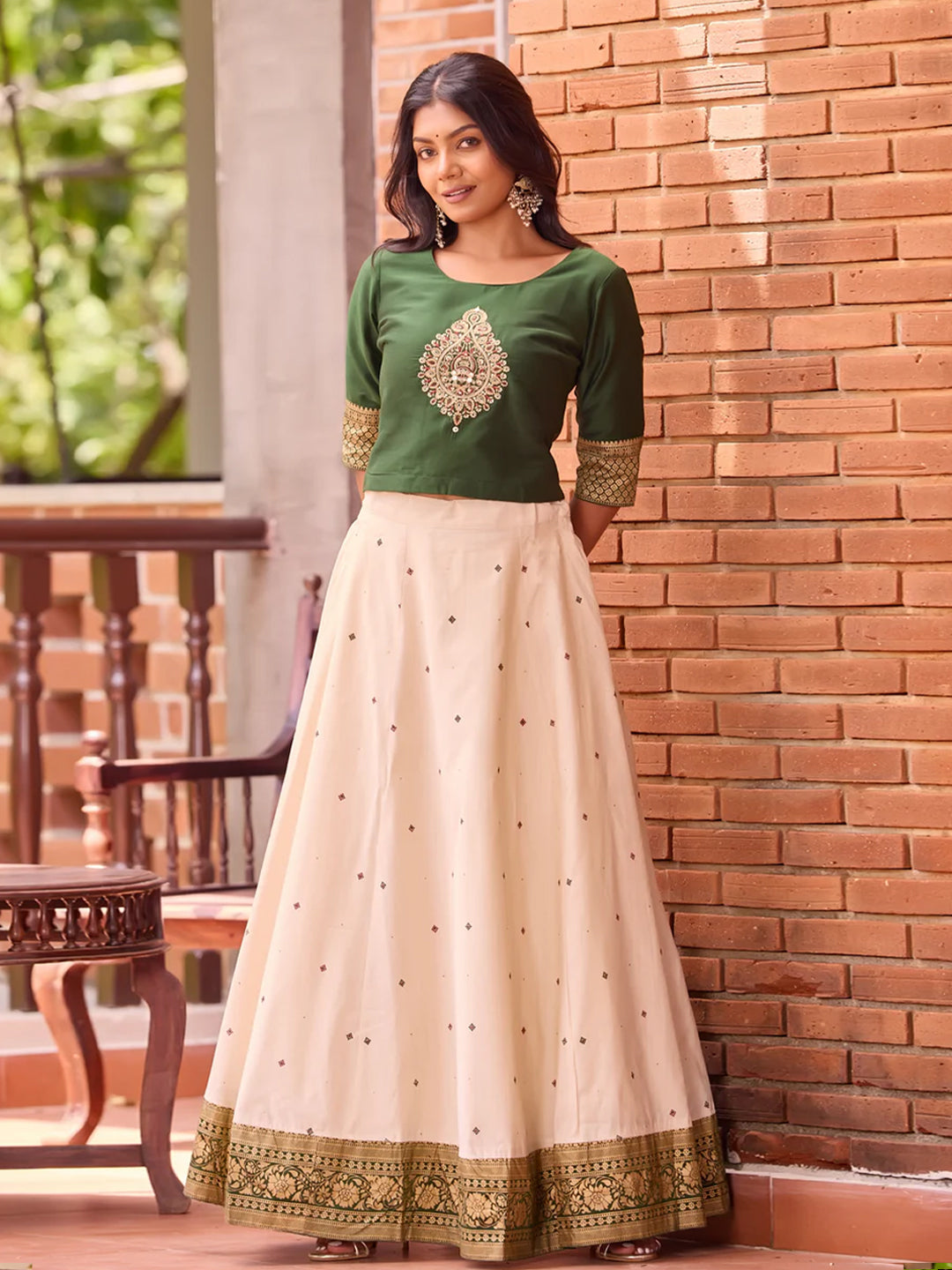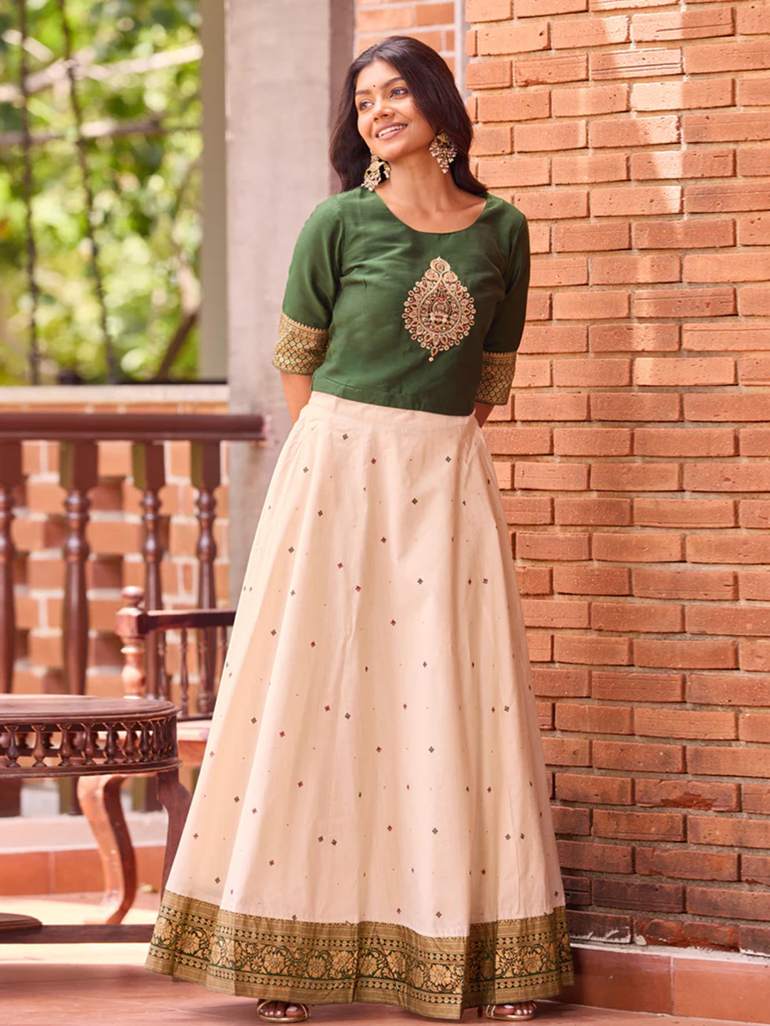 Bottle Green Kathakali Crop Top with Off-White Panel Skirt