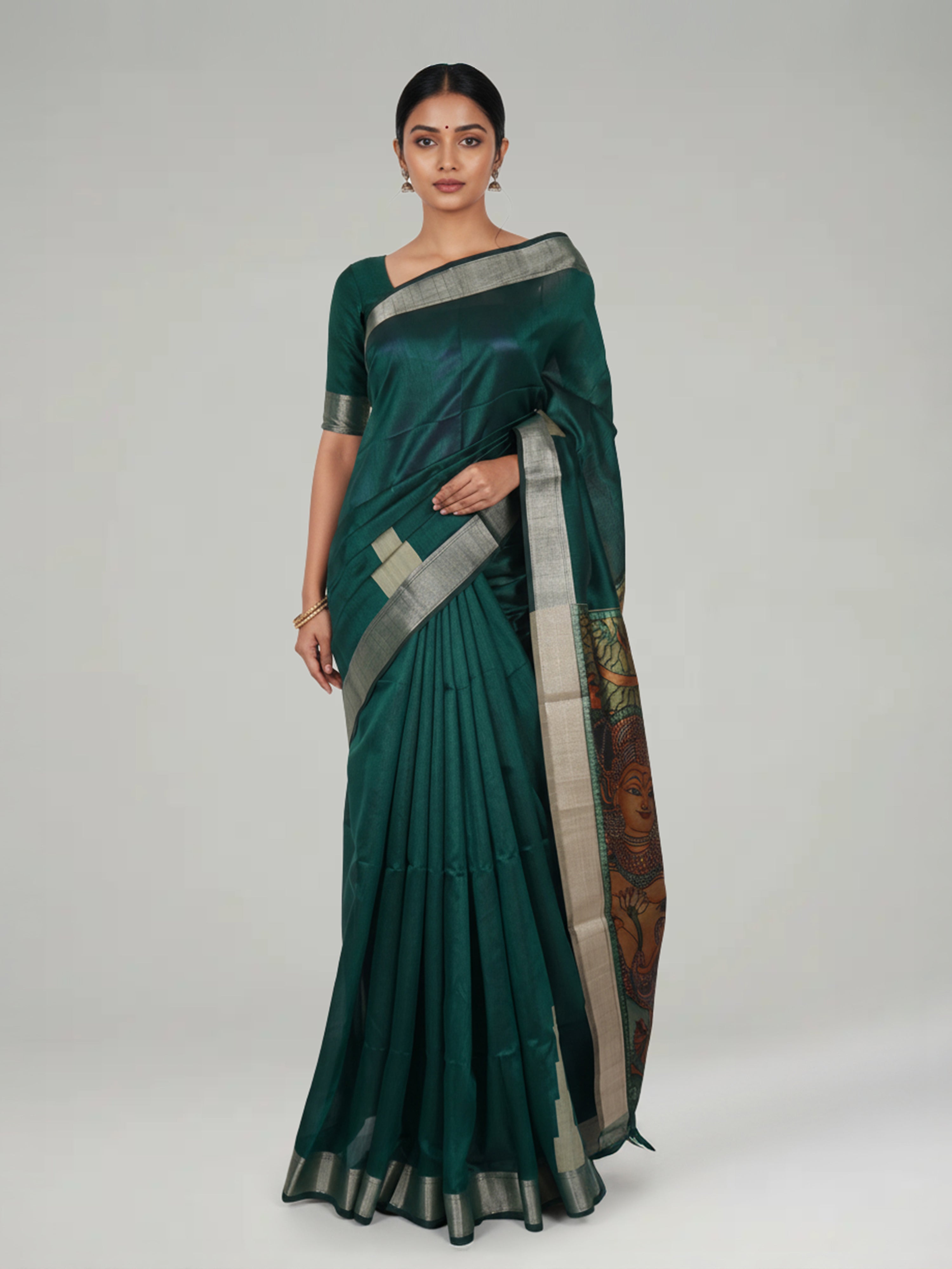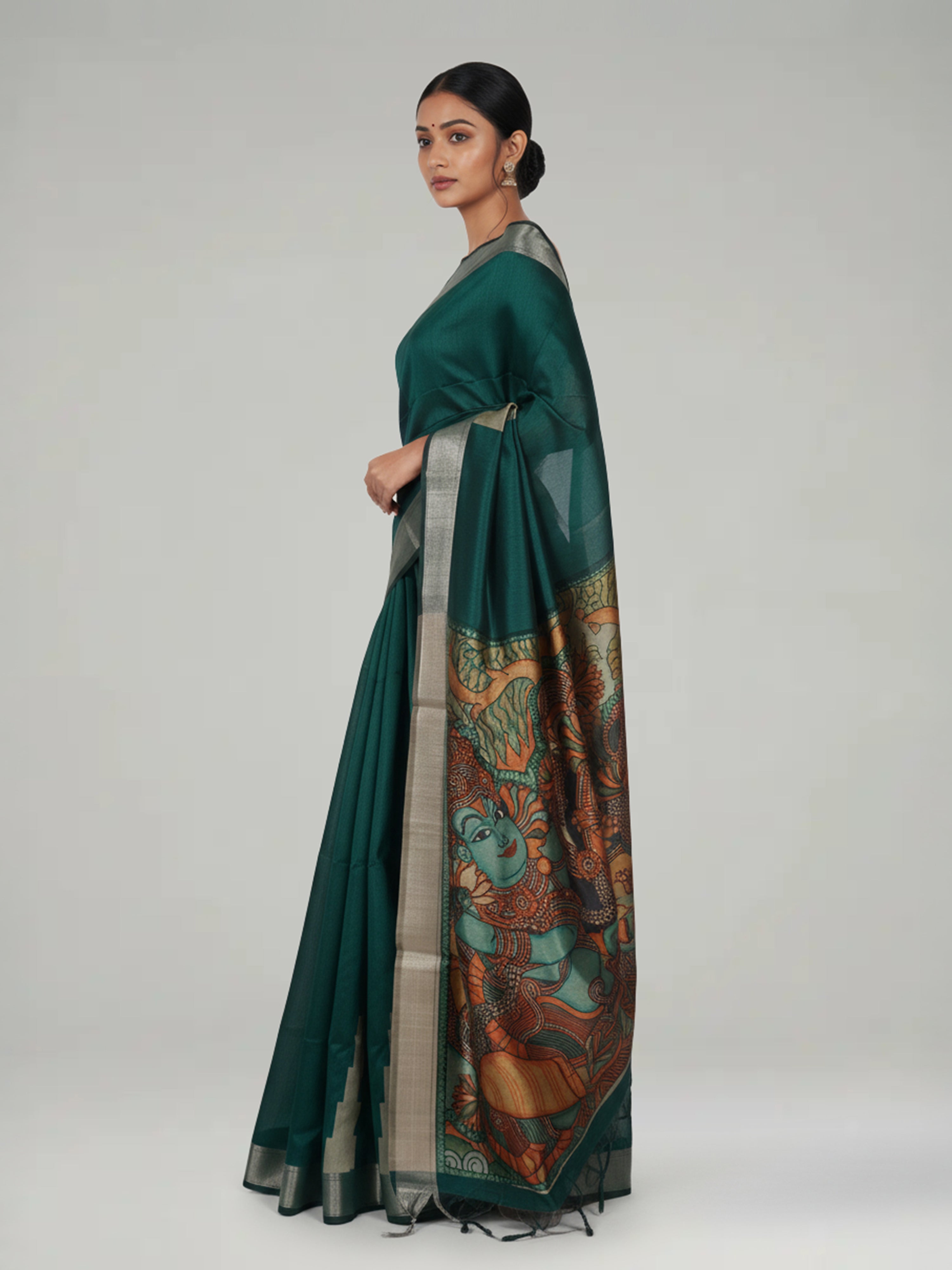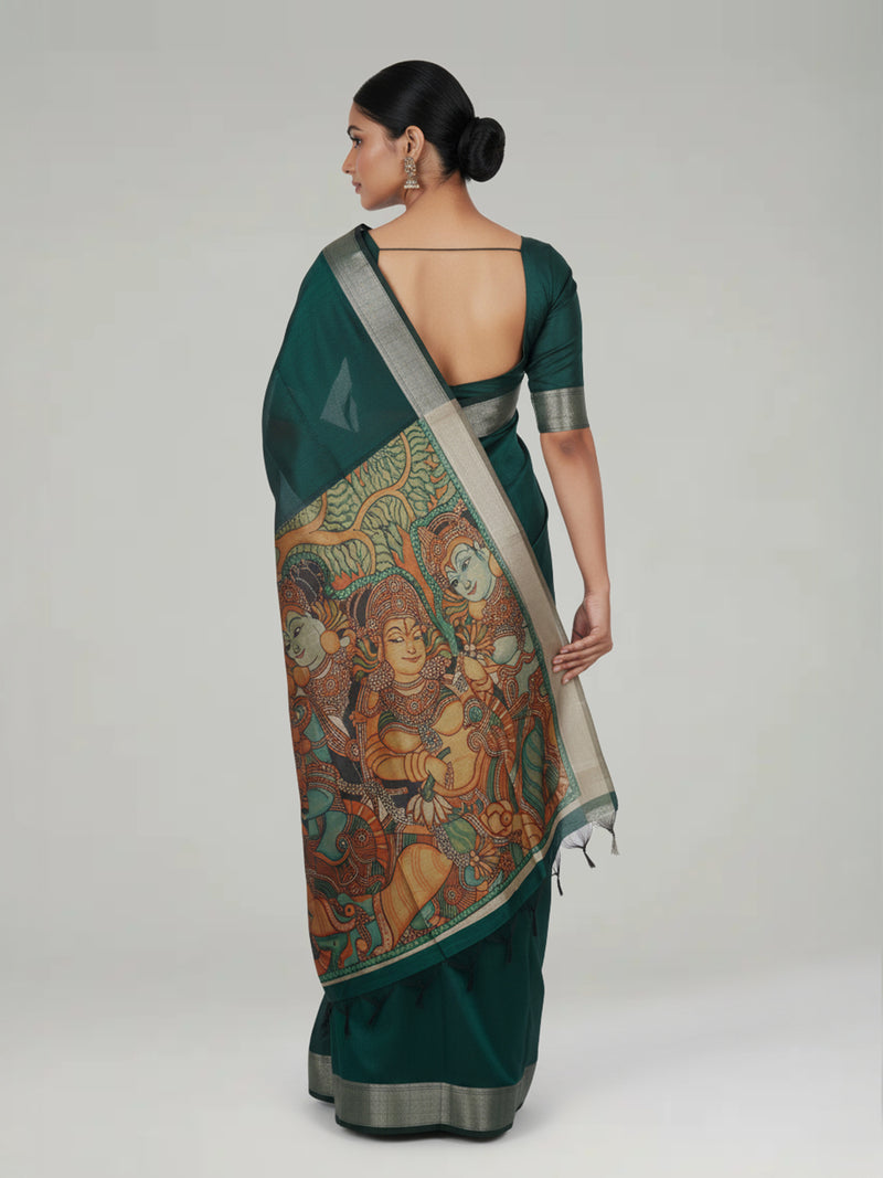 Bottle Green Mullai Semi Silk Saree with Hand-Painted Mythological Pallu