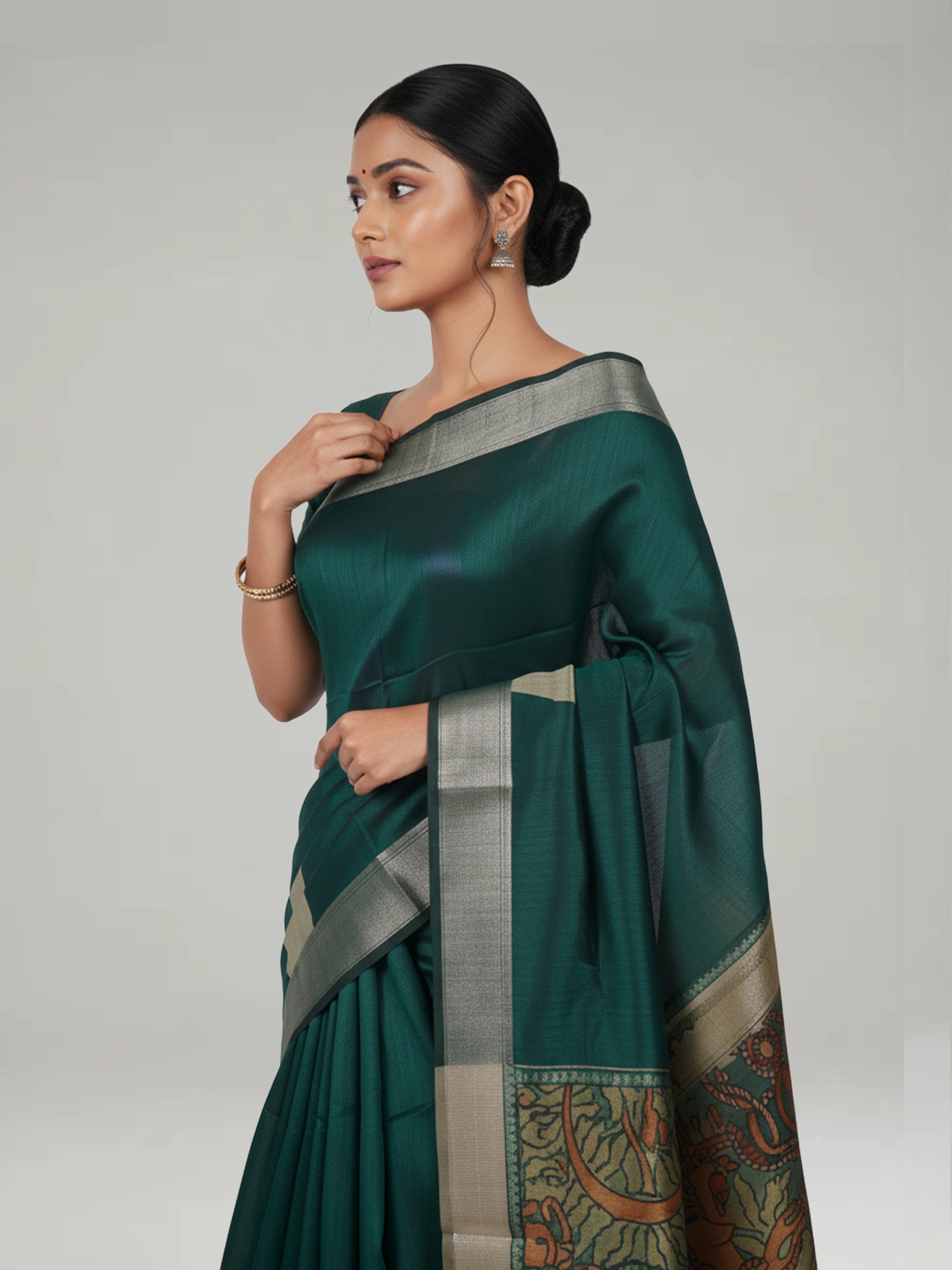 Experience timeless artistry with this elegant Bottle Green Mullai Semi Silk Saree, crafted to reflect the beauty of traditional Indian hand painting. The saree features a rich bottle-green body with a soft natural sheen and smooth texture, characteristic of premium mullai Semi silk. Its refined drape makes it both graceful and comfortable for extended wear.