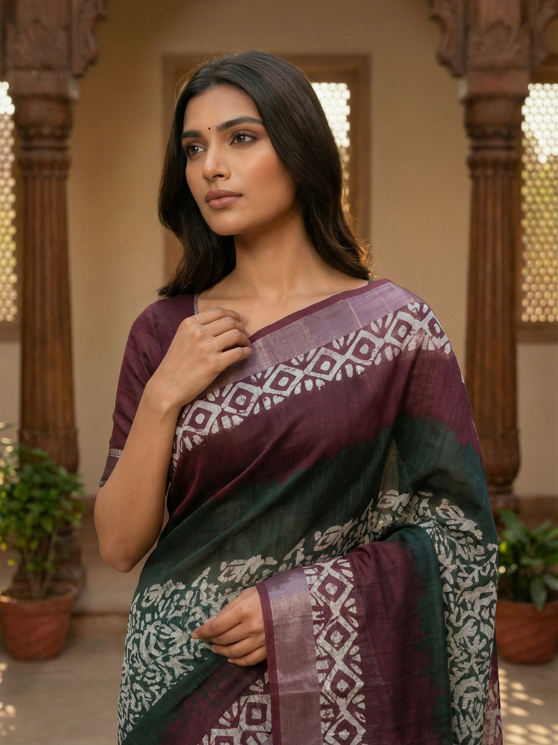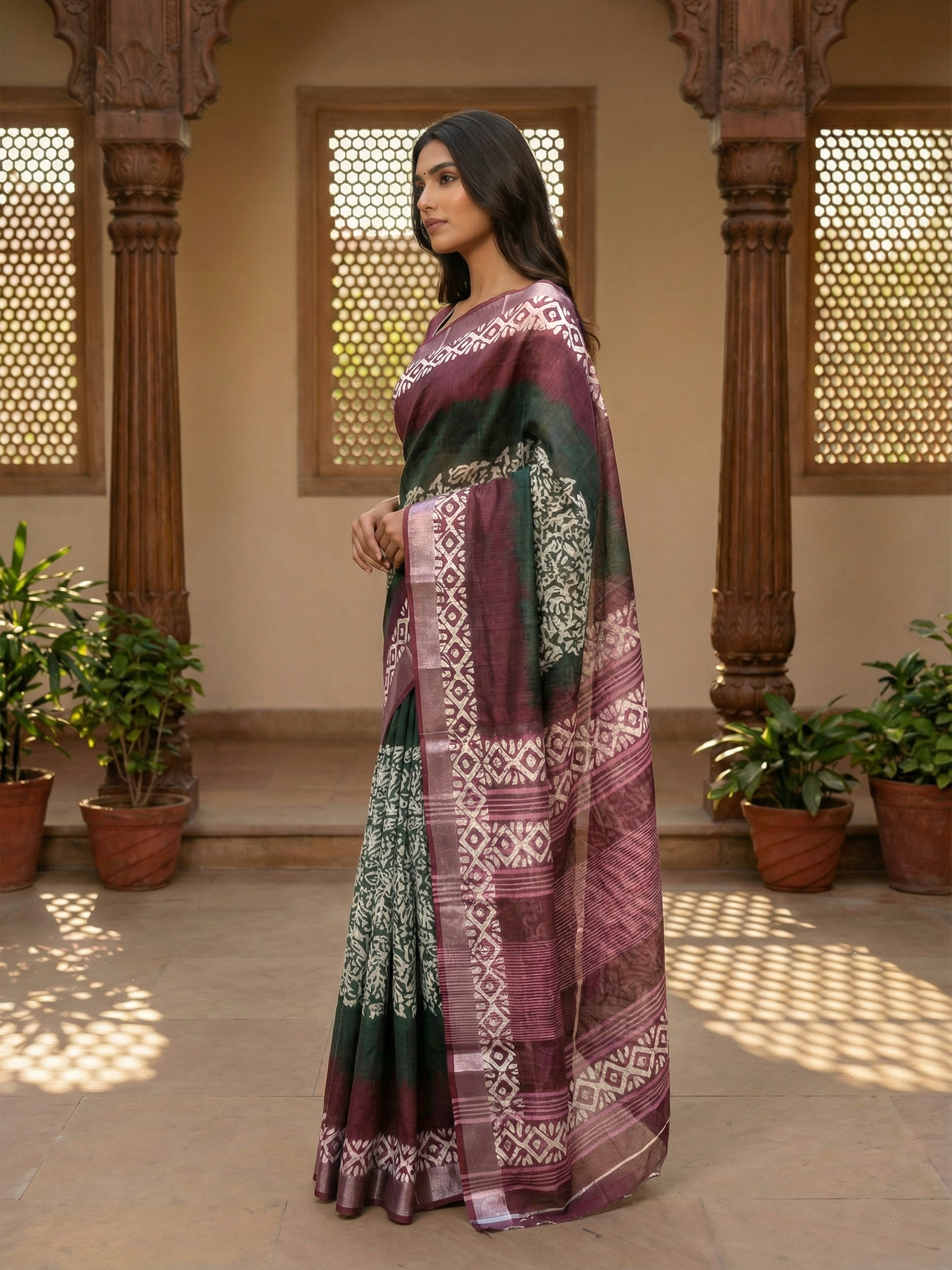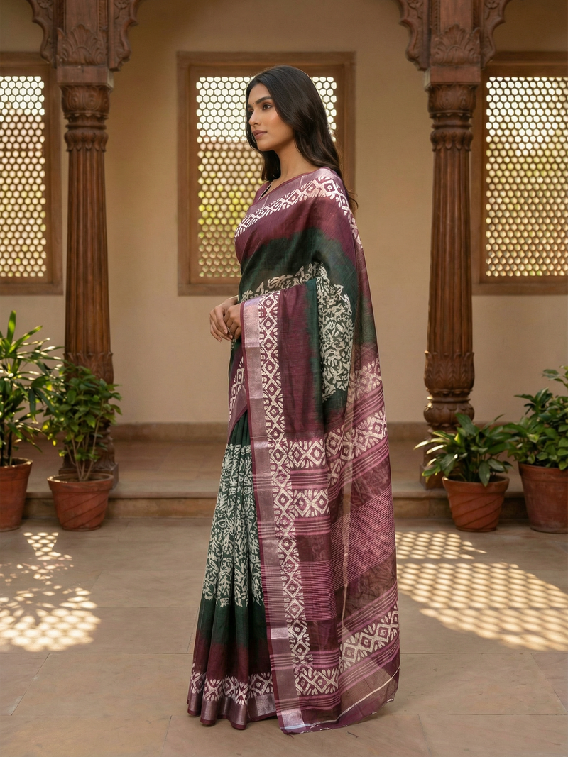 Elegant semi linen saree in bottle green and wine with batik print and Bavanji border for a chic contrast look.