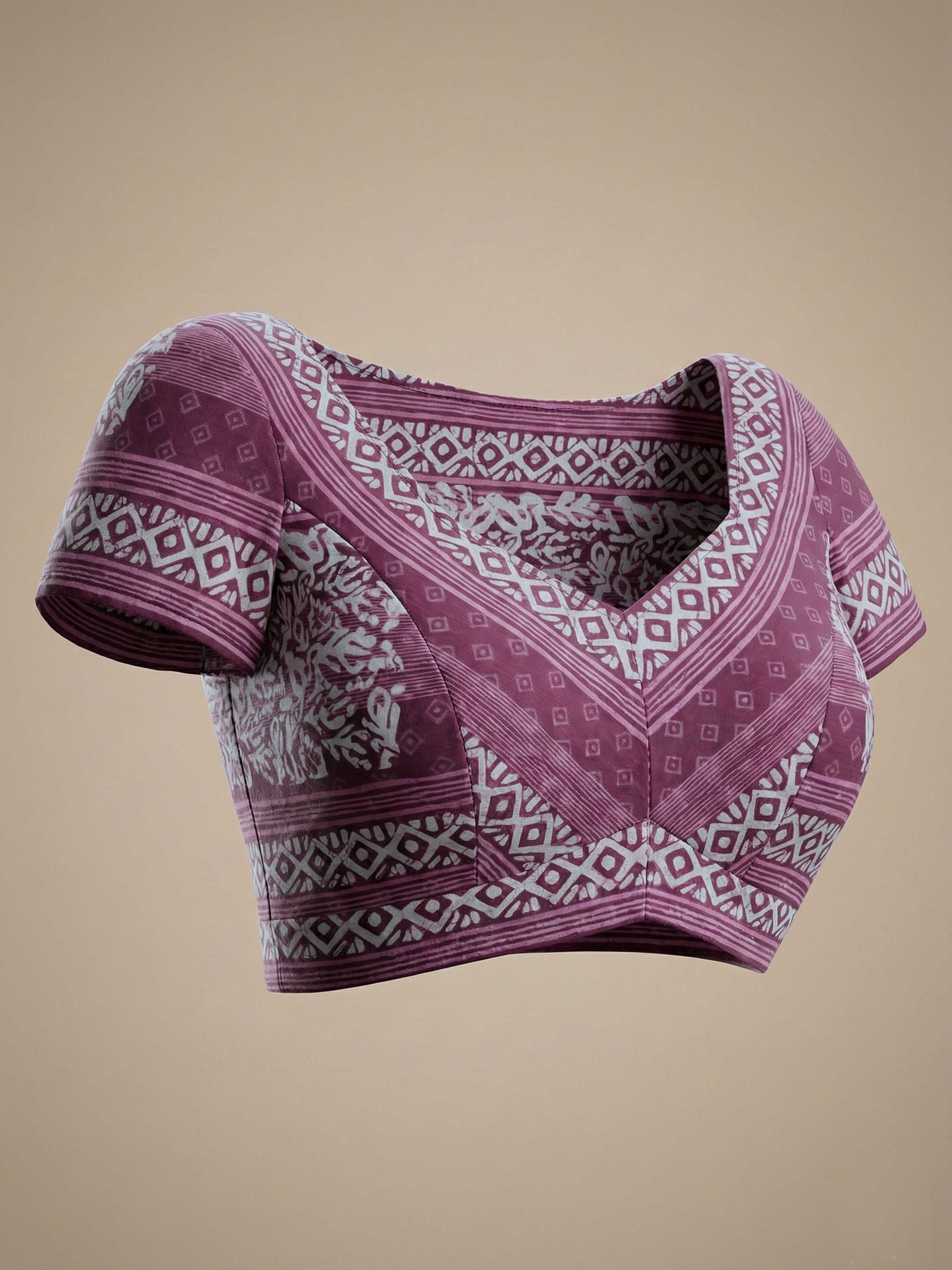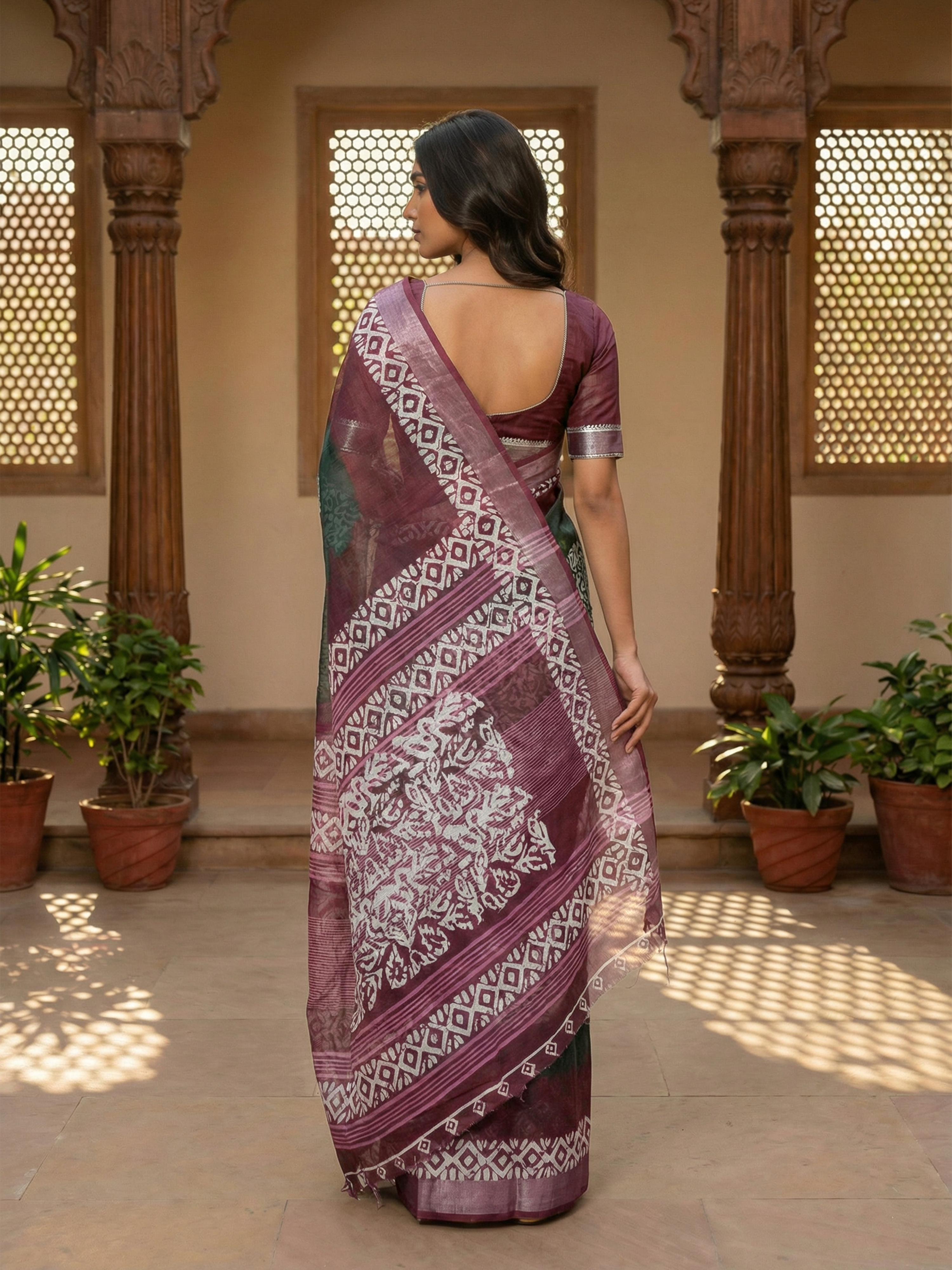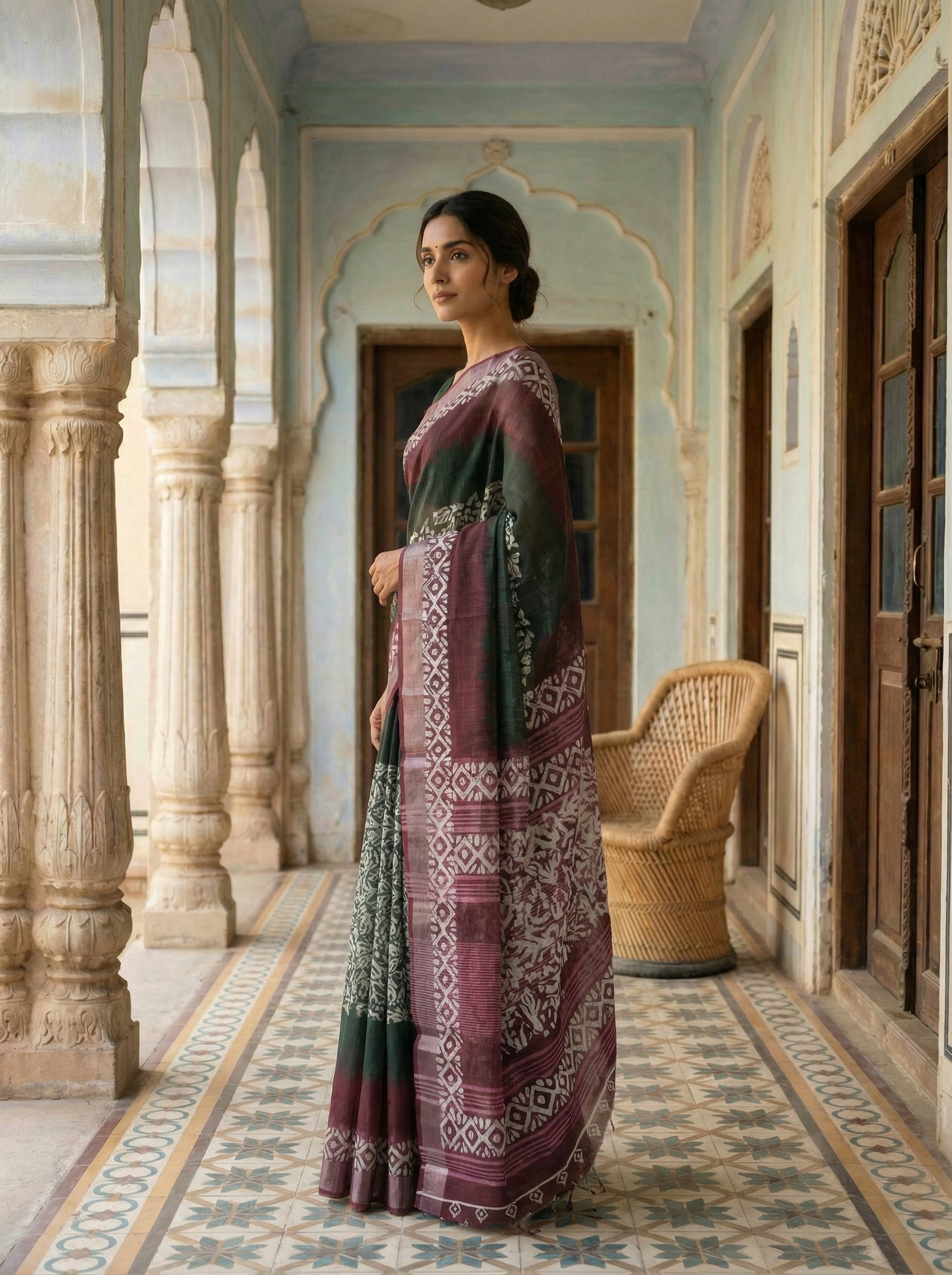 Elegant semi linen saree in bottle green and wine with batik print and Bavanji border for a chic contrast look.