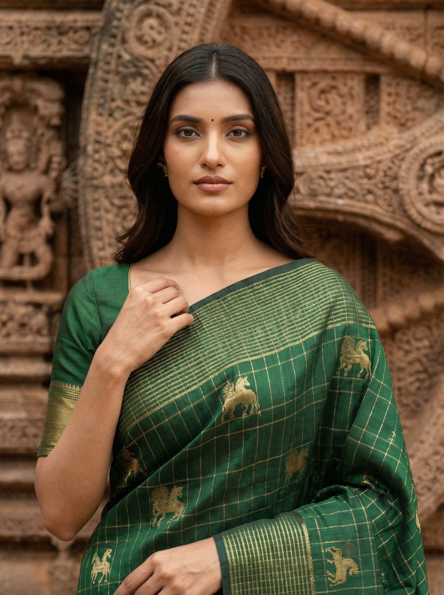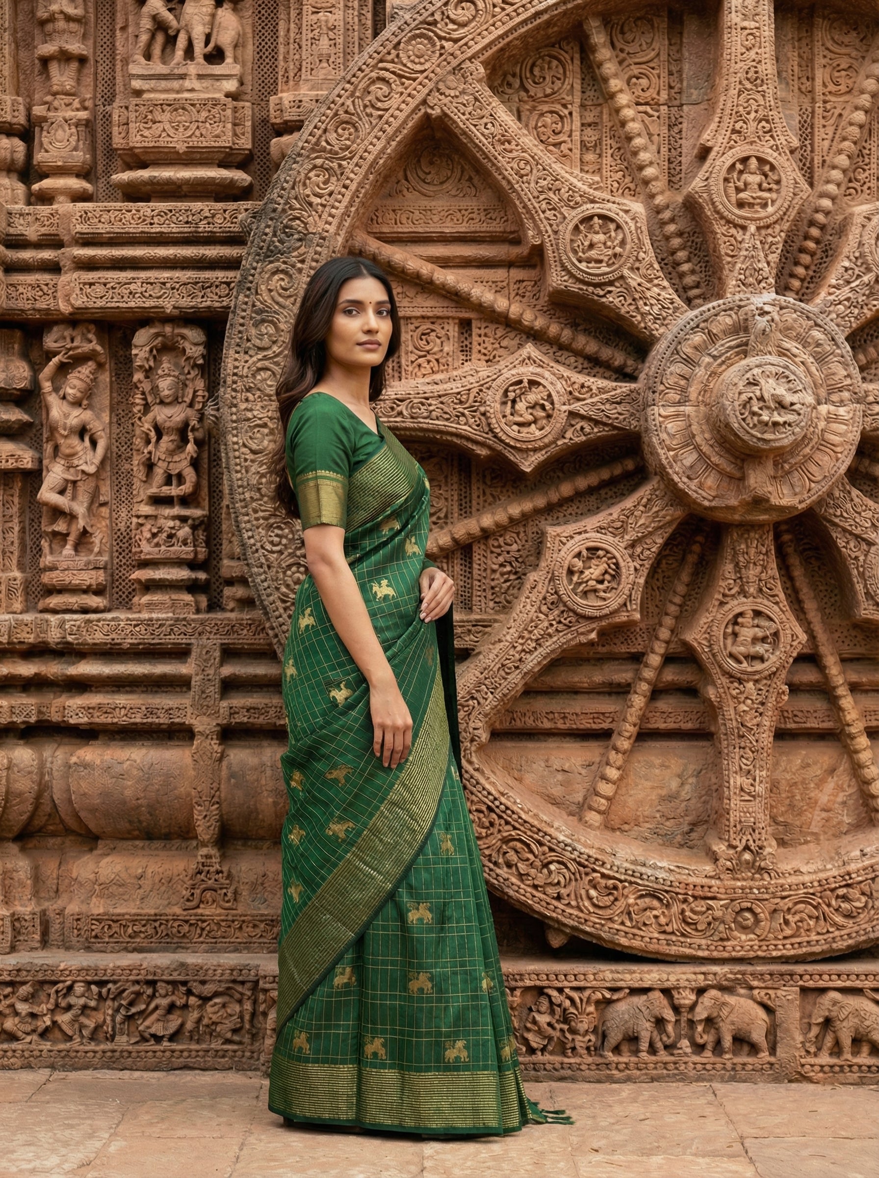 Classic bottle green Kanchipuram silk saree enhanced with antique golden zari lines, exuding refined tradition and grandeur.