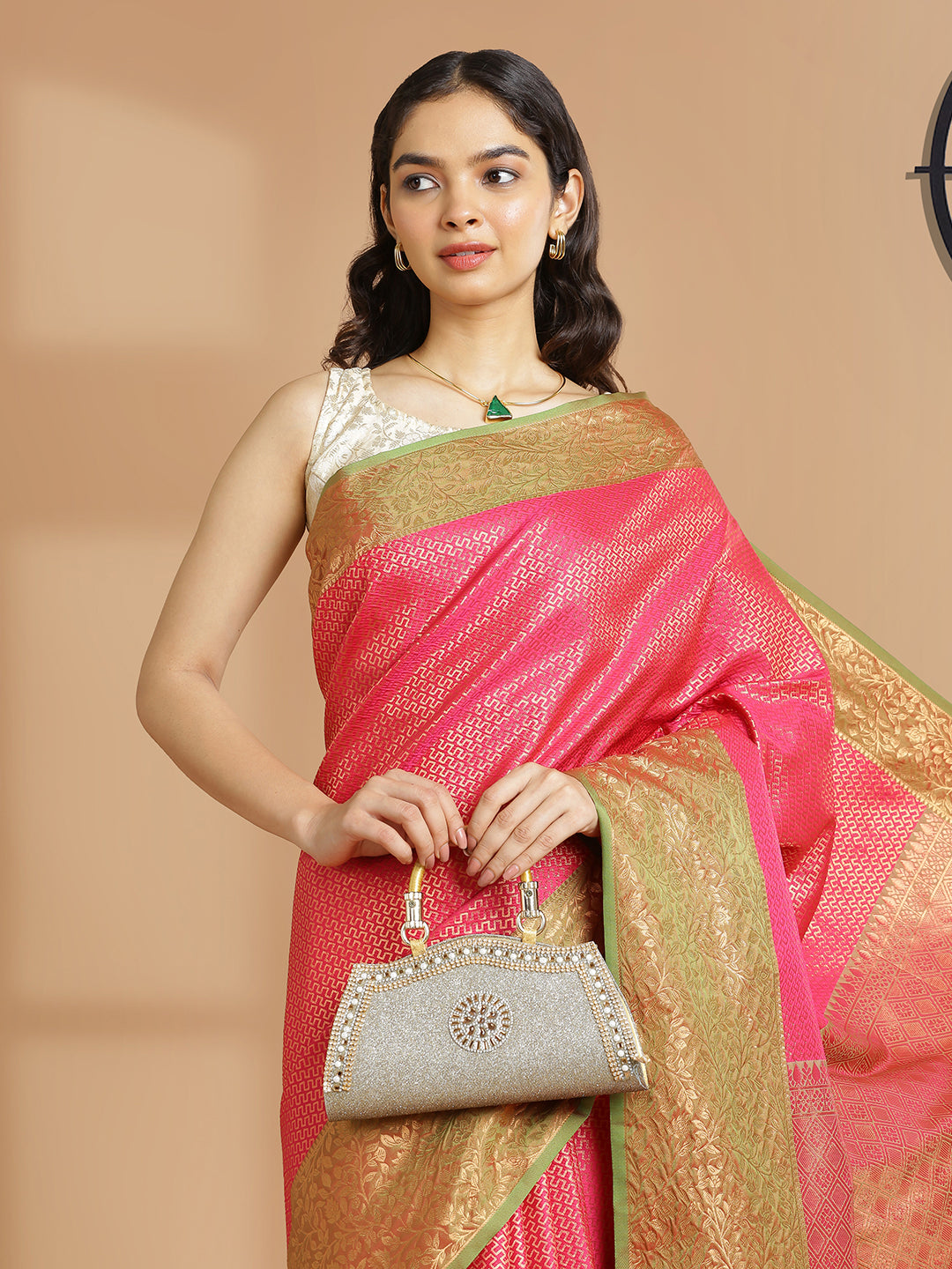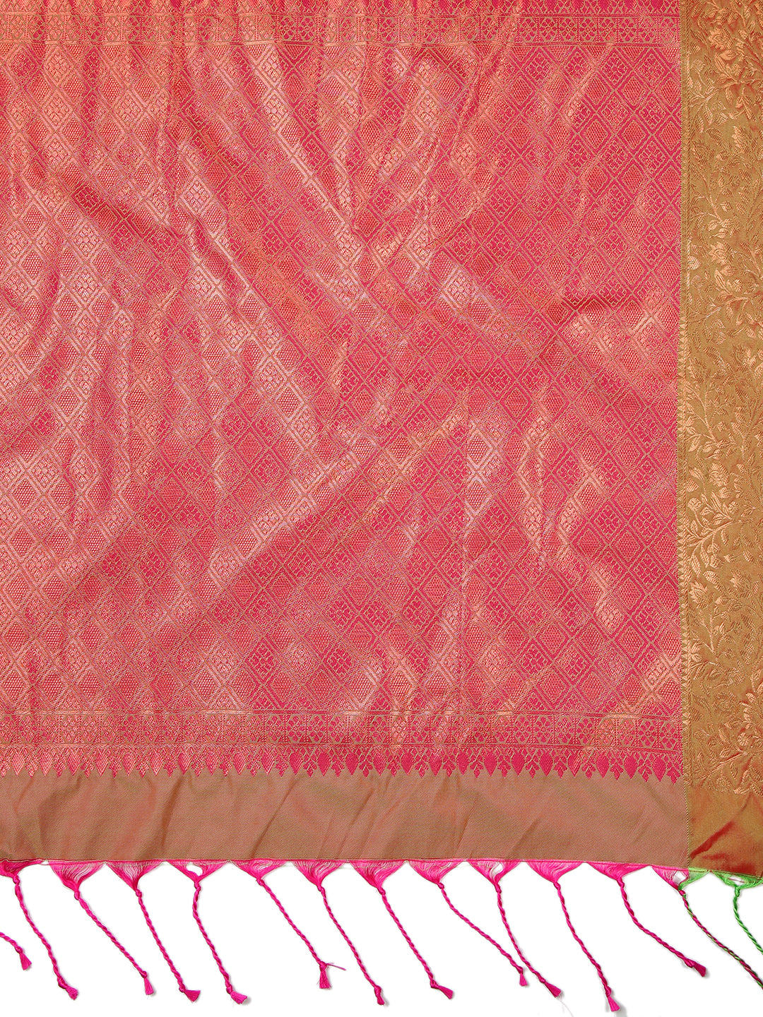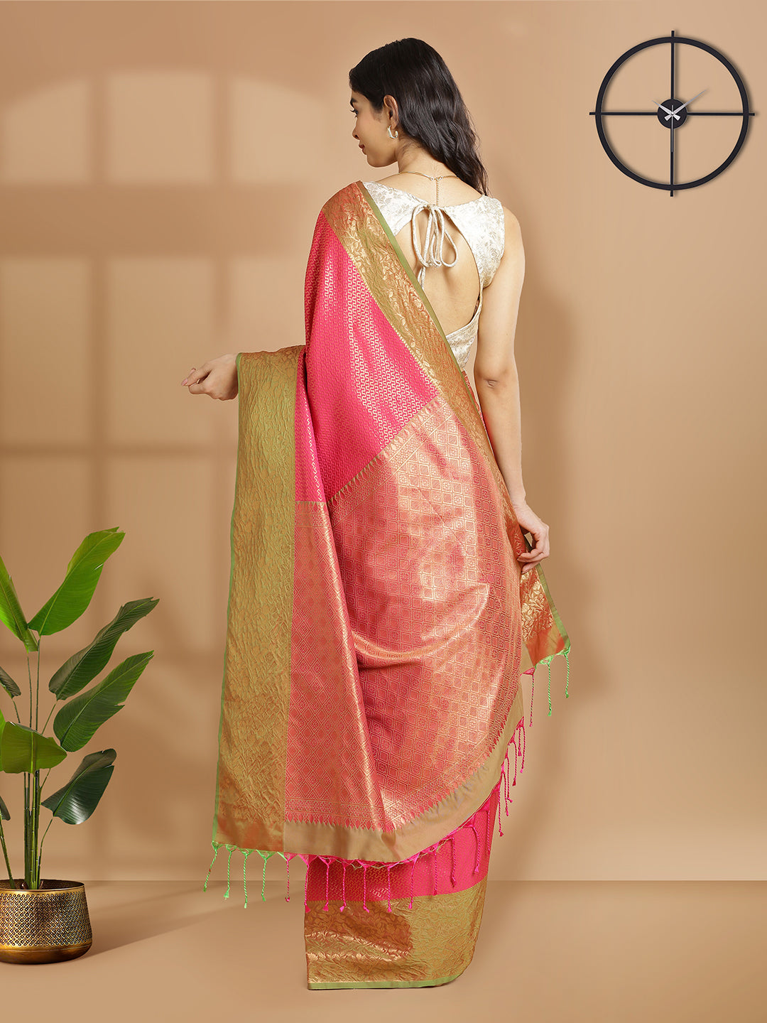 Bright Pink Waved Zari Designed Saree With Olive Green Border