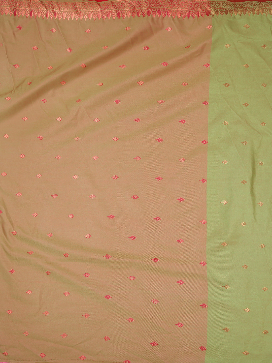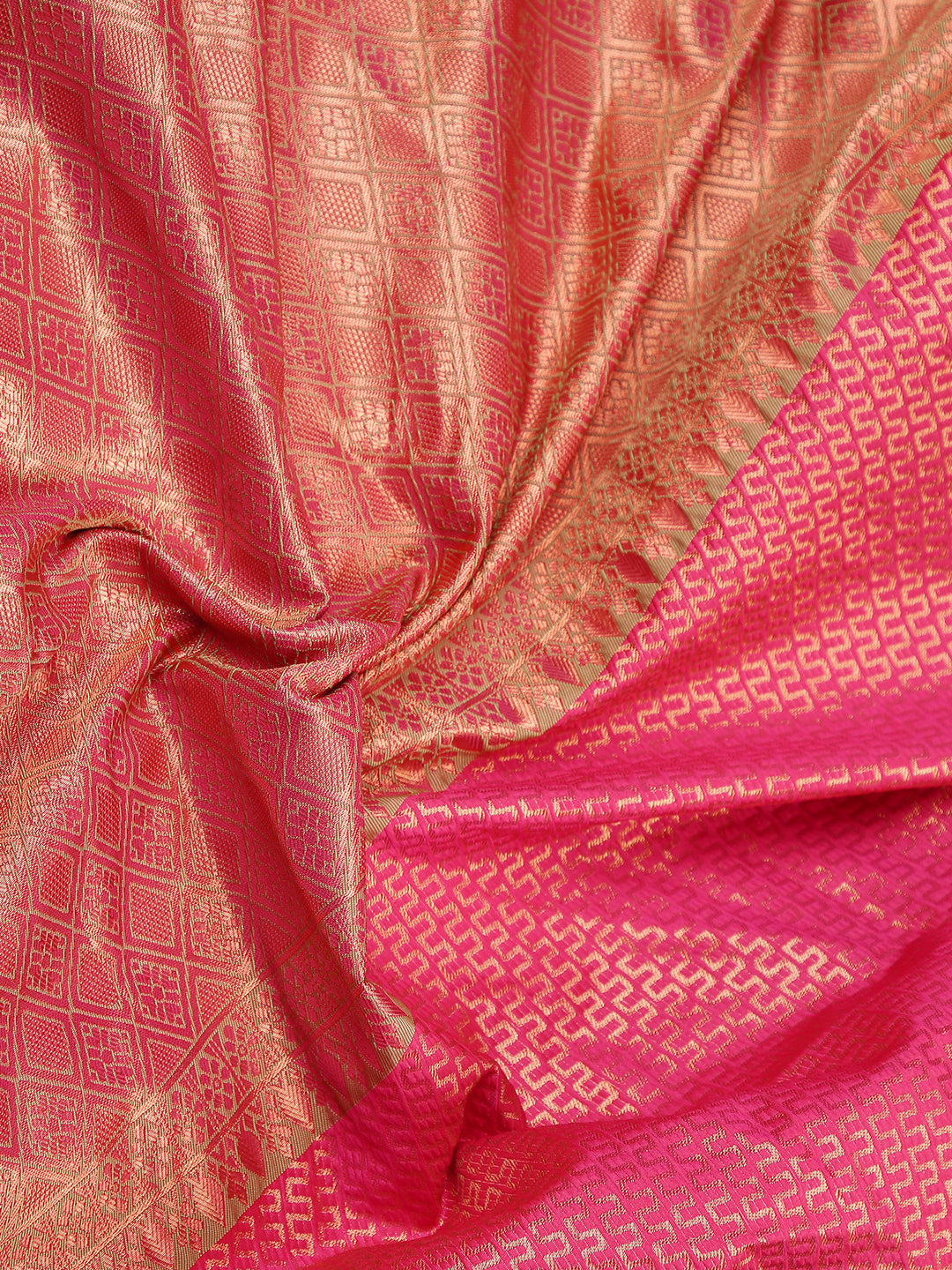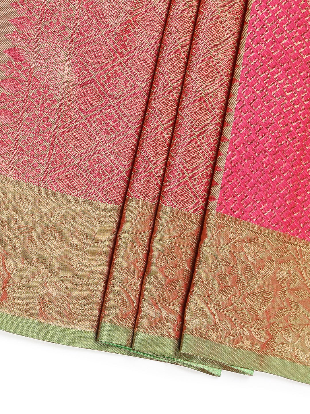 Bright Pink Waved Zari Designed Saree With Olive Green Border