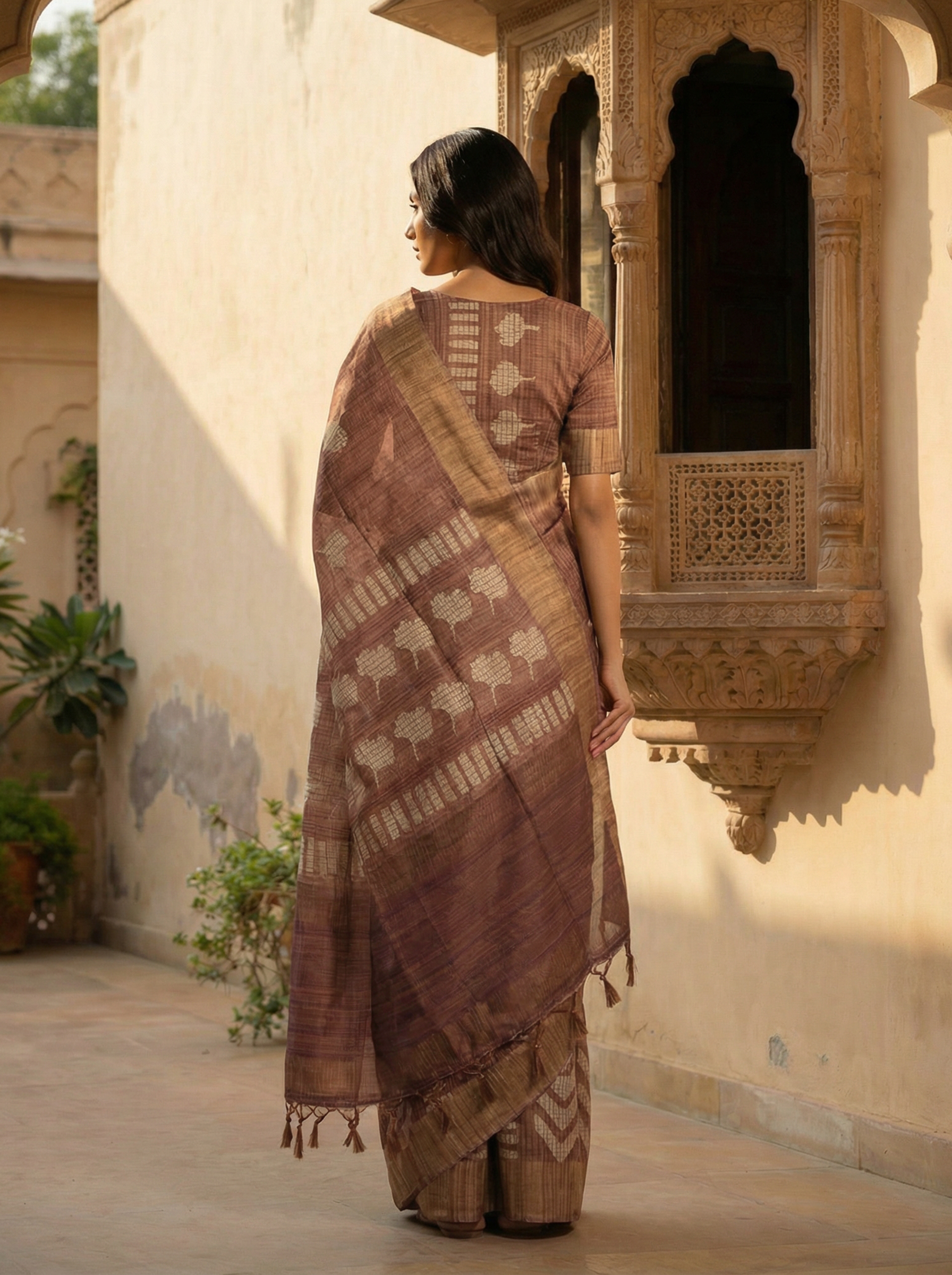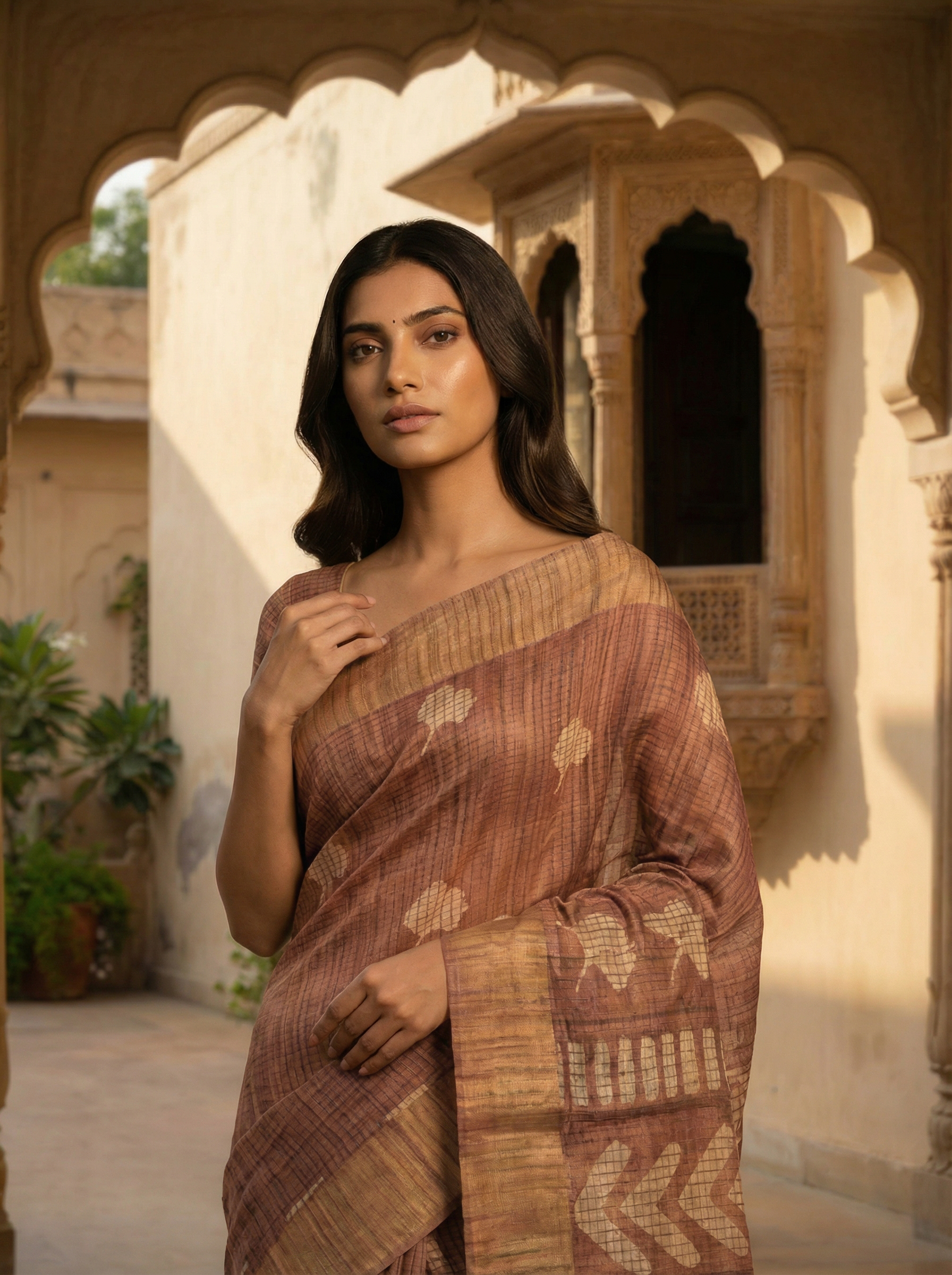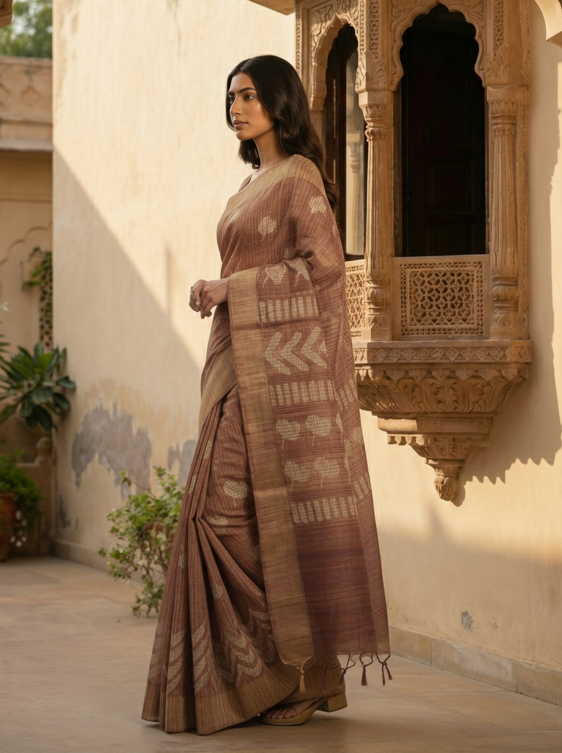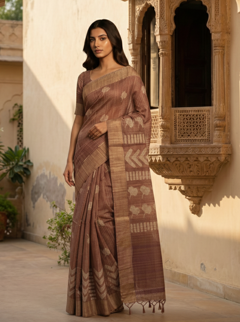 This elegant Tussar Silk Saree is crafted in warm earthy brown tones, offering a perfect balance of simplicity and sophistication. The saree features delicately woven leaf motifs spread gracefully across the body, complemented by subtle linear textures that enhance its natural charm.