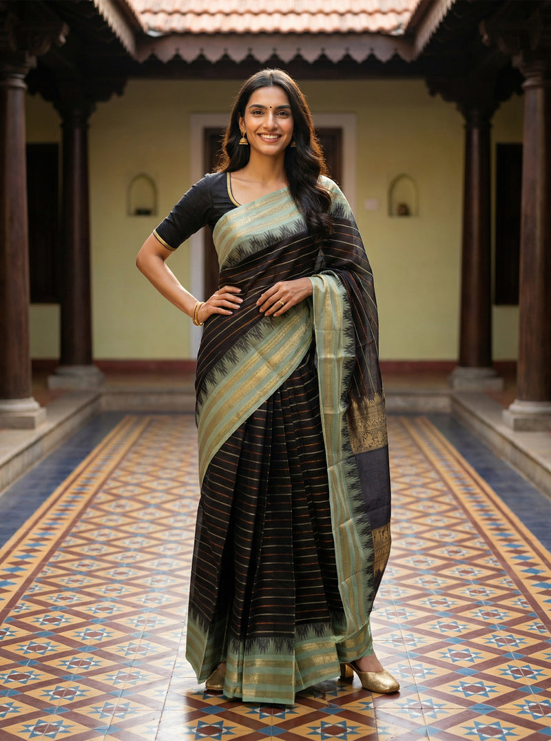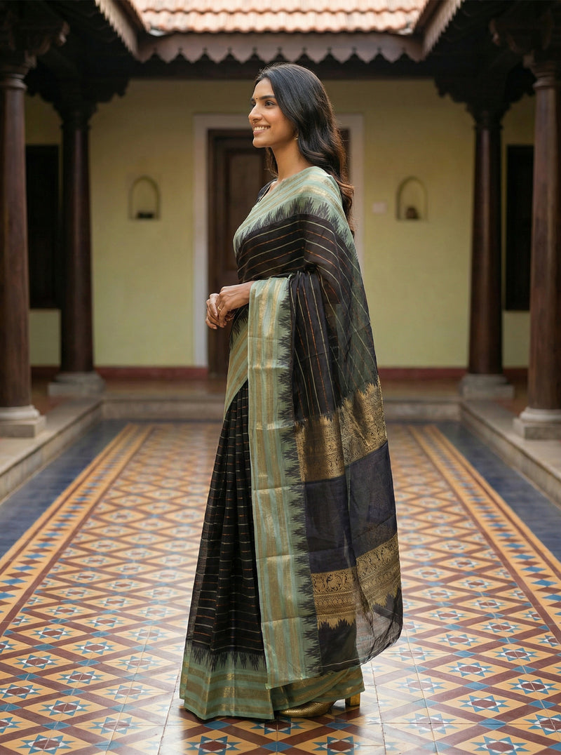 Cotton Green and Black Handloom Style Saree with Antique Gold Weave