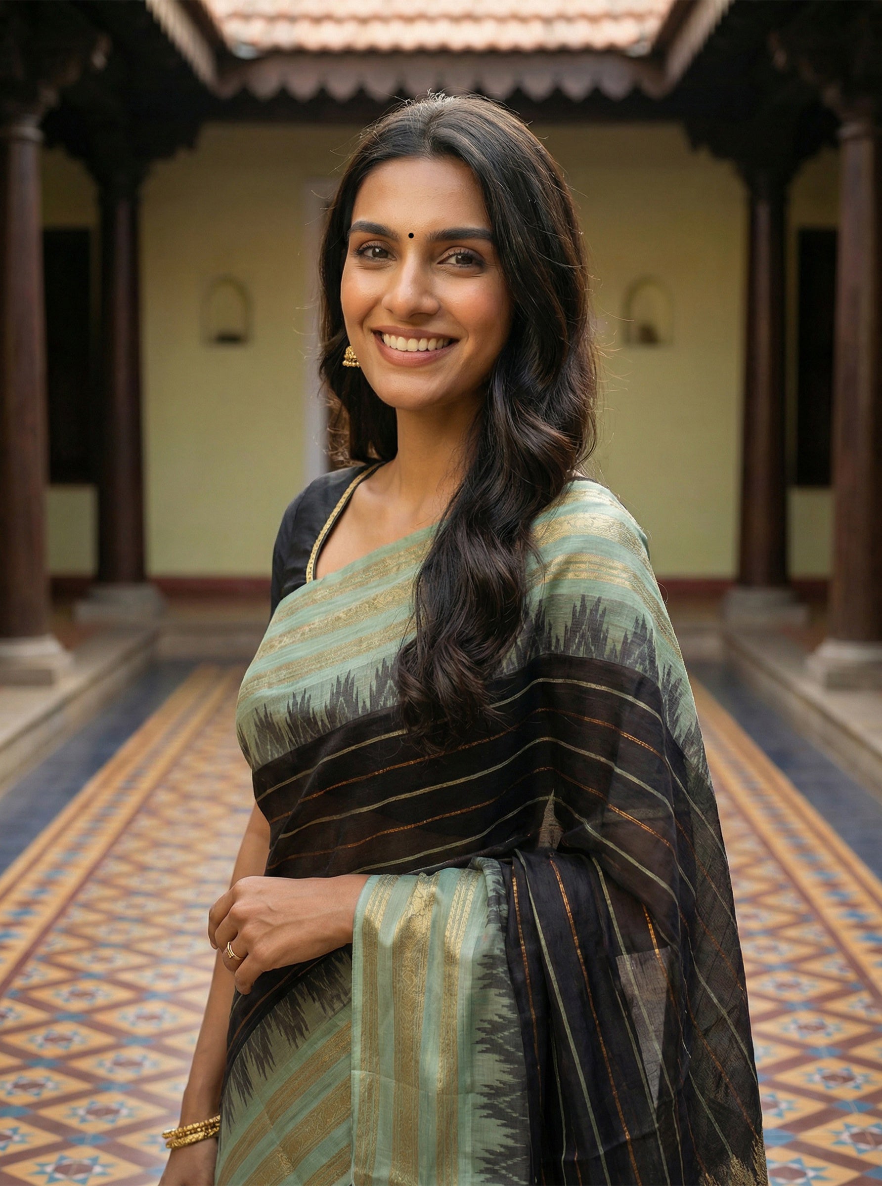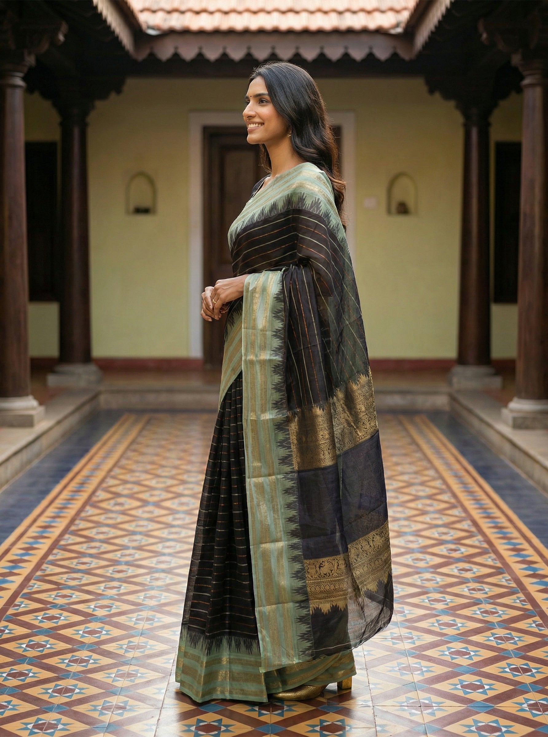 Drape yourself in timeless elegance with this stunning cotton saree, expertly crafted in a handloom style that celebrates traditional weaving techniques. The rich combination of deep green and black creates a sophisticated palette, while delicate antique gold weaving adds an ornate touch perfect for festive occasions and celebrations. Made from breathable cotton, this saree offers comfort without compromising on style. The intricate handloom detailing ensures each piece carries its own unique character, making it a versatile addition to your ethnic wardrobe. Ideal for weddings, festivals, and special gatherings where you want to make a graceful impression.