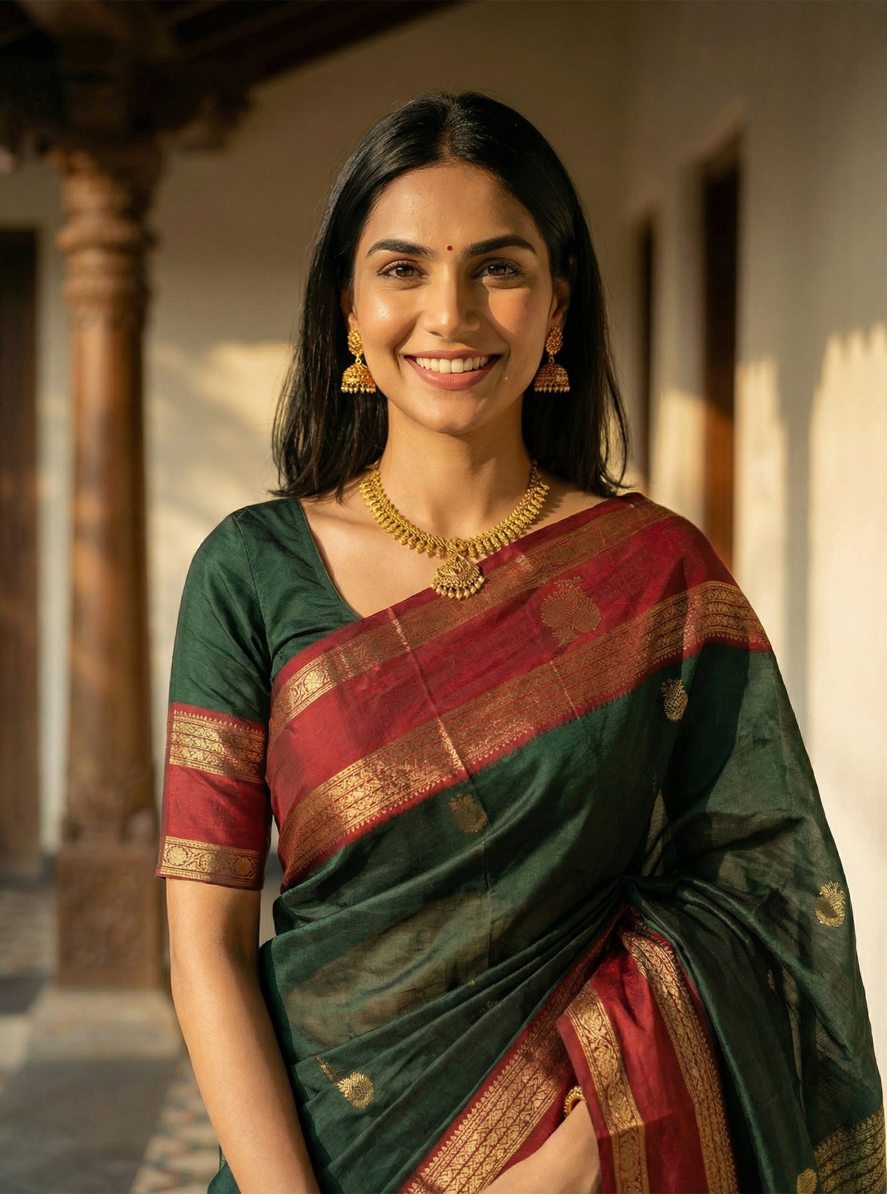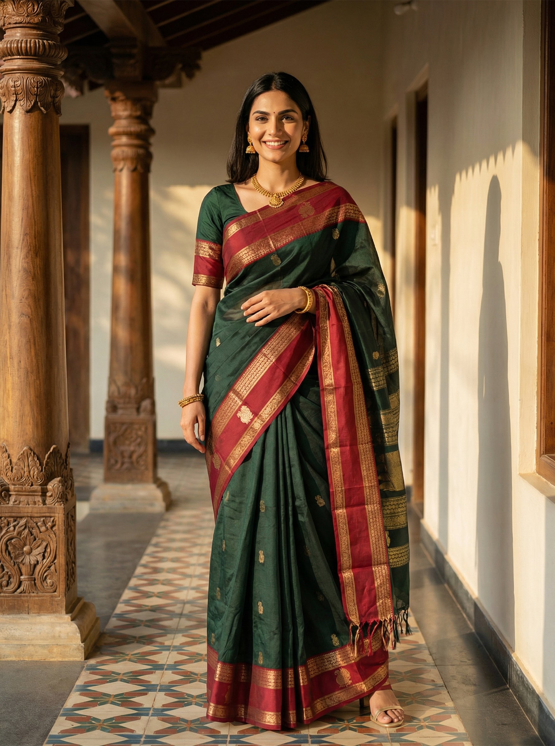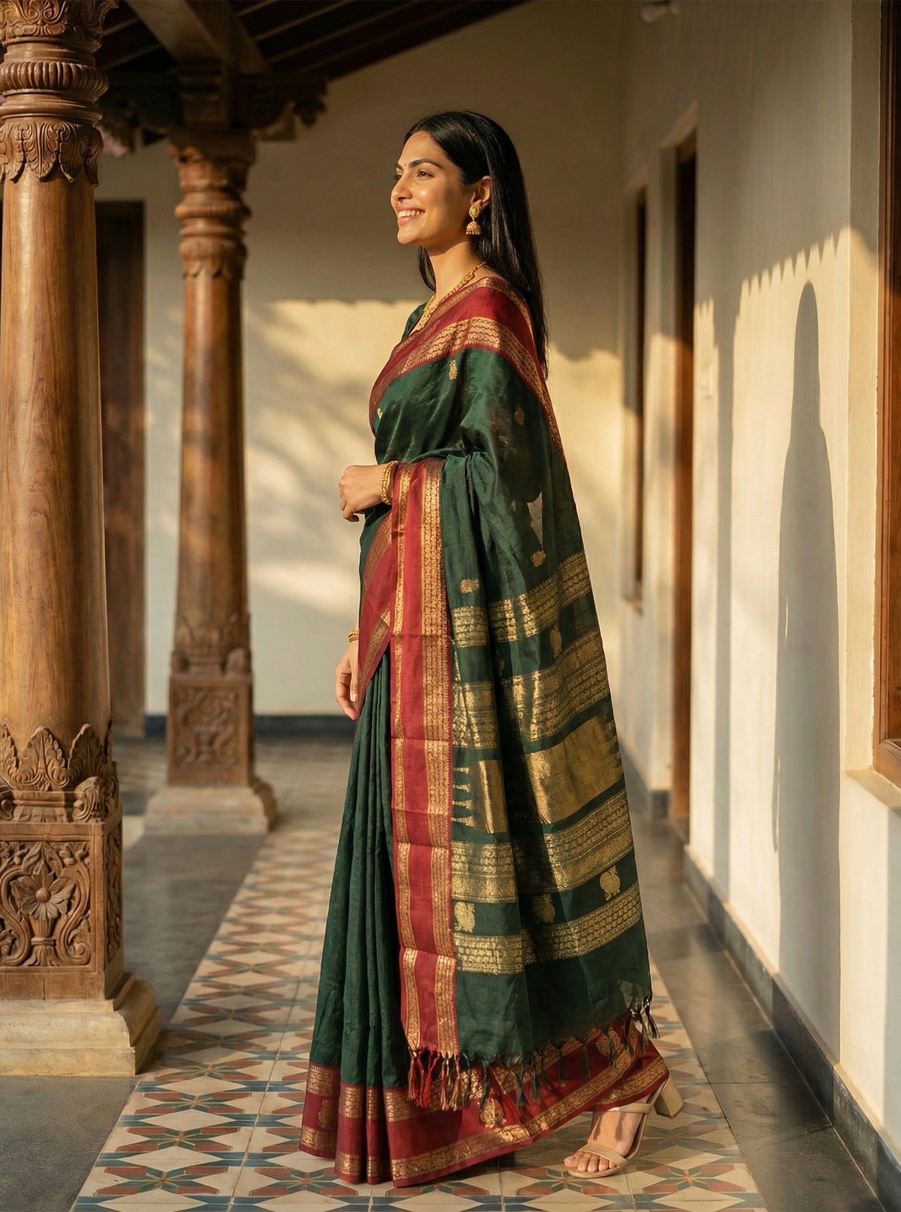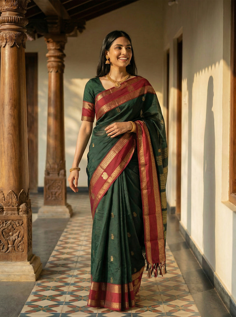 Cotton Green and Red Festive Saree with Antique Gold Weave