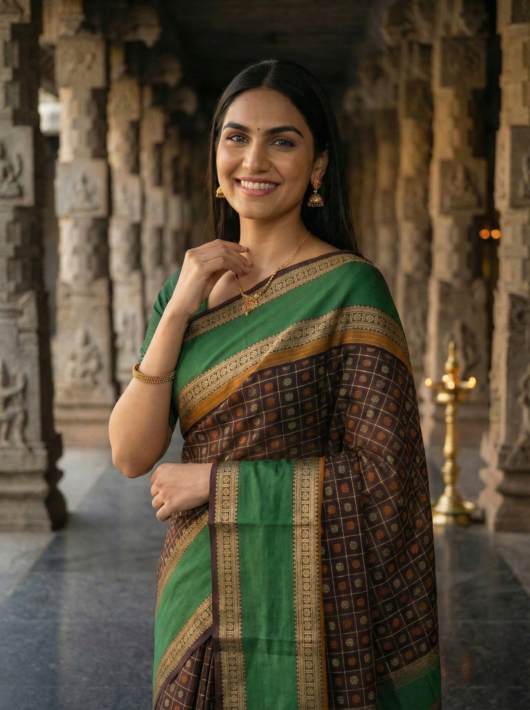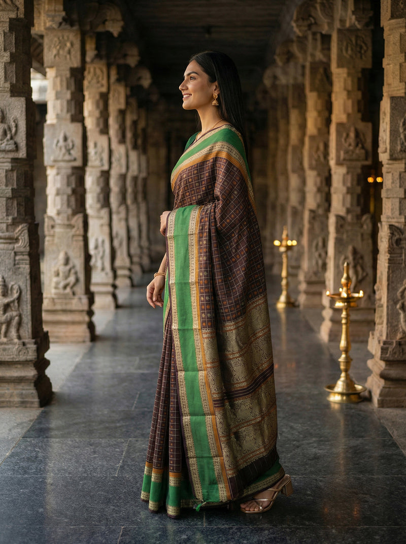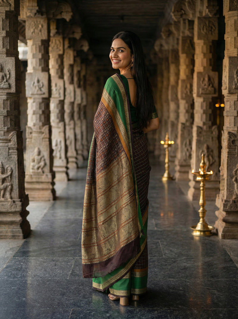 Experience timeless grace with this chocolate brown cotton silk saree, featuring an elegant checked weave that exudes understated sophistication. The ornate zari border adds a regal finish, making it an ideal choice for weddings, festivals, and special celebrations. The cotton-silk blend ensures comfort and breathability while maintaining a graceful drape, giving you the best of both natural fibers. A versatile investment piece that complements traditional and contemporary styling with equal poise.