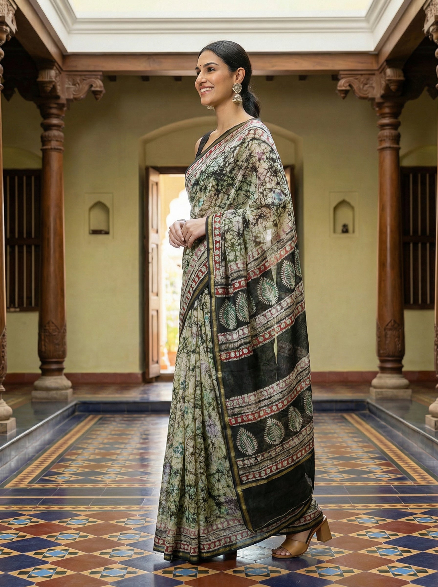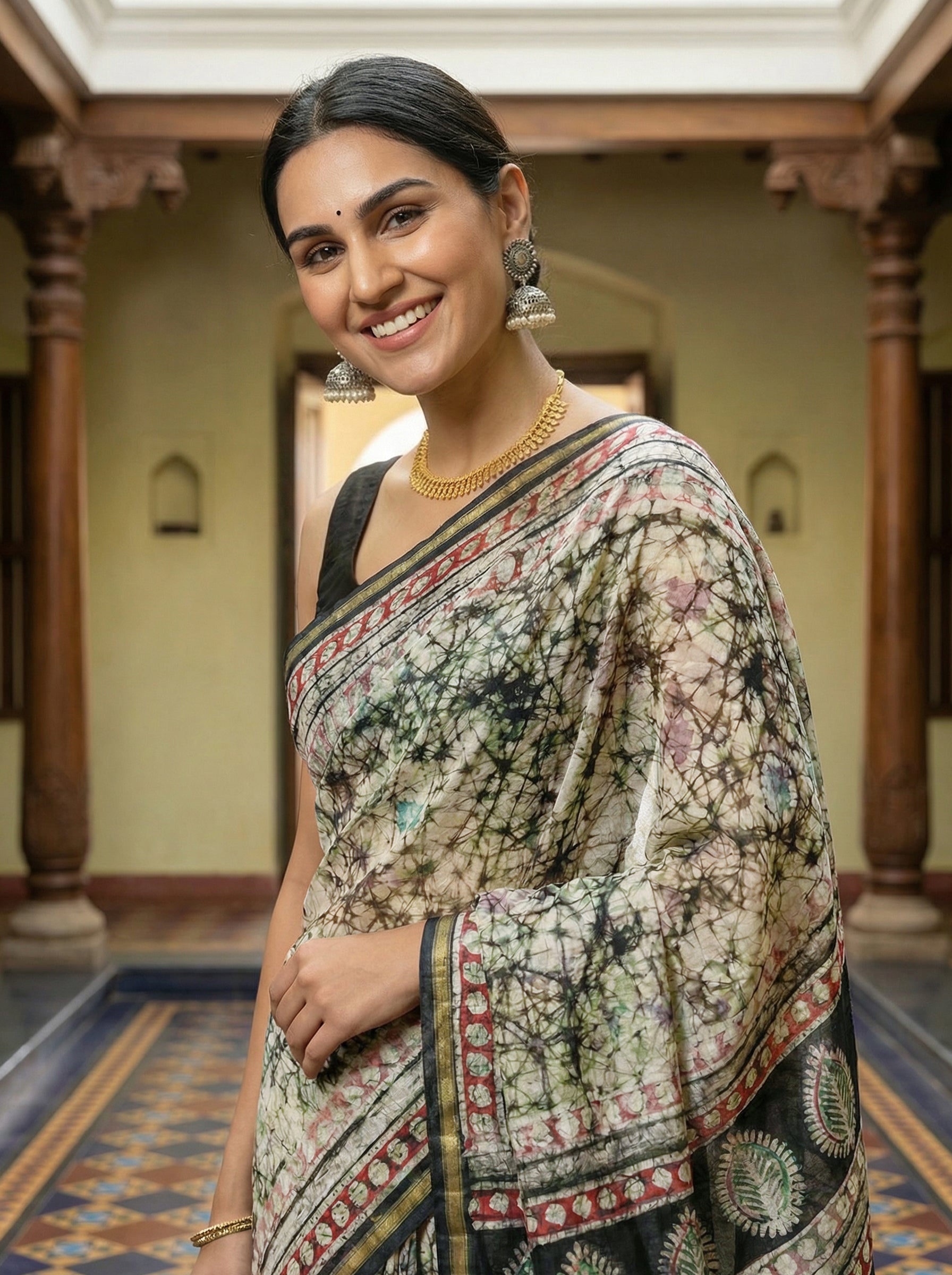 Embrace timeless elegance with this cotton saree, crafted in a soft cream tone and adorned with intricate artistic batik patterns. The traditional design celebrates heritage craftsmanship while the breathable cotton fabric ensures comfort for all-day wear. Perfect for festivals, celebrations, or everyday occasions, this saree combines classic beauty with practical comfort. The artistic batik work adds a unique, handcrafted appeal that stands out from mass-produced pieces. Ideal for those who appreciate authentic Indian textiles and traditional styling.