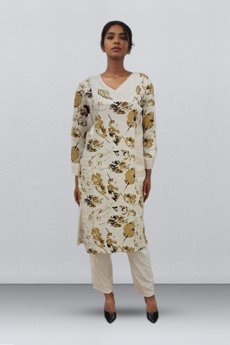 Cream Color Cotton 3/4th Sleeve Kurti With Printed Design