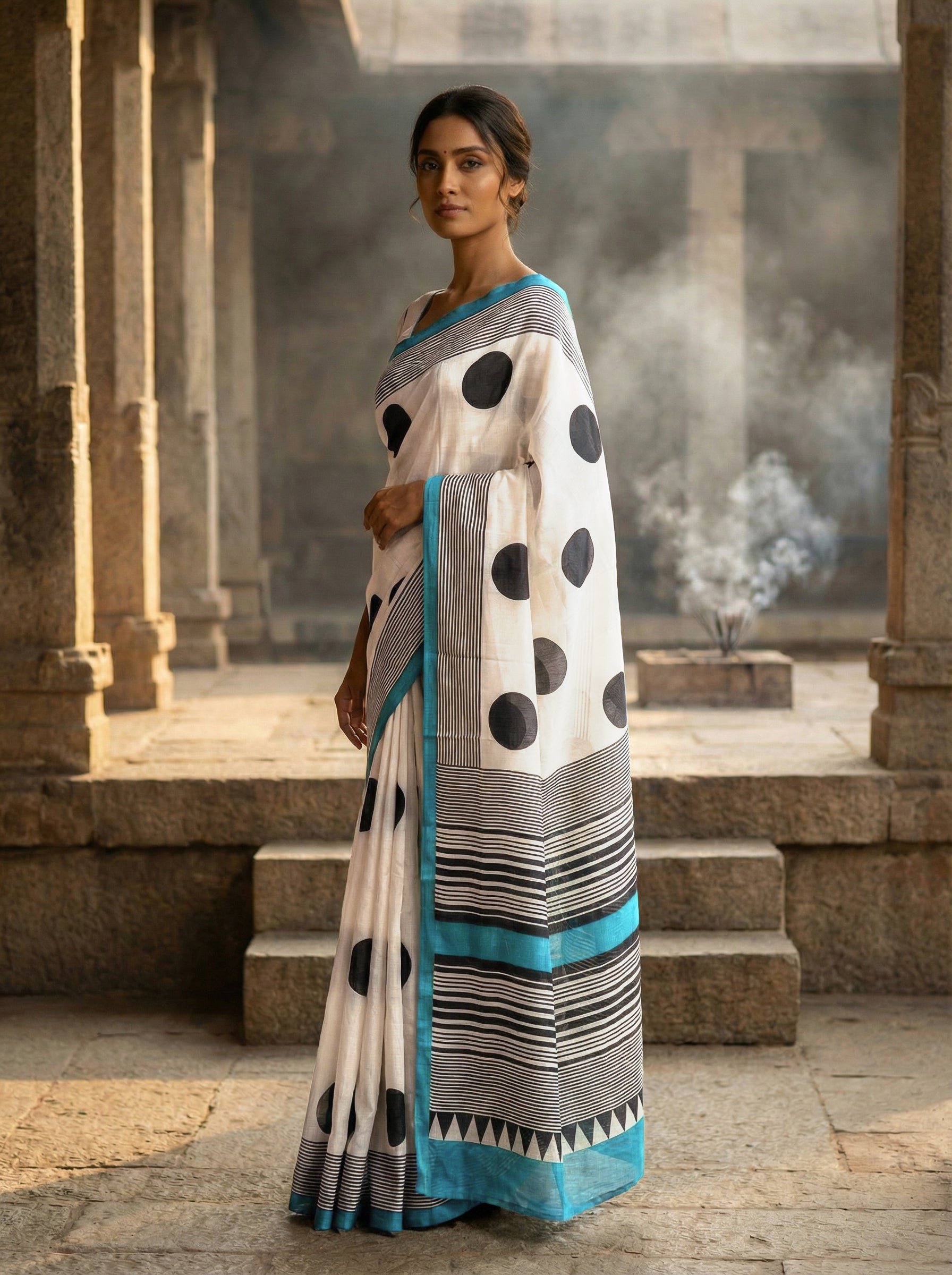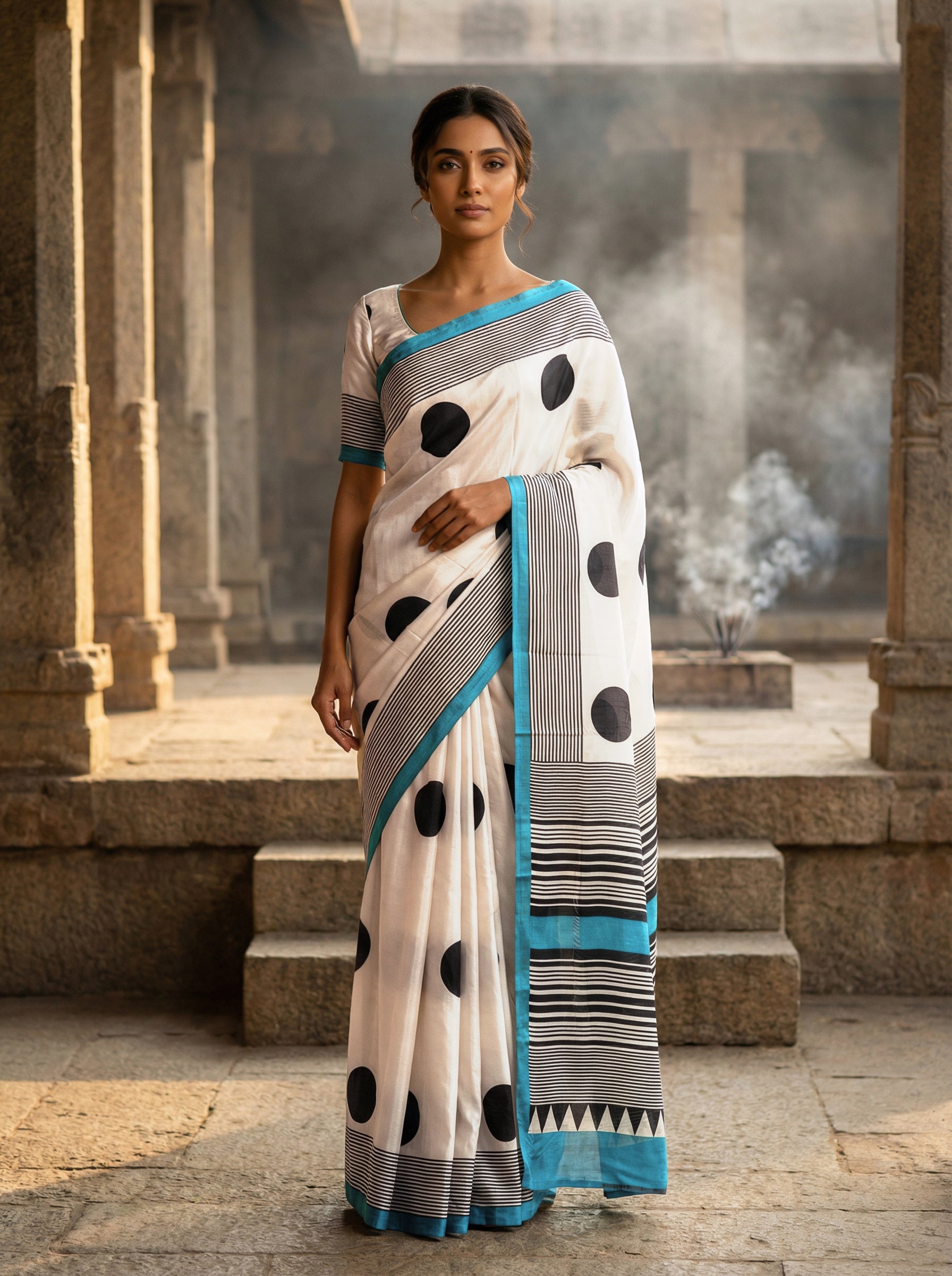 Add a touch of contemporary elegance to your wardrobe with this stylish polyester saree designed for effortless grace. The soft cream base is beautifully highlighted with bold black polka dot prints, creating a chic and modern appeal. Complemented by a striking striped border and pallu in black and teal tones, this saree stands out with its smart color contrast and geometric detailing.
