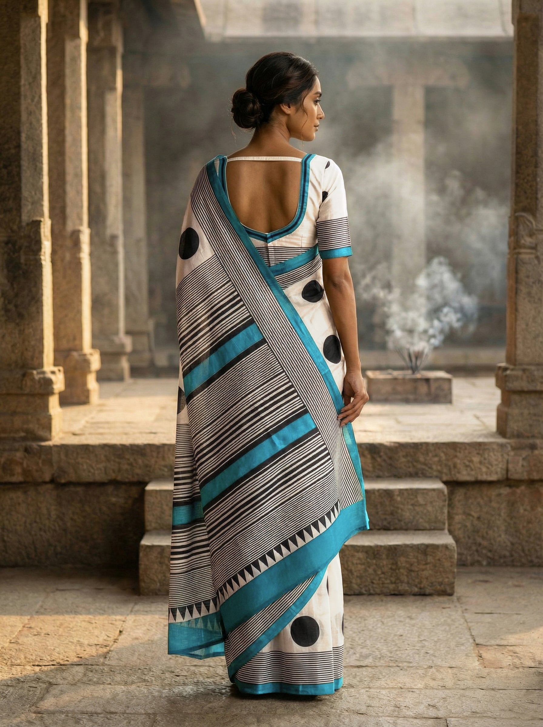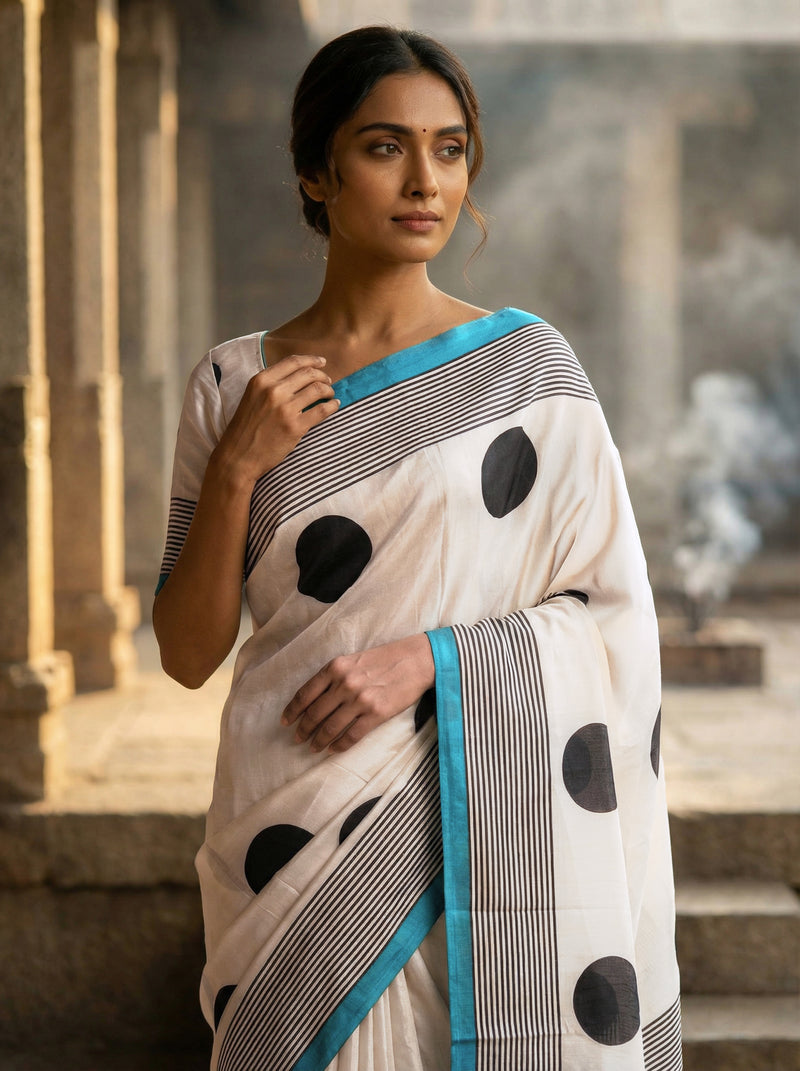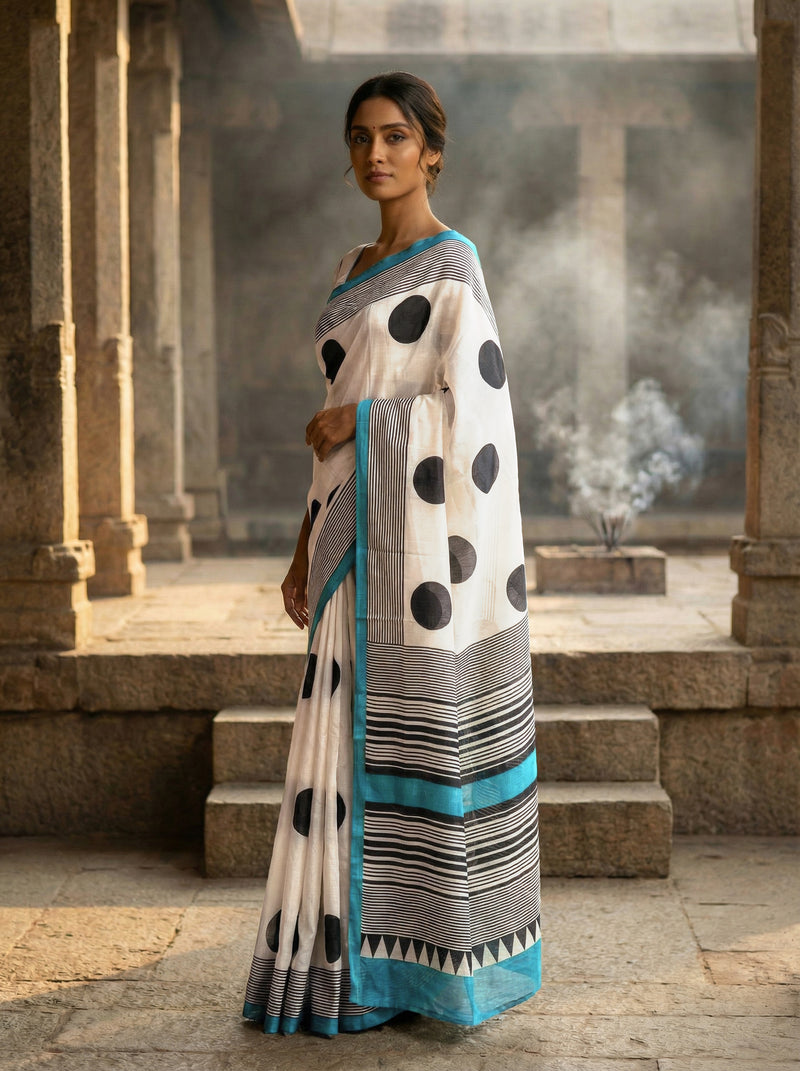 Cream & Teal Saree with Polka Dot Print and Striped Pallu