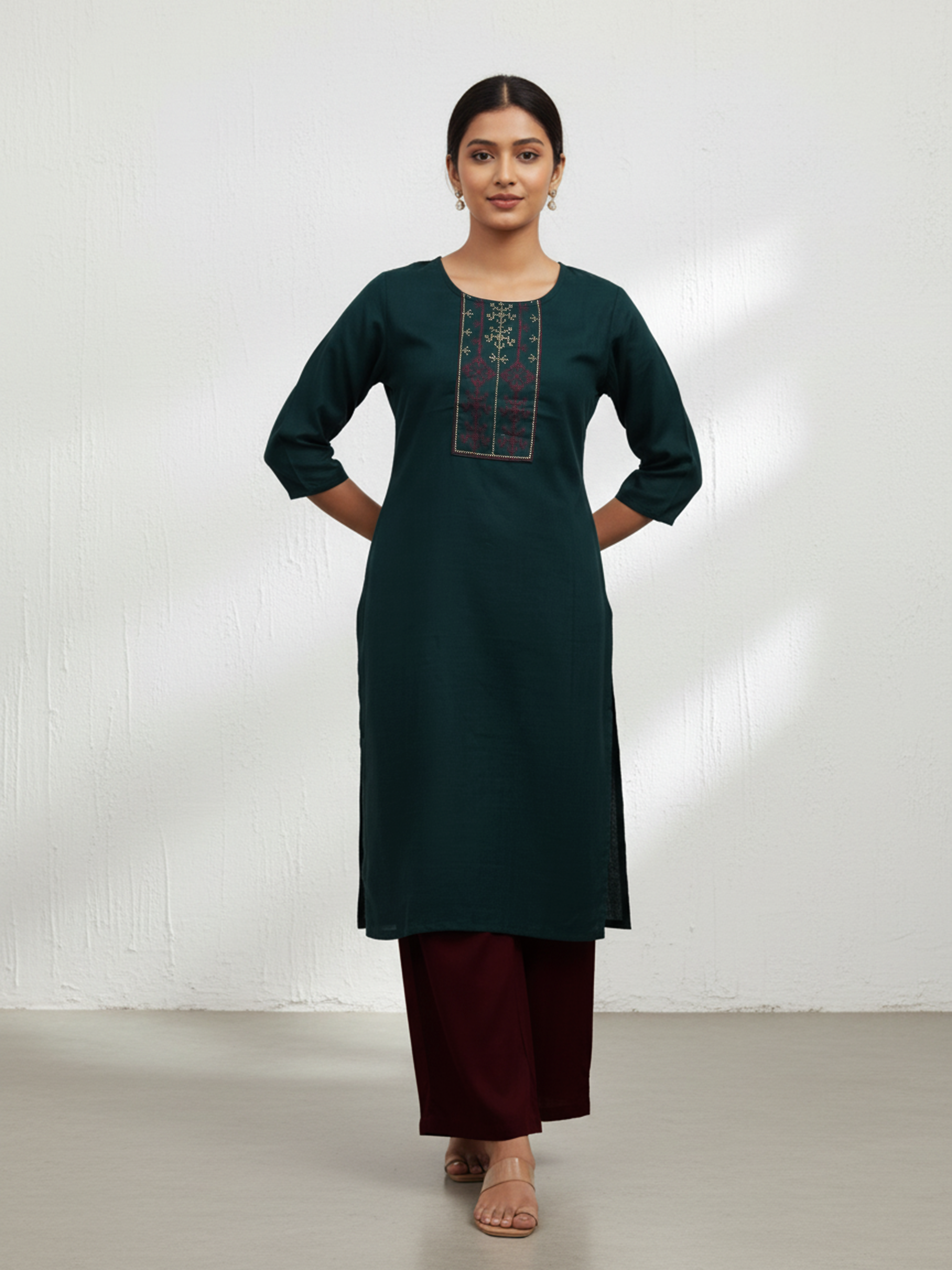 Poly cotton mix for breathable comfort kurti in dark green with straight fit and three-quarter sleeves, designed for clean, minimal dressing. Ideal for