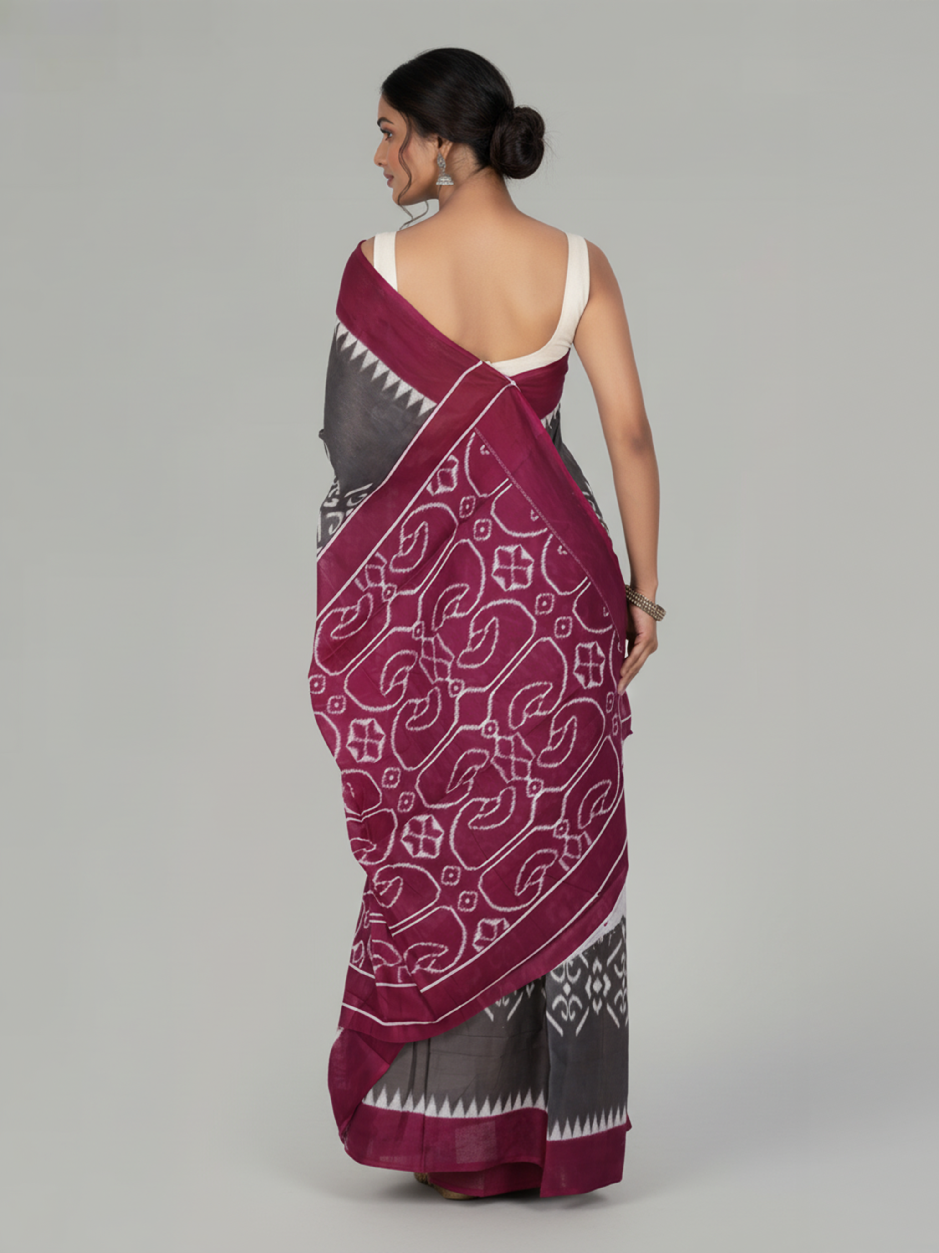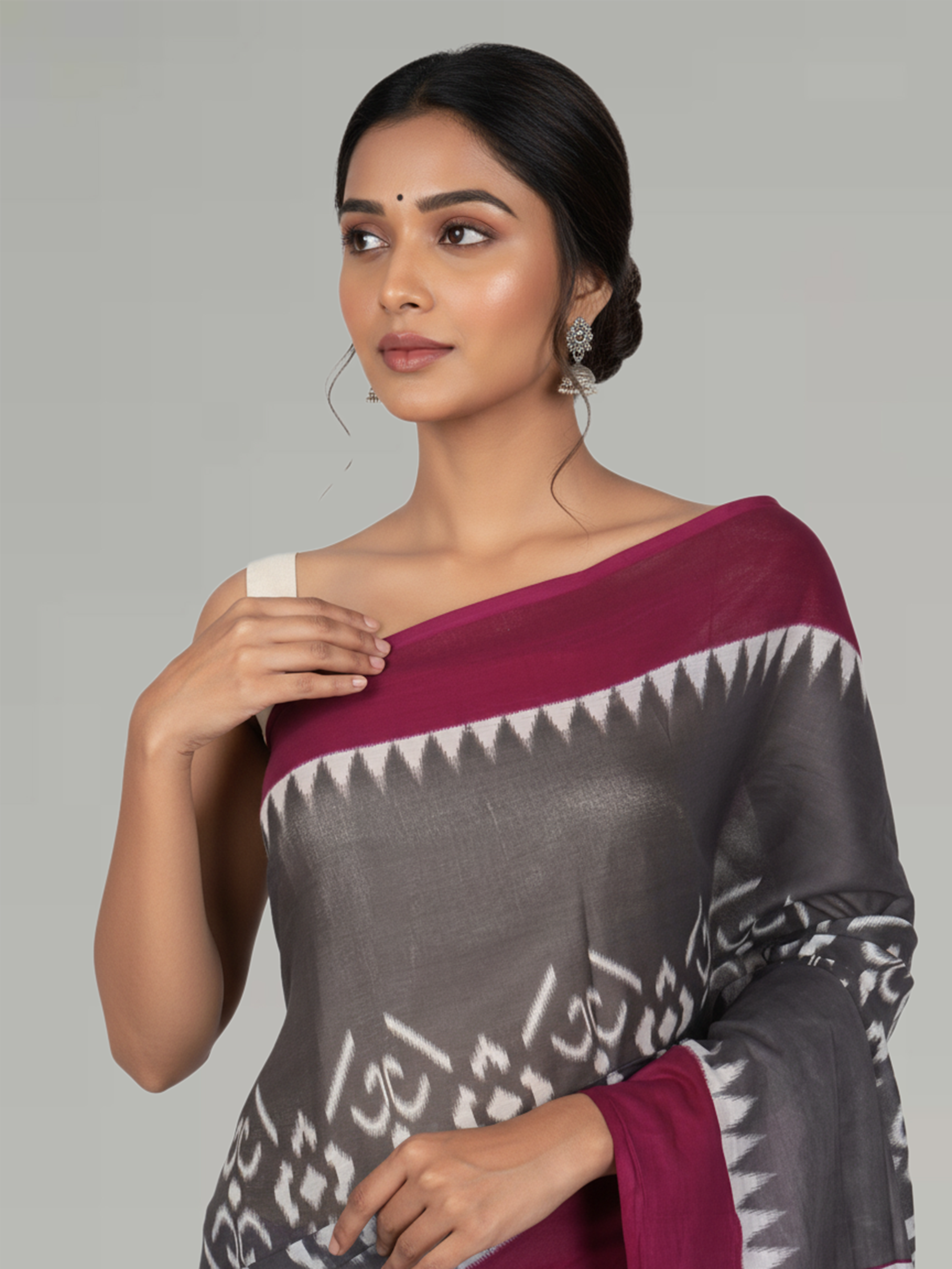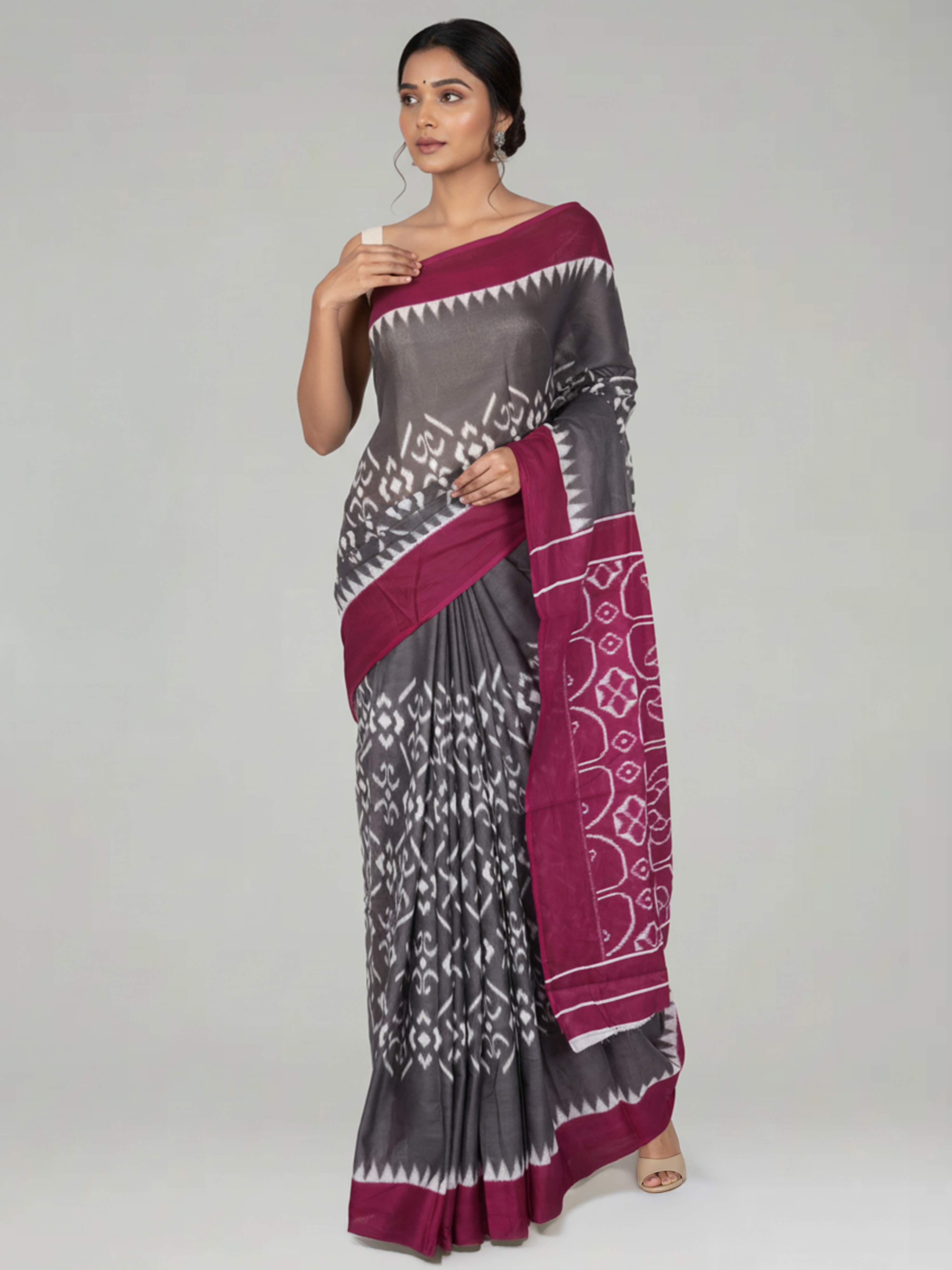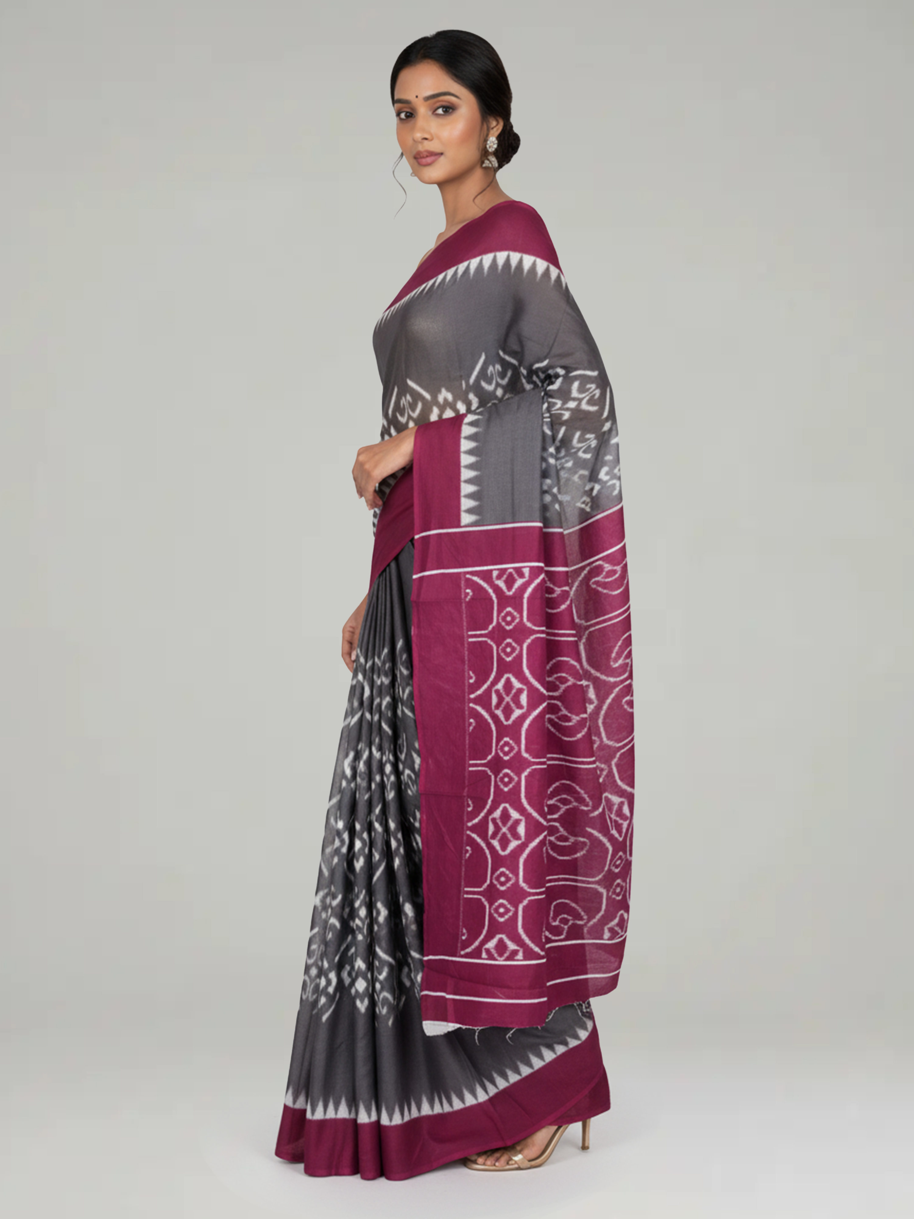 Dark Grey Soft Cotton Ikat Pattern Saree