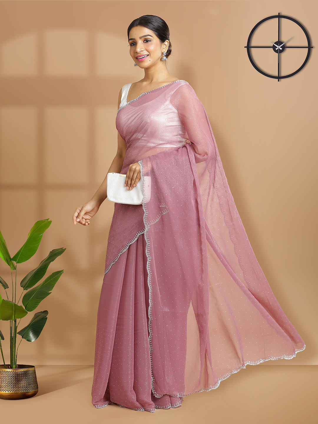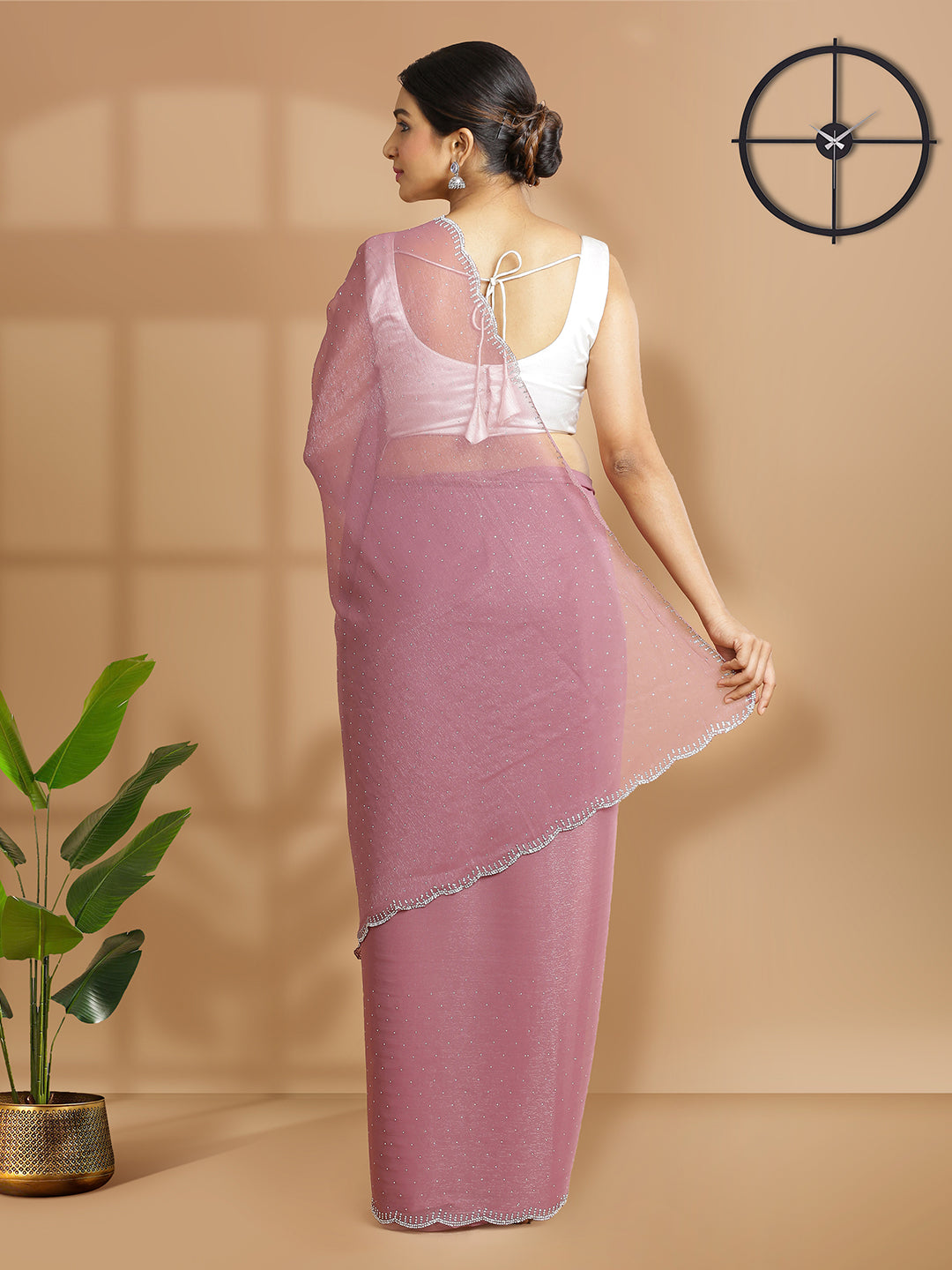 Dark Onion Pink Georgette Tissue Saree With Mini Stones Over Body