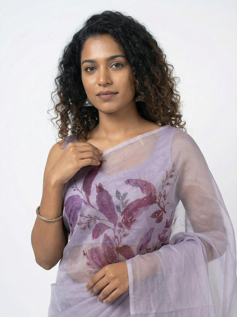 Organza Fancy Stylish Lavender Saree with Contemporary Brush Stroke Blouse
