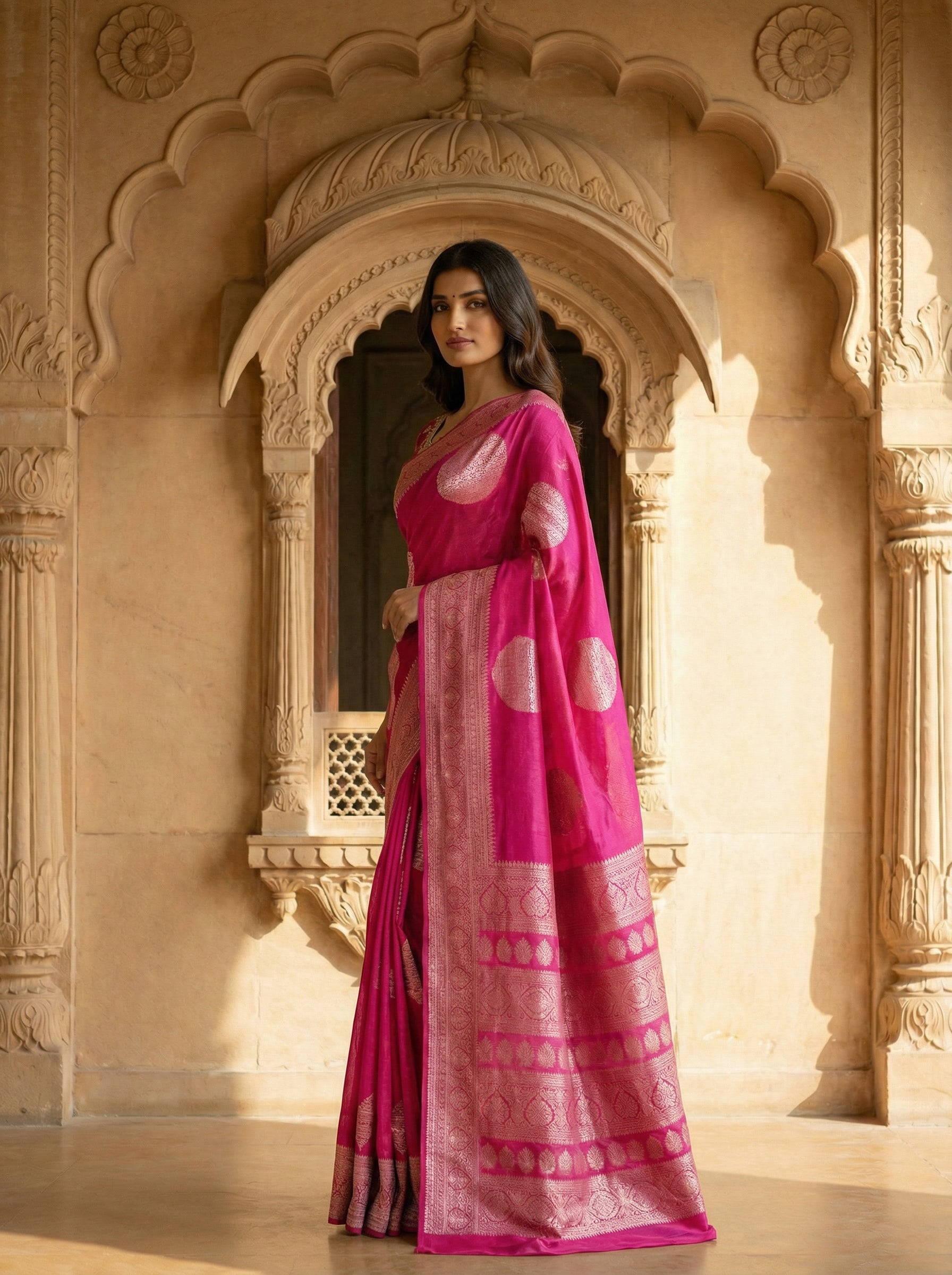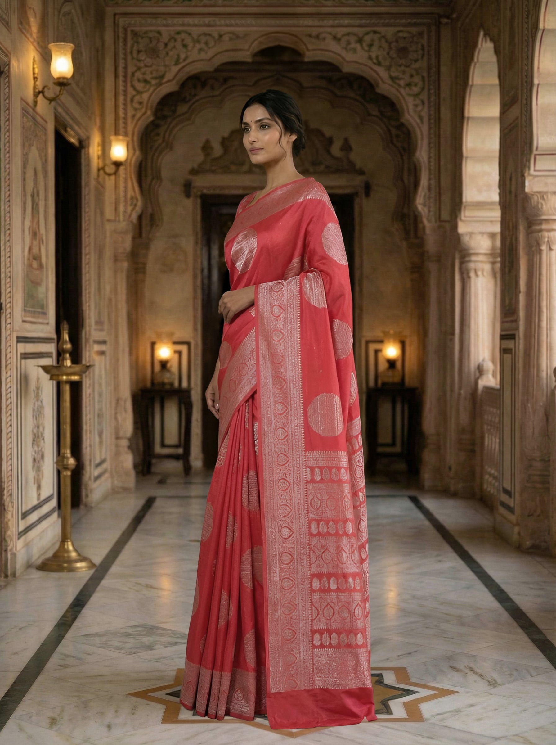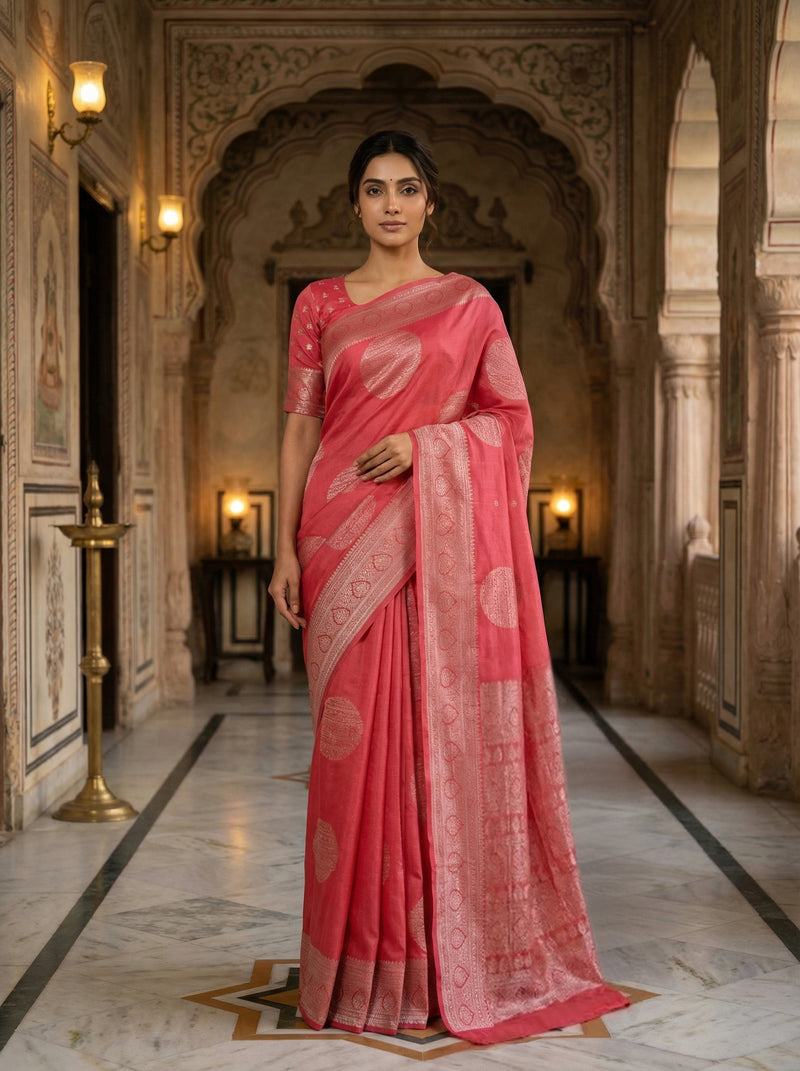 Elevate your festive celebrations with this exquisite semi-silk saree, adorned with intricate zari motifs that showcase traditional craftsmanship. The lustrous blend of silk and cotton creates a graceful drape while maintaining comfort throughout your special occasions. Delicate golden threadwork embellishes the pallu and borders, adding timeless elegance to your ensemble. Perfect for weddings, festivals, and cultural gatherings, this saree combines heritage artistry with contemporary wearability. The rich texture and refined detailing make it an investment piece that transcends seasonal trends, ensuring you look resplendent at every celebration.