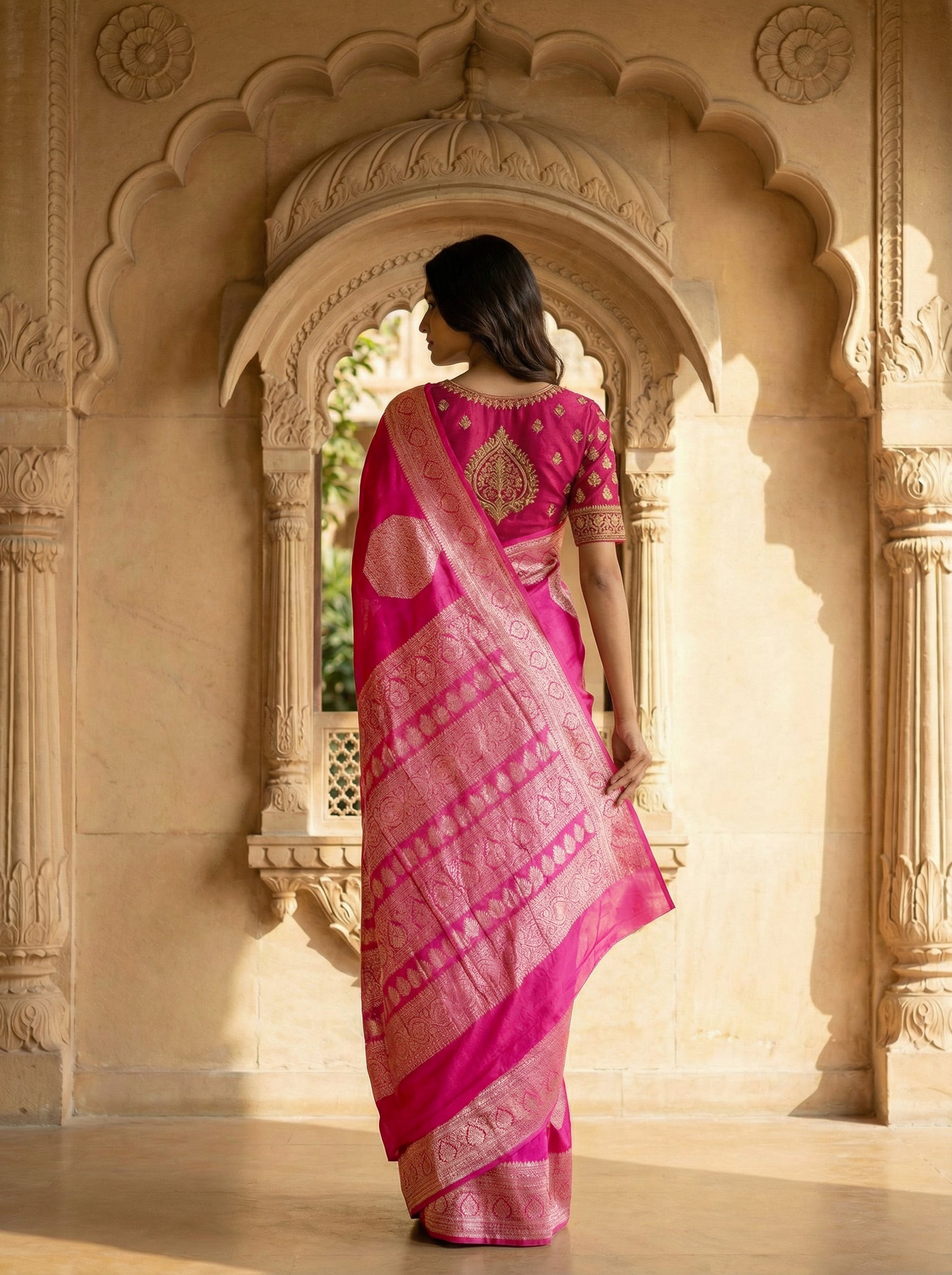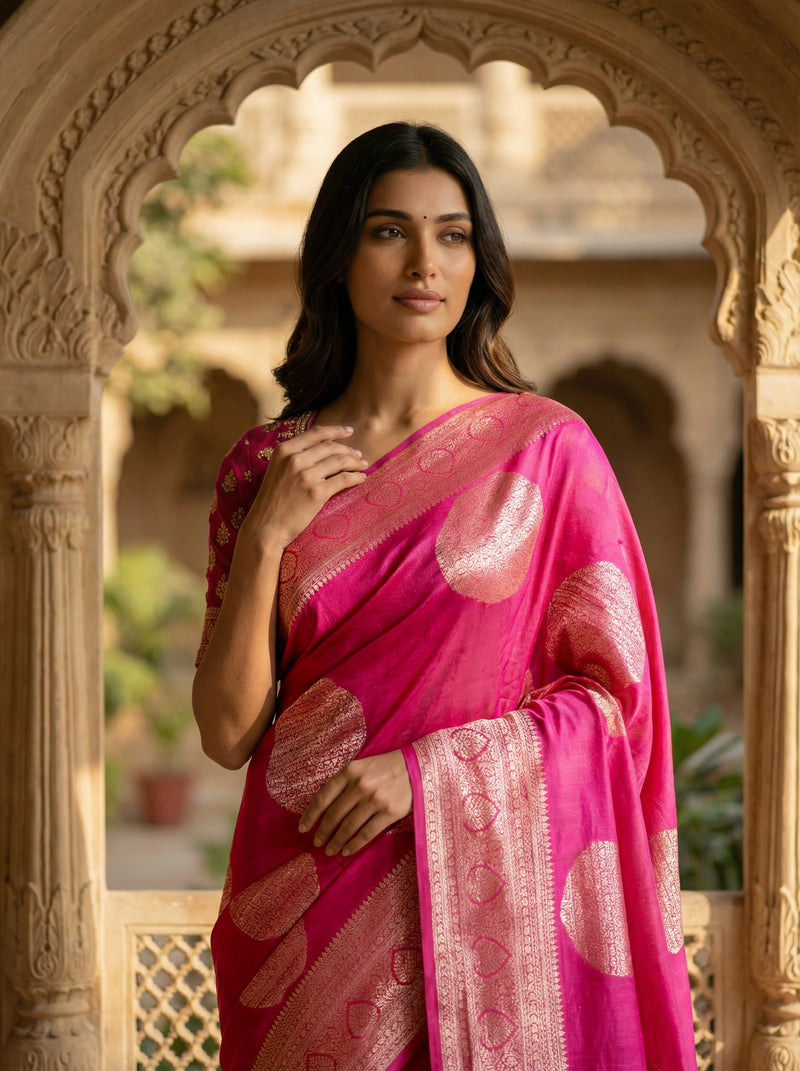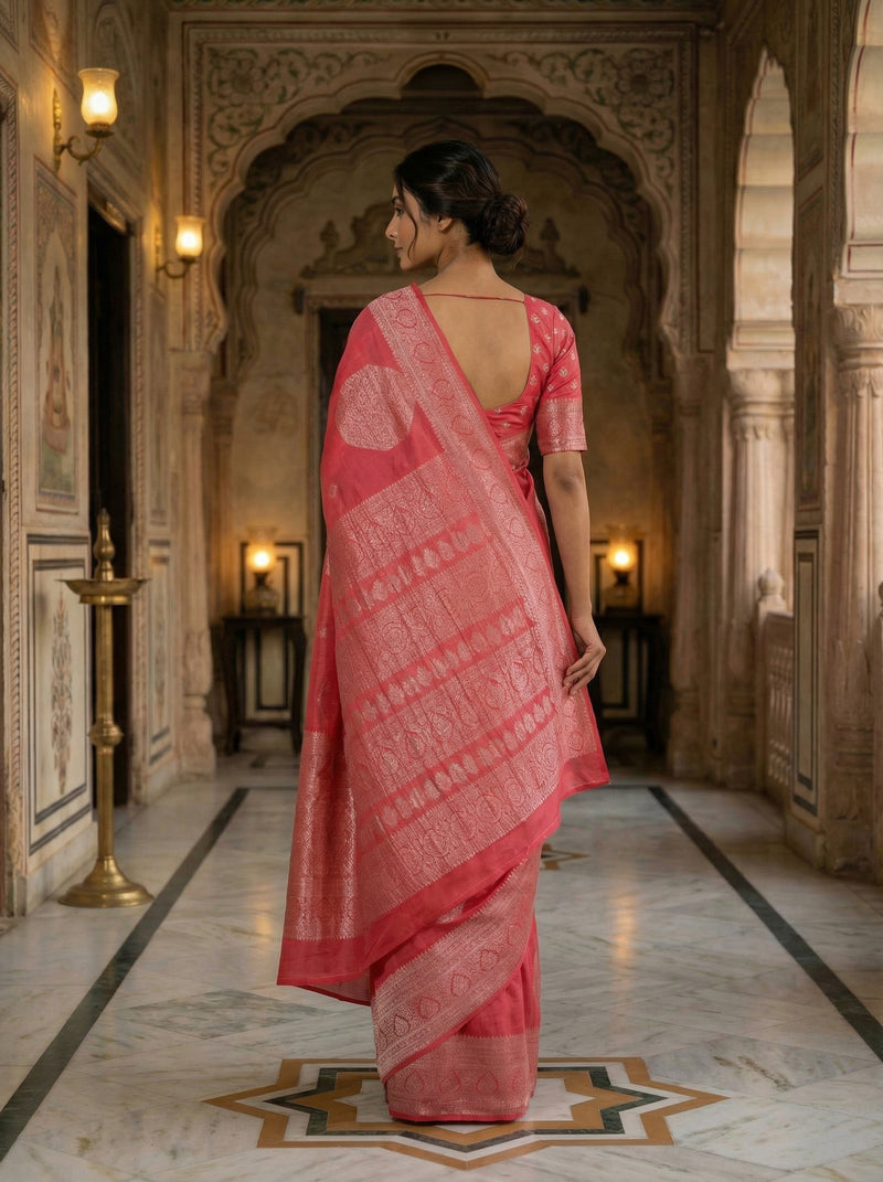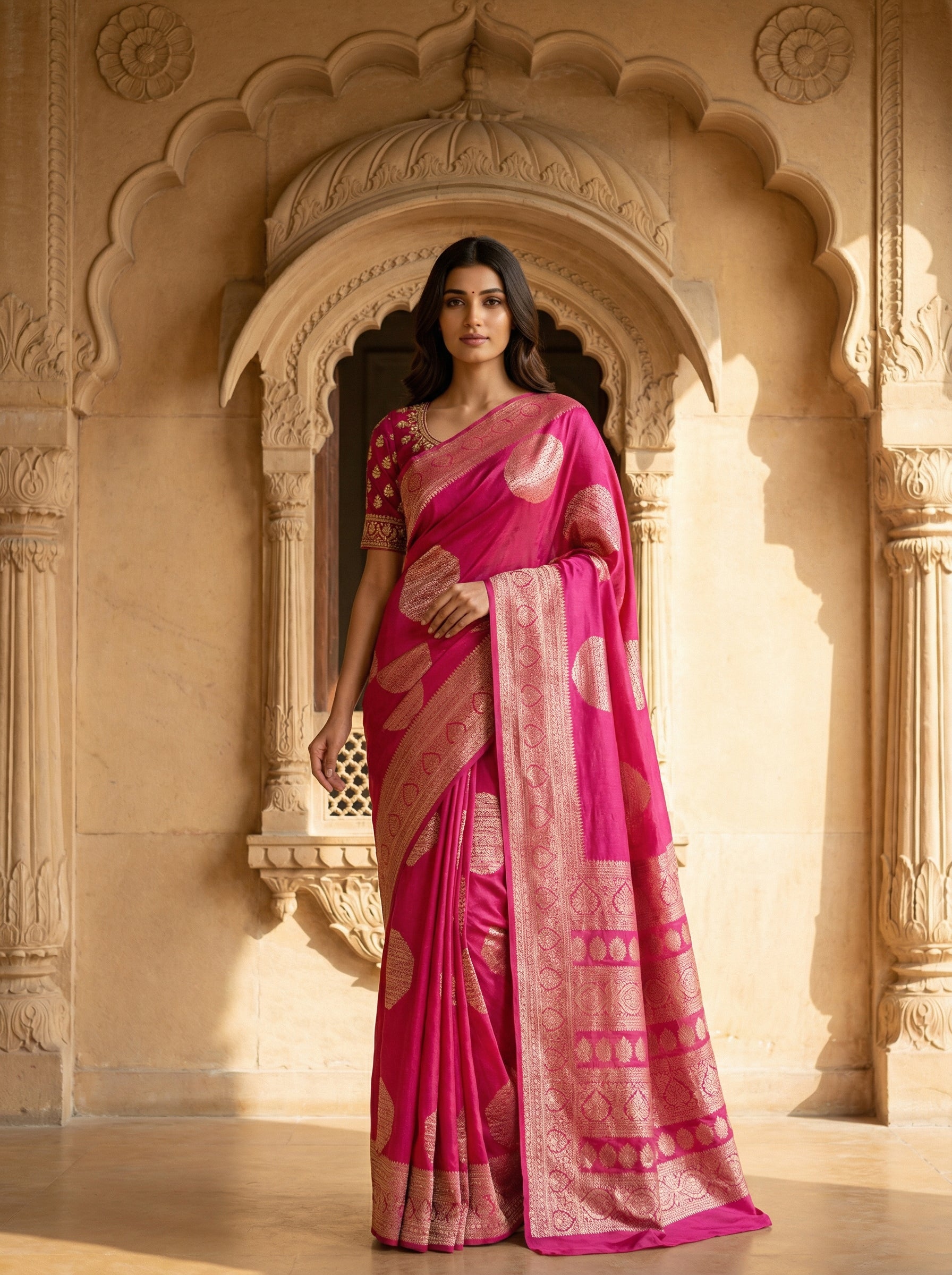 Elevate your festive celebrations with this exquisite semi-silk saree, adorned with intricate zari motifs that showcase traditional craftsmanship. The lustrous blend of silk and cotton creates a graceful drape while maintaining comfort throughout your special occasions. Delicate golden threadwork embellishes the pallu and borders, adding timeless elegance to your ensemble. Perfect for weddings, festivals, and cultural gatherings, this saree combines heritage artistry with contemporary wearability. The rich texture and refined detailing make it an investment piece that transcends seasonal trends, ensuring you look resplendent at every celebration.