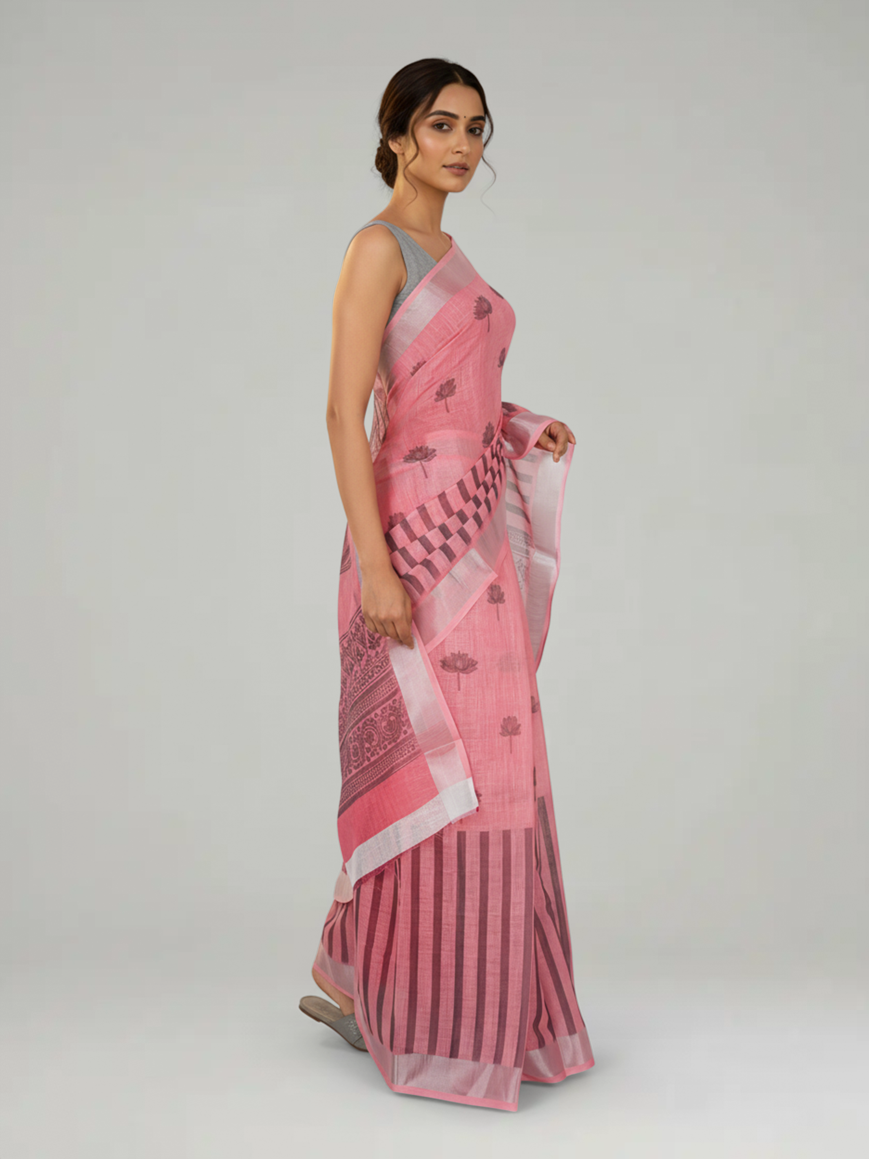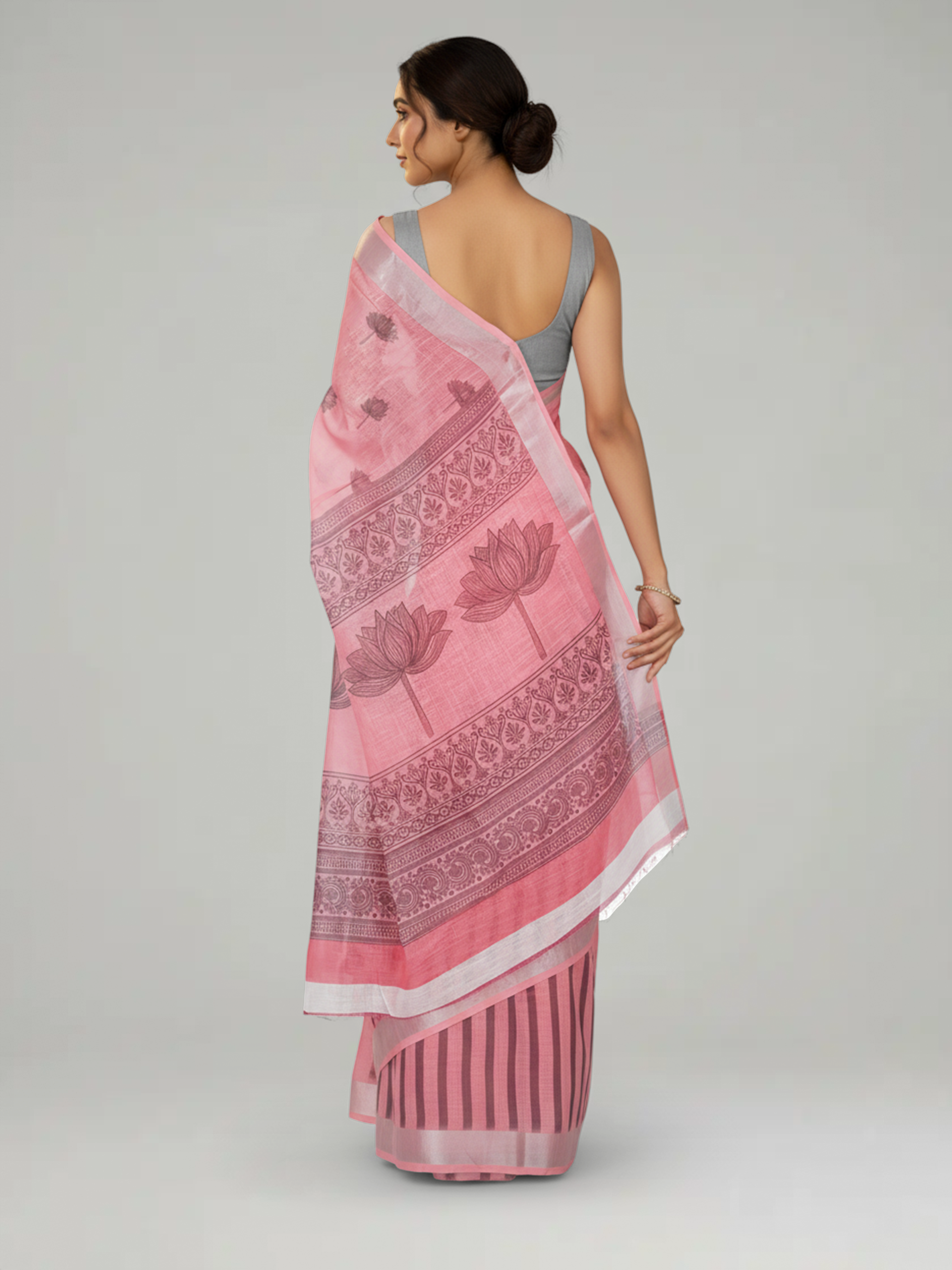 Bright semi linen saree in flamingo pink with printed design and elegant silver zari Bavanji border.
