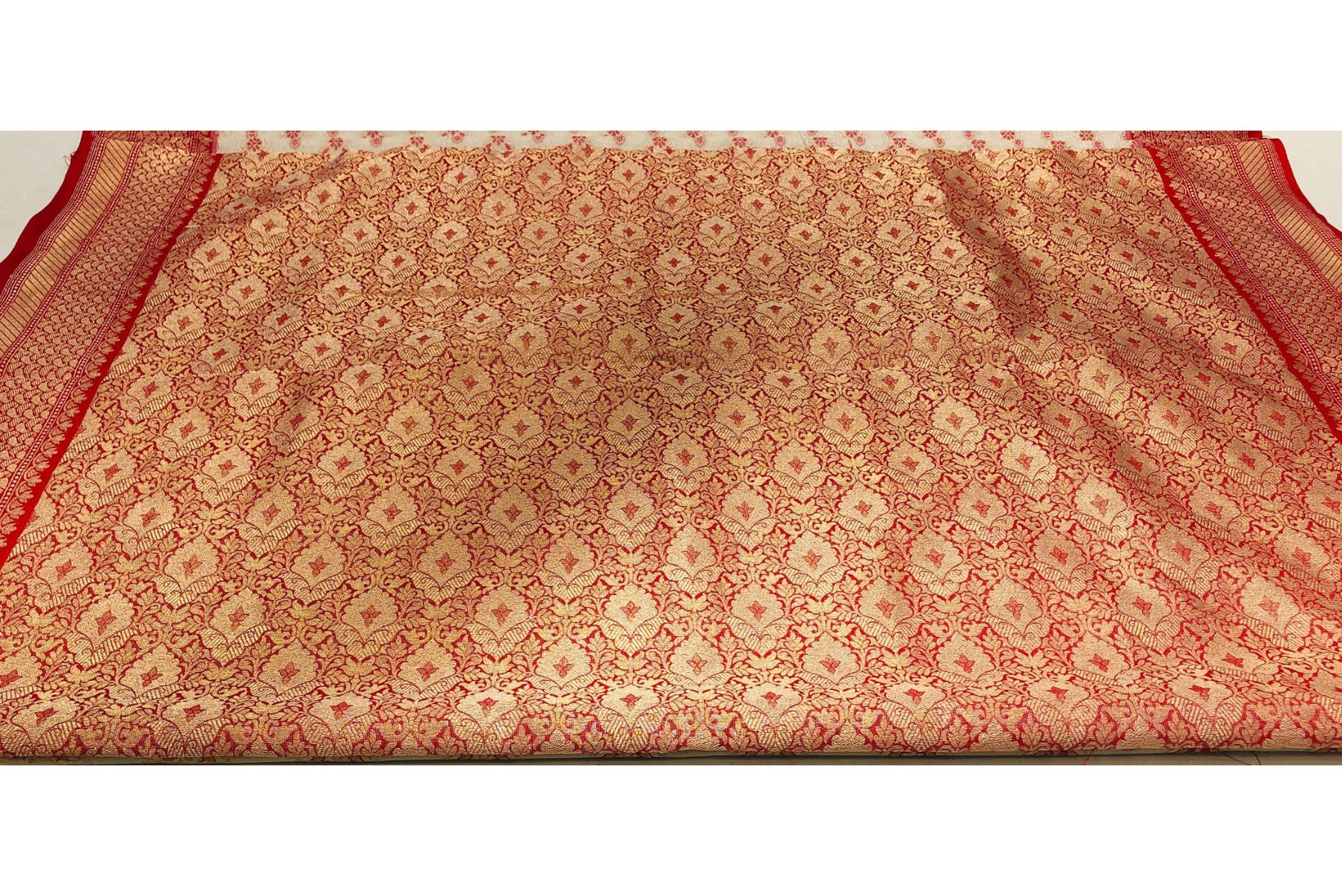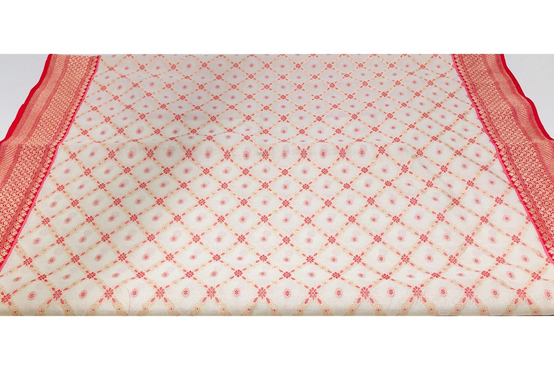 Floral White & Red Color Banarasi Silk Saree With Golden Jeri Work