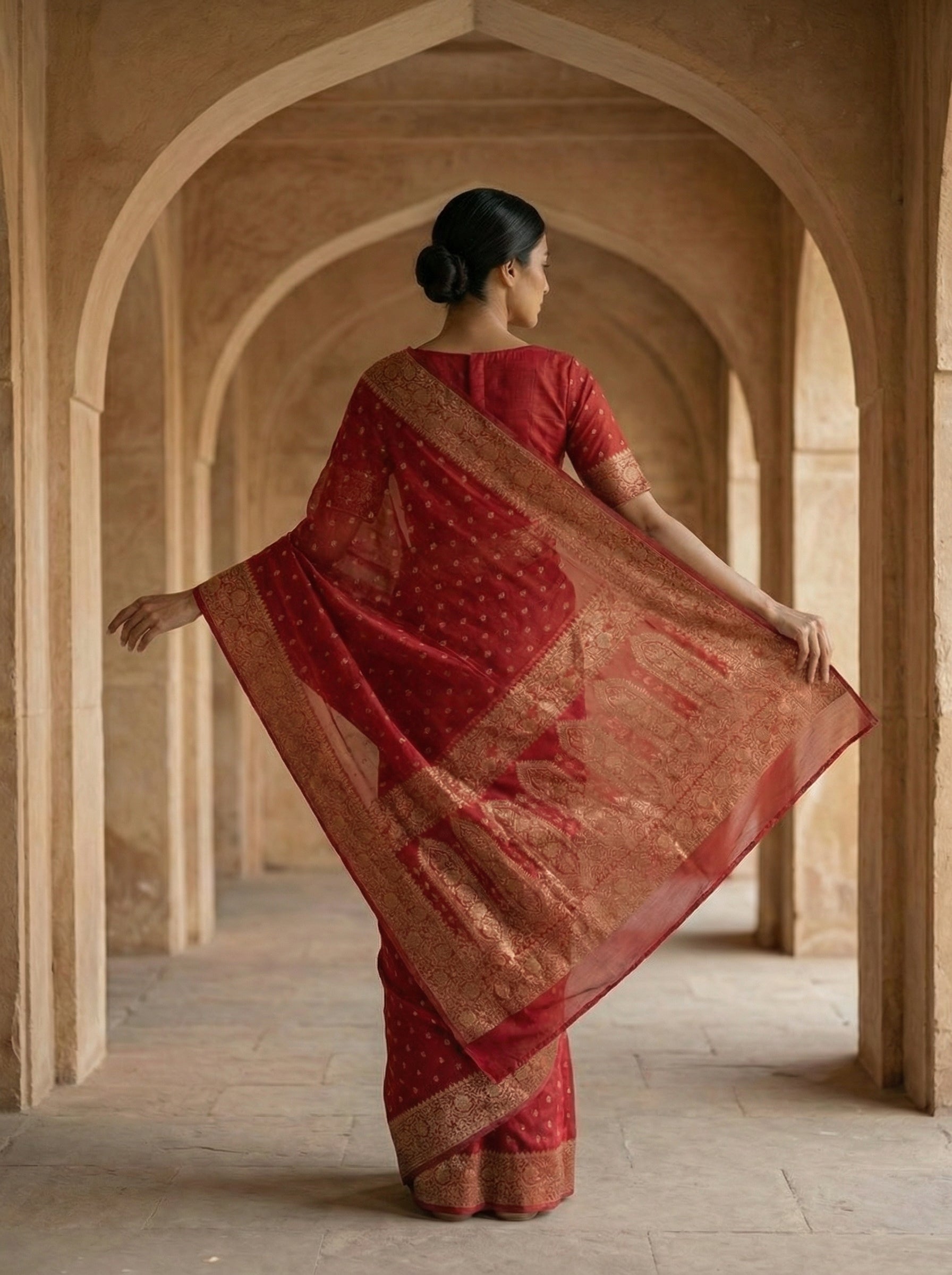 Drape yourself in timeless elegance with this Georgette Banarasi Chili Red Traditional Butta Saree. Crafted from luxurious georgette fabric, this saree features intricate traditional butta patterns that showcase authentic Banarasi weaving heritage. The rich chili red hue exudes sophistication and warmth, making it perfect for weddings, festivals, and special occasions. The lightweight georgette ensures comfortable all-day wear while maintaining graceful draping. An ideal choice for those who appreciate classic Indian craftsmanship and refined style.