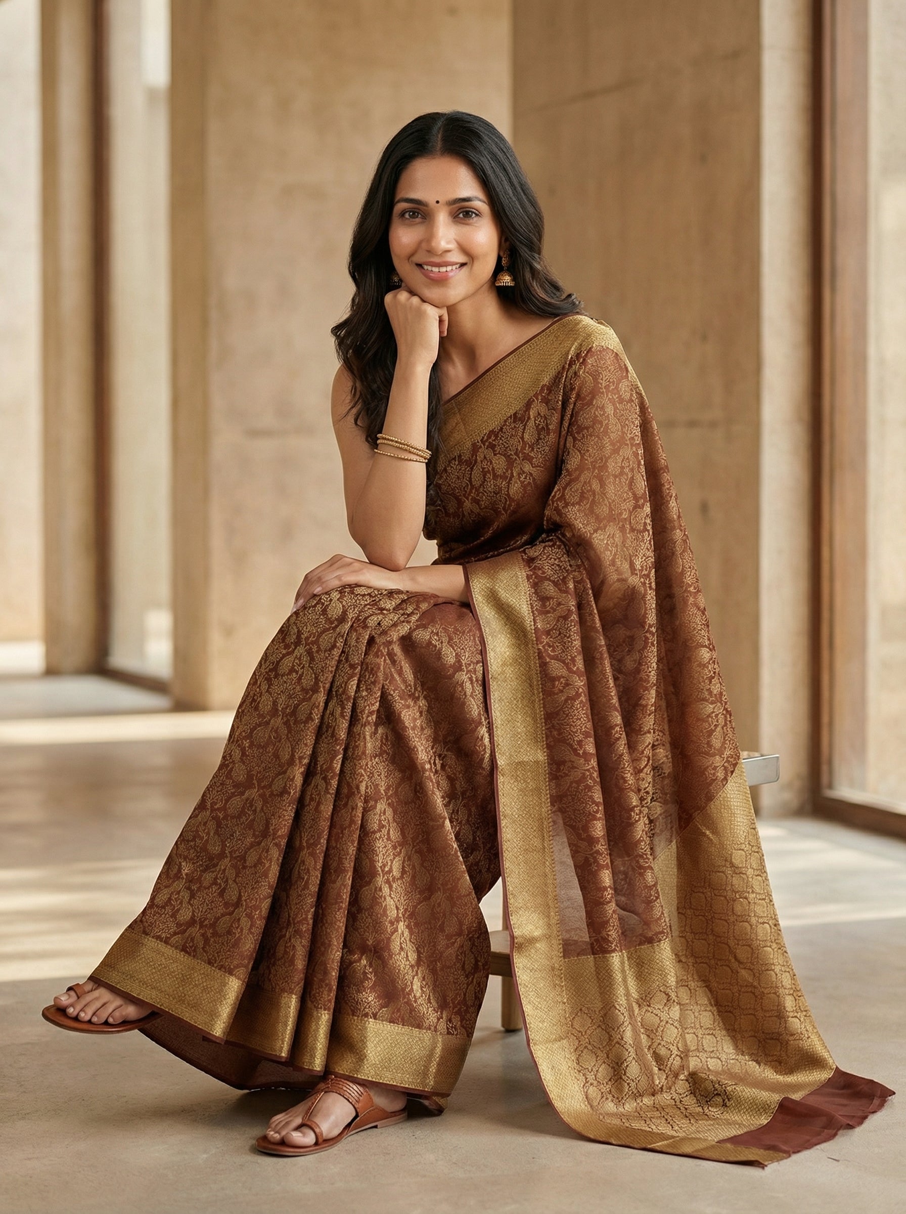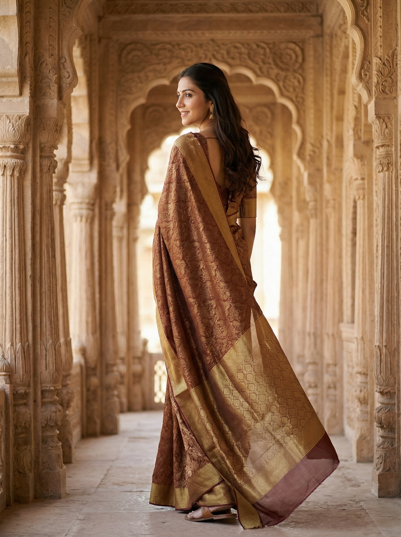 Georgette Banarasi Copper Brown Floral Brocade Saree