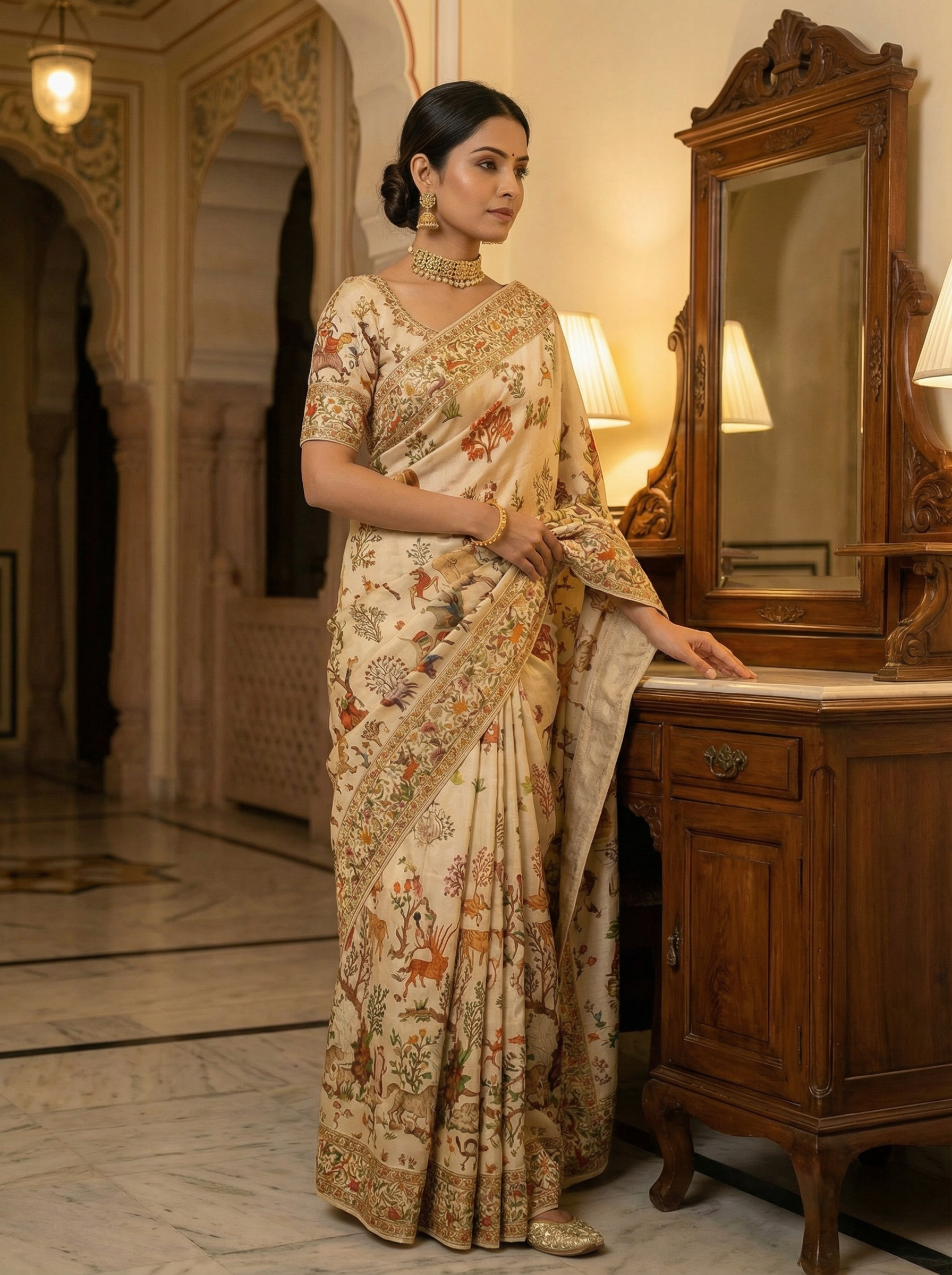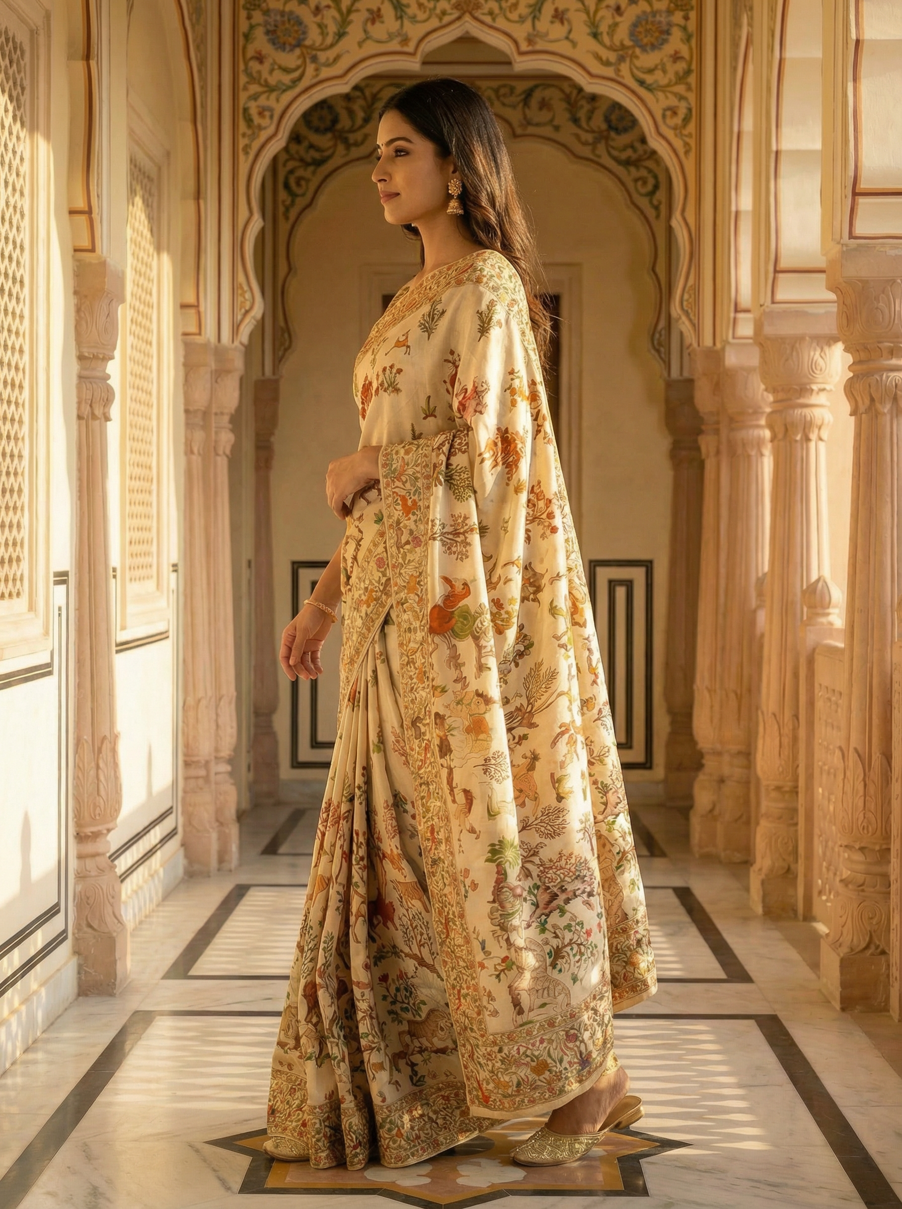 Georgette Banarasi Cream Multicolor Wildlife Printed Saree