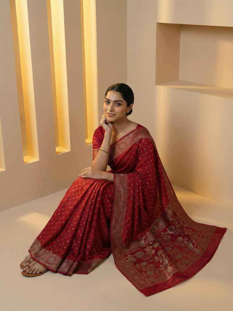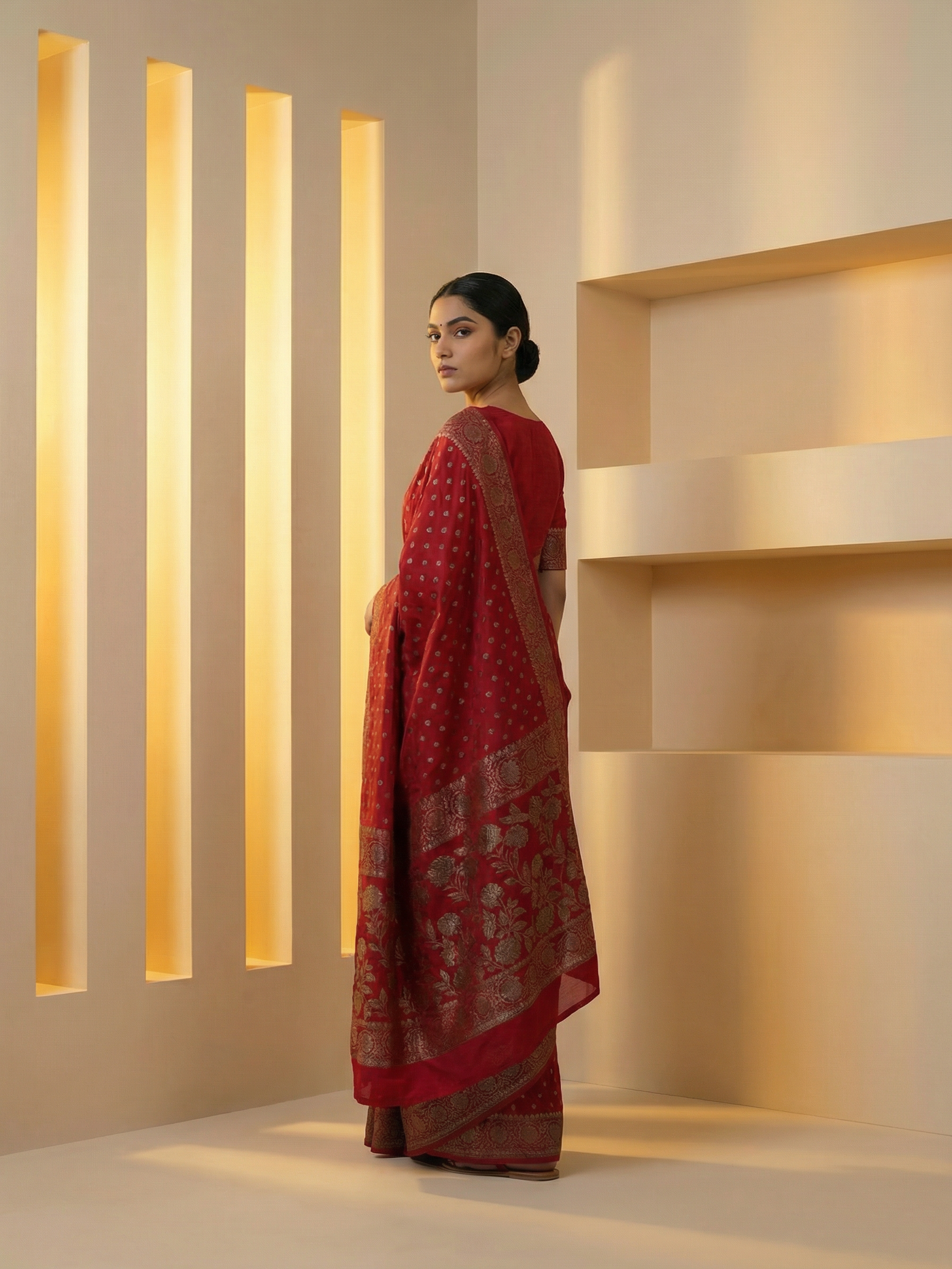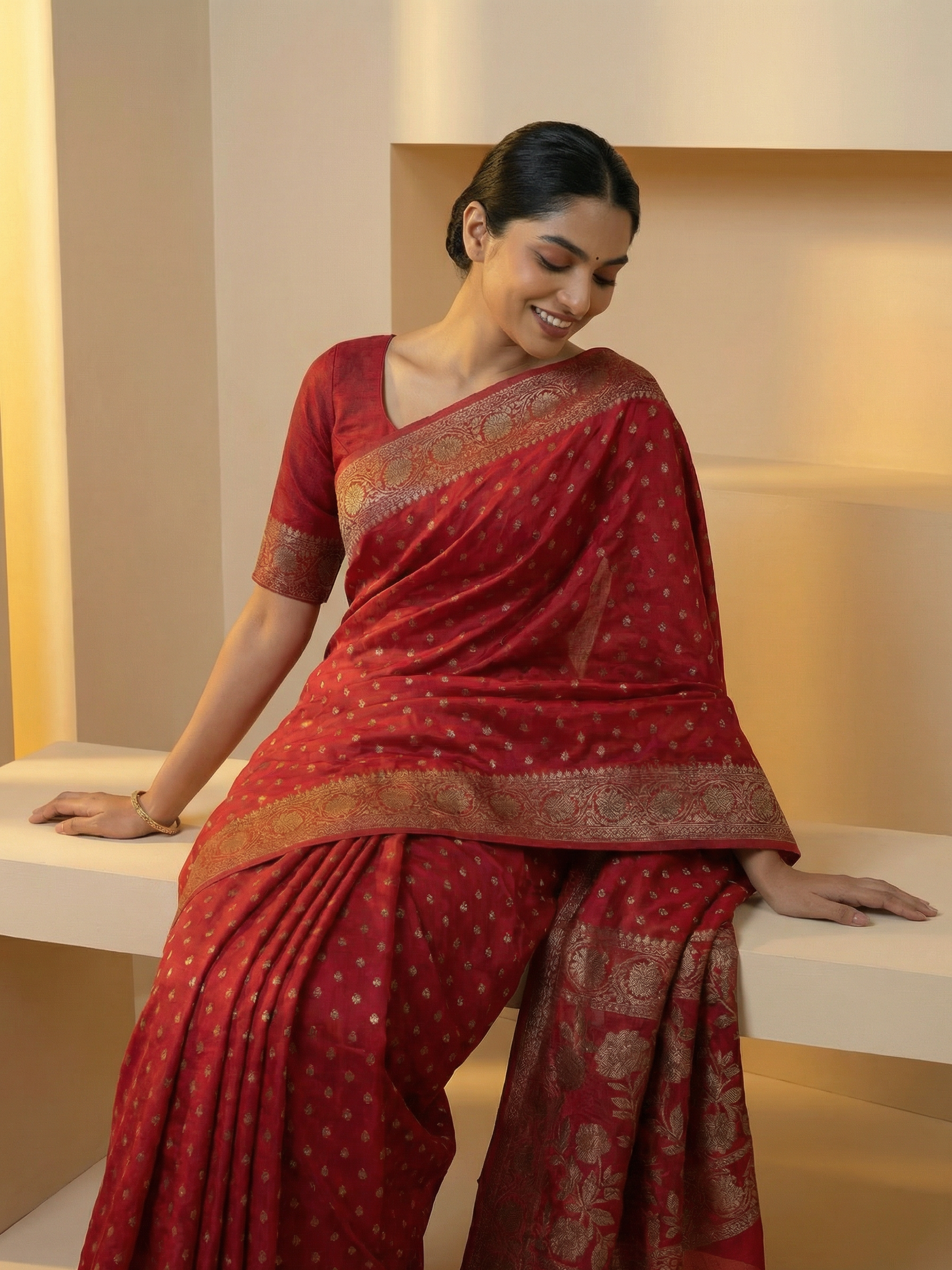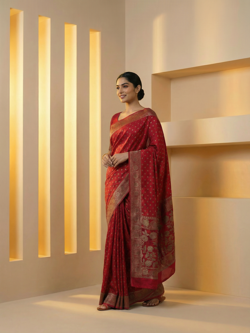 Elegant georgette saree in deep red with intricate zari border detailing. The lightweight fabric drapes beautifully, making it perfect for festive occasions, weddings, and celebrations. The rich red hue combined with golden zari embellishments creates a timeless, sophisticated look. Comfortable