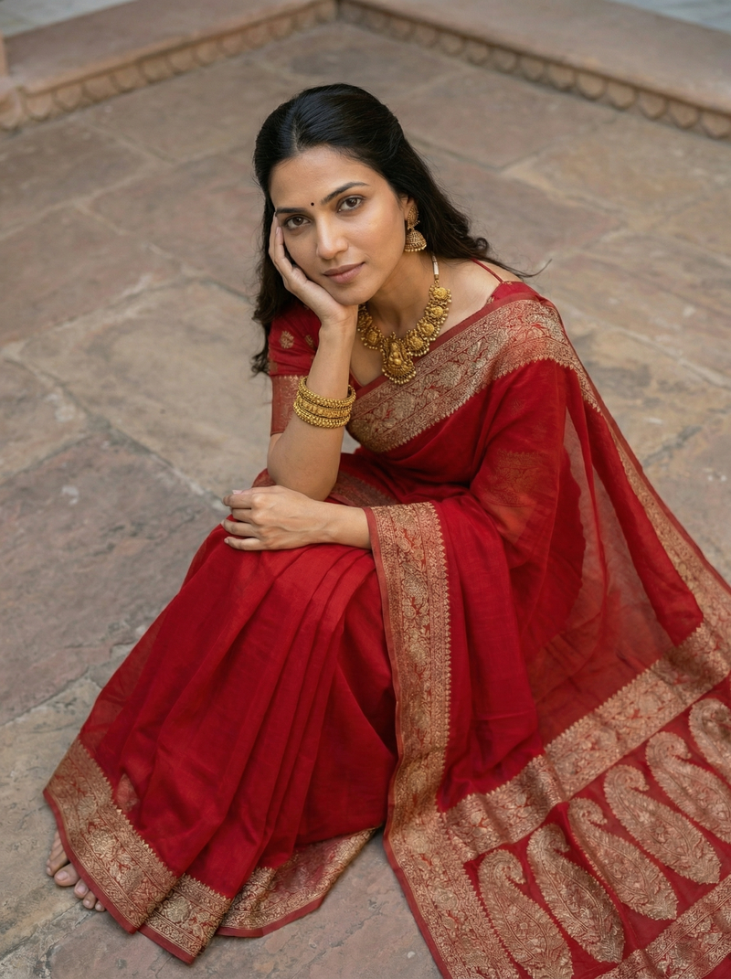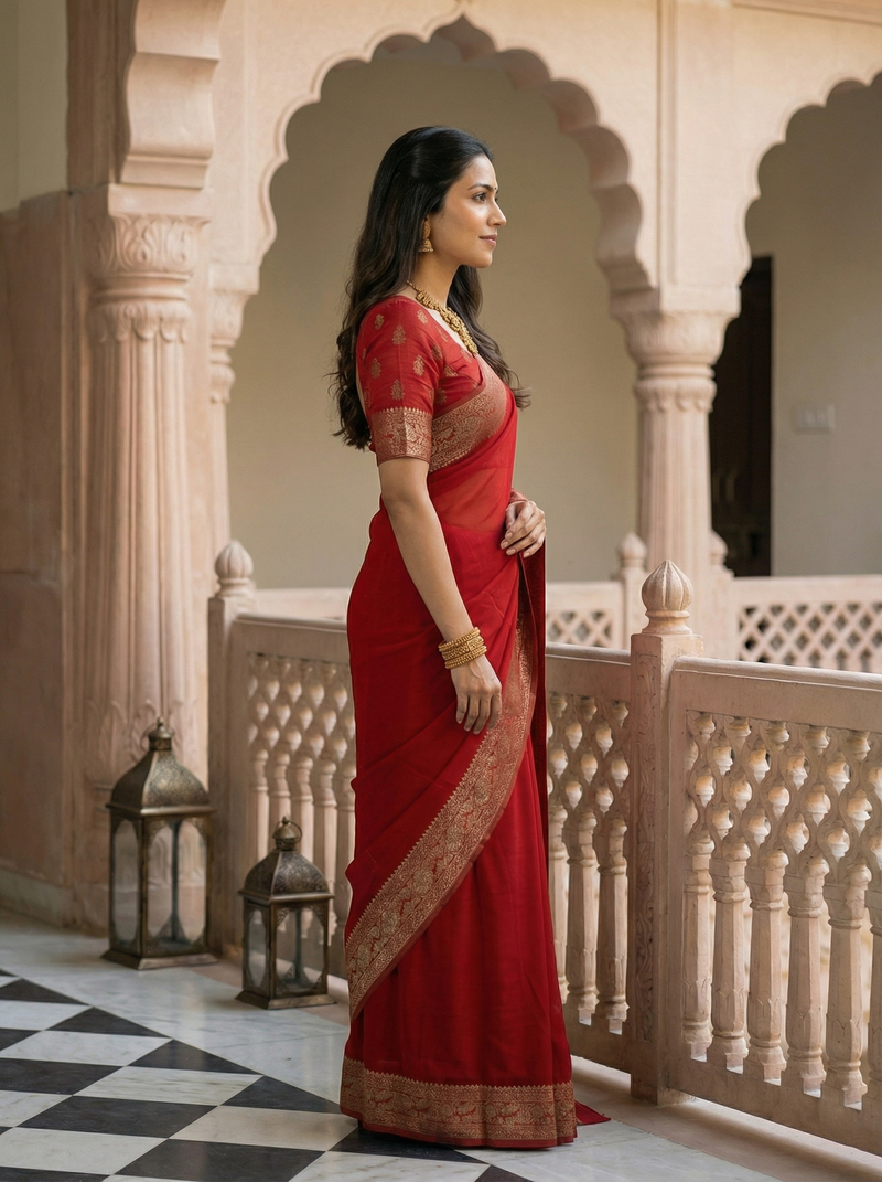Drape yourself in timeless elegance with this Georgette Banarasi Saree in striking Ember Red. Crafted from luxurious georgette fabric, this classic design features intricate Zari work that catches the light beautifully. The traditional Banarasi weaving technique ensures authentic craftsmanship and durability. Perfect for weddings, festivals, and special occasions, this saree combines rich heritage with contemporary grace.
