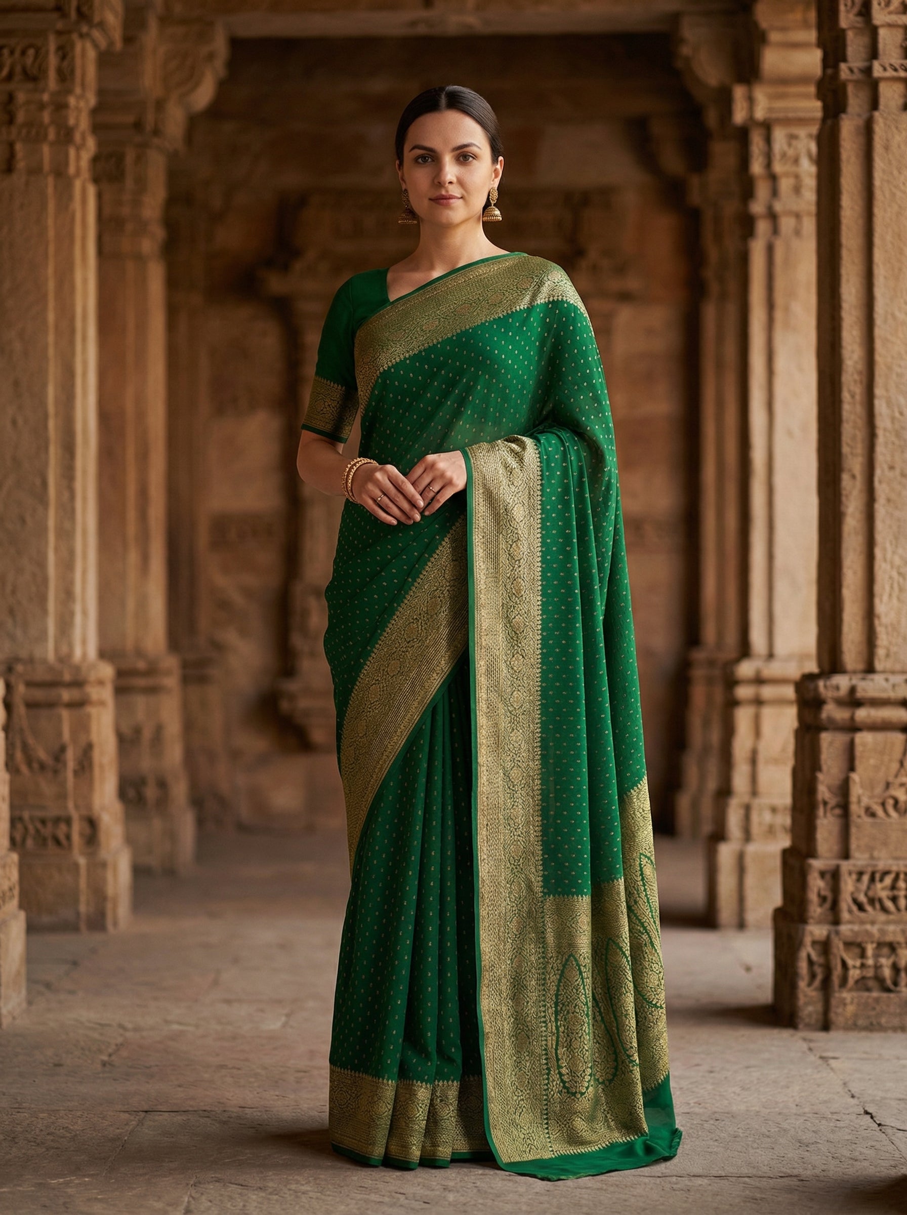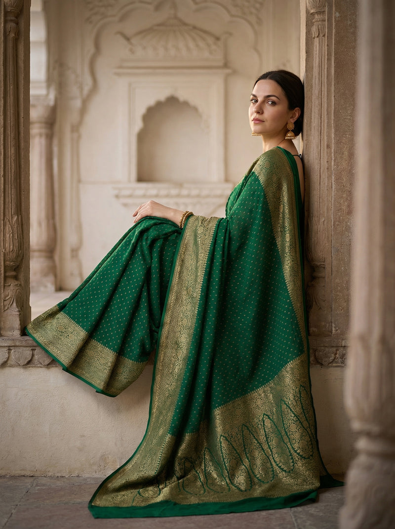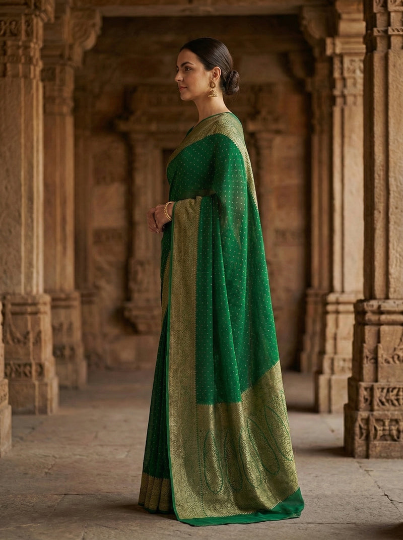 Georgette Banarasi Emerald Green Zari Dotted Saree