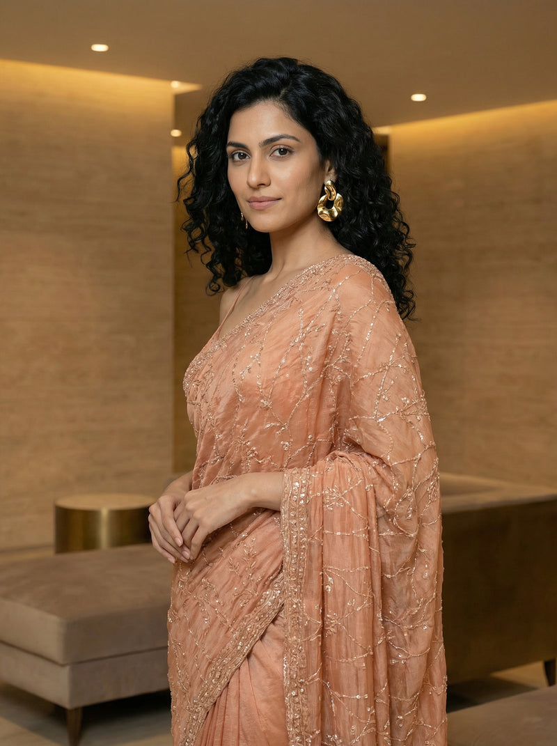 Experience timeless elegance with this exquisite Organza Peach Sequin Pattern Designer Saree. Woven from lightweight organza, this masterpiece showcases an enchanting sequin design that radiates brilliance with every movement. The warm peach hue offers versatility for various skin tones, while the shimmering embellishments create an eye-catching statement. Ideal for weddings, celebrations, and festive gatherings, this saree seamlessly blends traditional craftsmanship with modern aesthetics. Drape it with grace and command attention at any occasion.