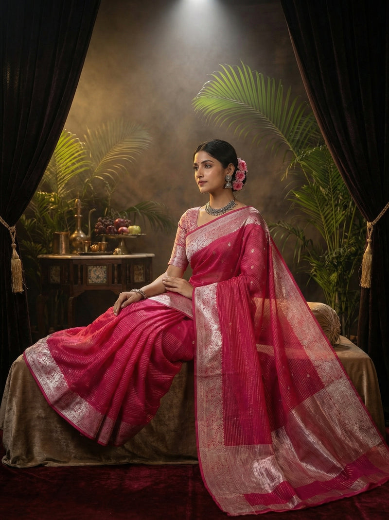 Experience the timeless beauty of this Georgette Banarasi saree in vibrant rani pink. Adorned with exquisite zari butti embroidery, this traditional six-yard drape combines authentic Banarasi weaving techniques with contemporary comfort. The lightweight georgette fabric flows effortlessly, making it ideal for weddings, festivals, and celebrations. Each butti detail reflects skilled craftsmanship and cultural heritage. Perfect for those seeking an elegant, versatile piece that transitions seamlessly from day events to evening gatherings. Embrace tradition with grace and sophistication.