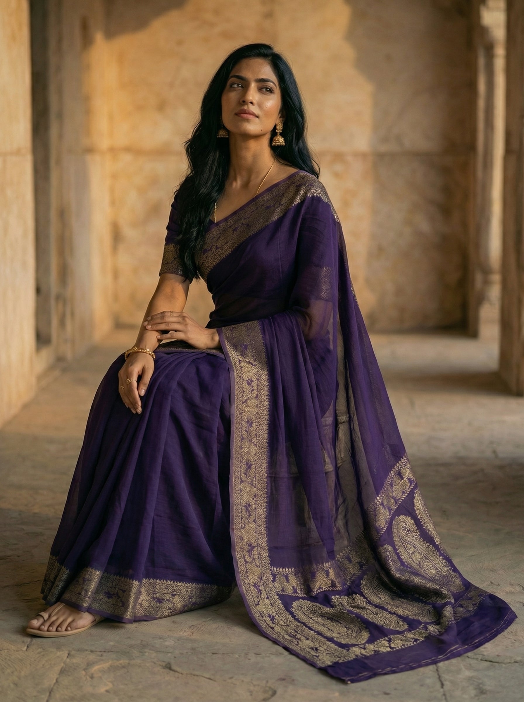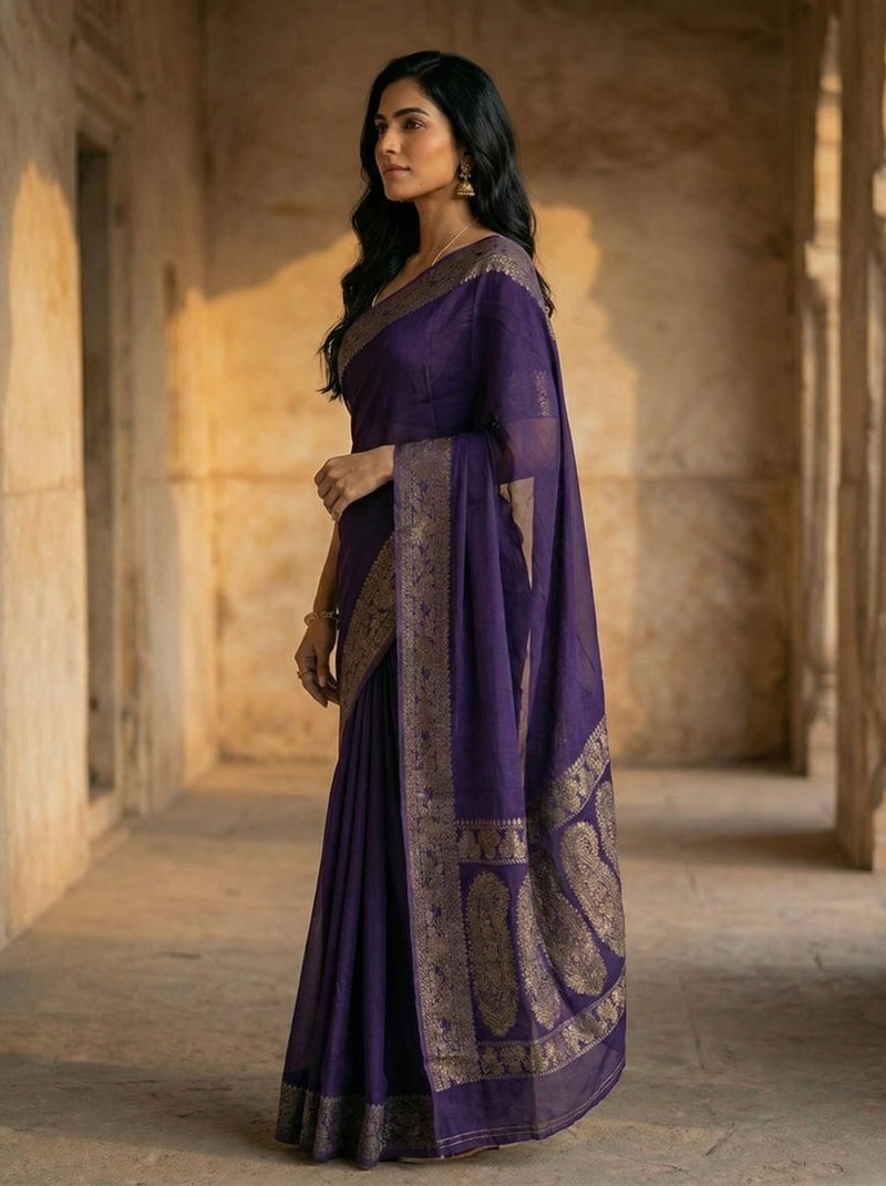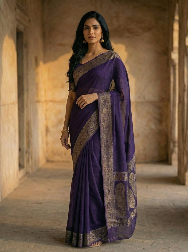 Elevate your ethnic wardrobe with this stunning Georgette Banarasi saree in royal purple. Crafted from lightweight georgette fabric, it features an exquisite zari border that adds timeless elegance and sophistication. The intricate Banarasi weaving showcases traditional craftsmanship, making it perfect for weddings, festivals, and special occasions. The rich purple hue complements all skin tones, while the shimmering zari detailing catches light beautifully. Drape with confidence and grace in this versatile, comfortable saree that seamlessly blends heritage with contemporary style.