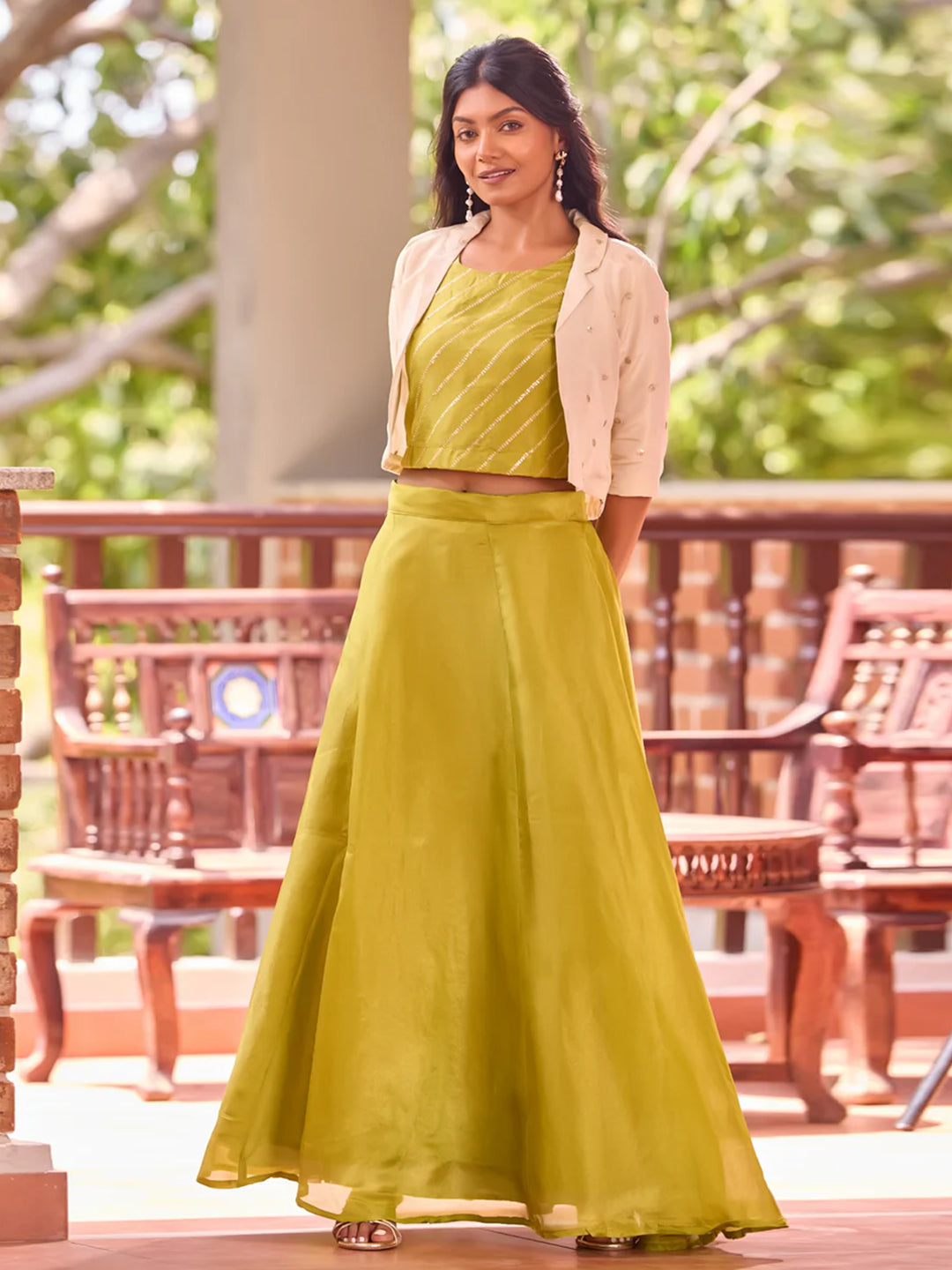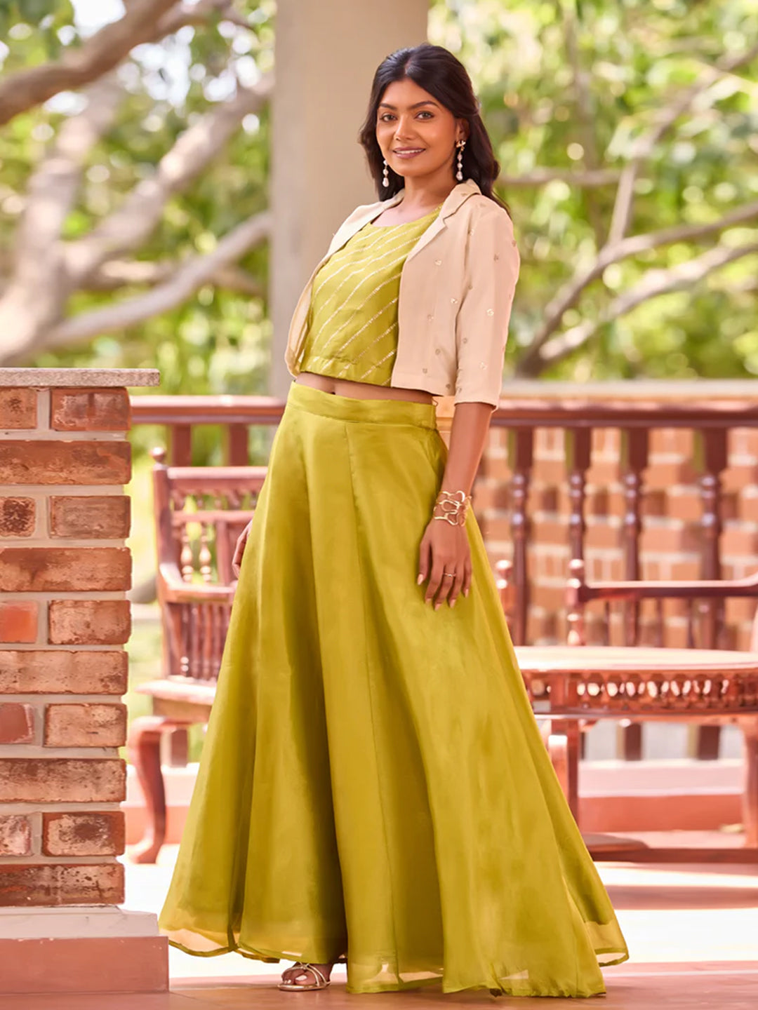 A layered festive look featuring green embroidered crop top, off-white Outer & kasavu skirt—crafted in viscose tissue, ideal for graceful Onam styling.