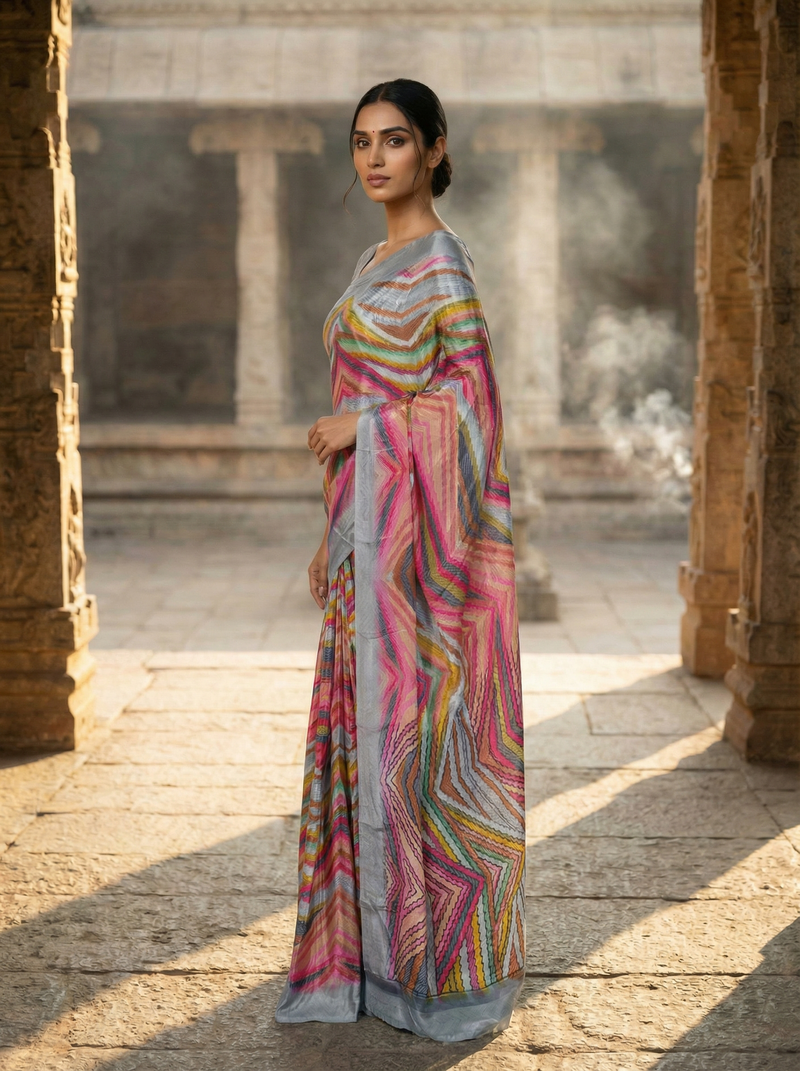 Brighten your wardrobe with this vibrant polyester saree featuring a striking multicolor chevron pattern on a subtle grey base. The flowing zigzag design in shades of pink, yellow, green, and orange creates a lively yet elegant look, making this saree a perfect choice for modern styling. The soft grey border balances the colorful print beautifully, giving the saree a refined finish.