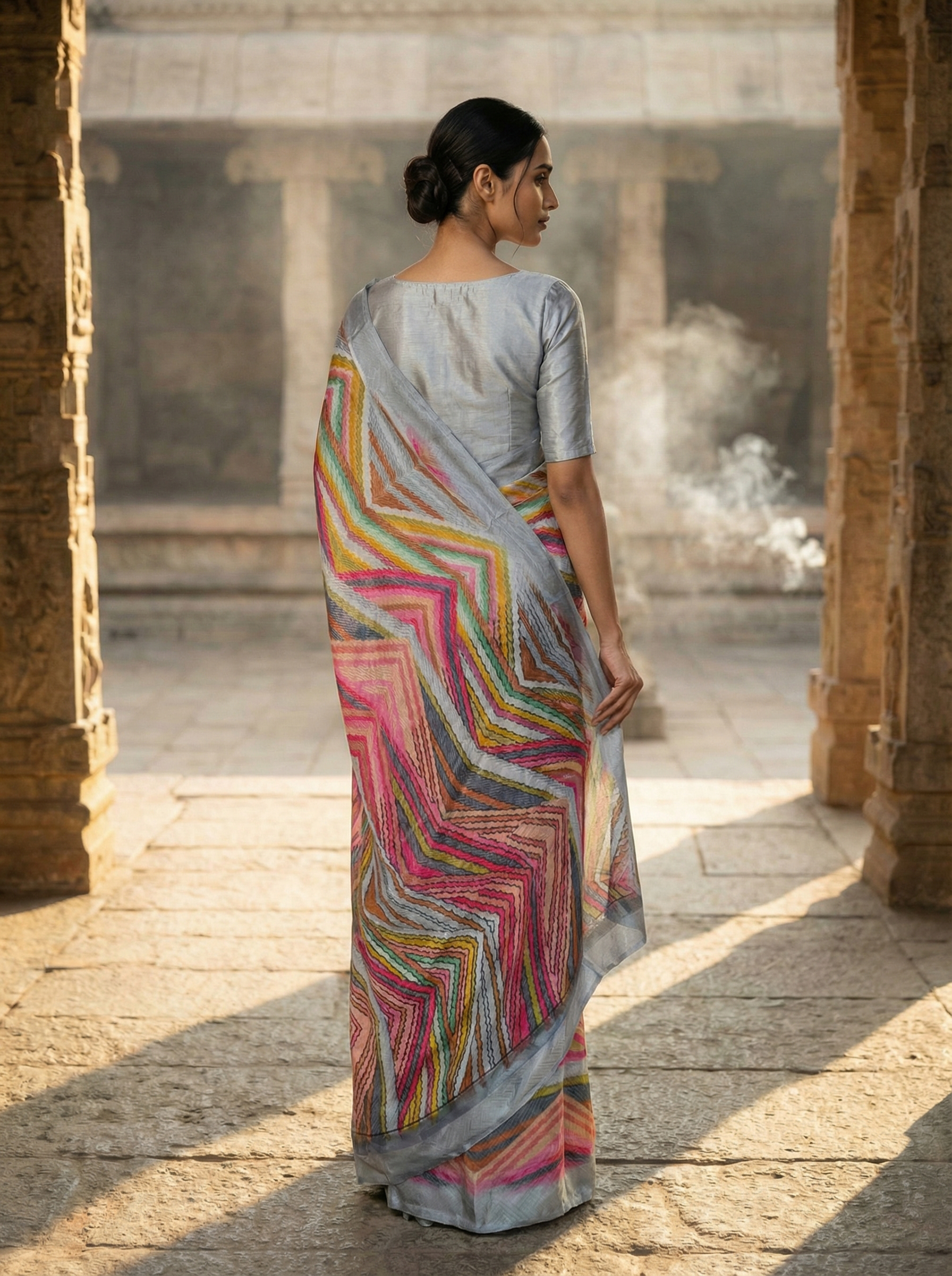 Grey Multicolor Saree with Chevron Pattern Print