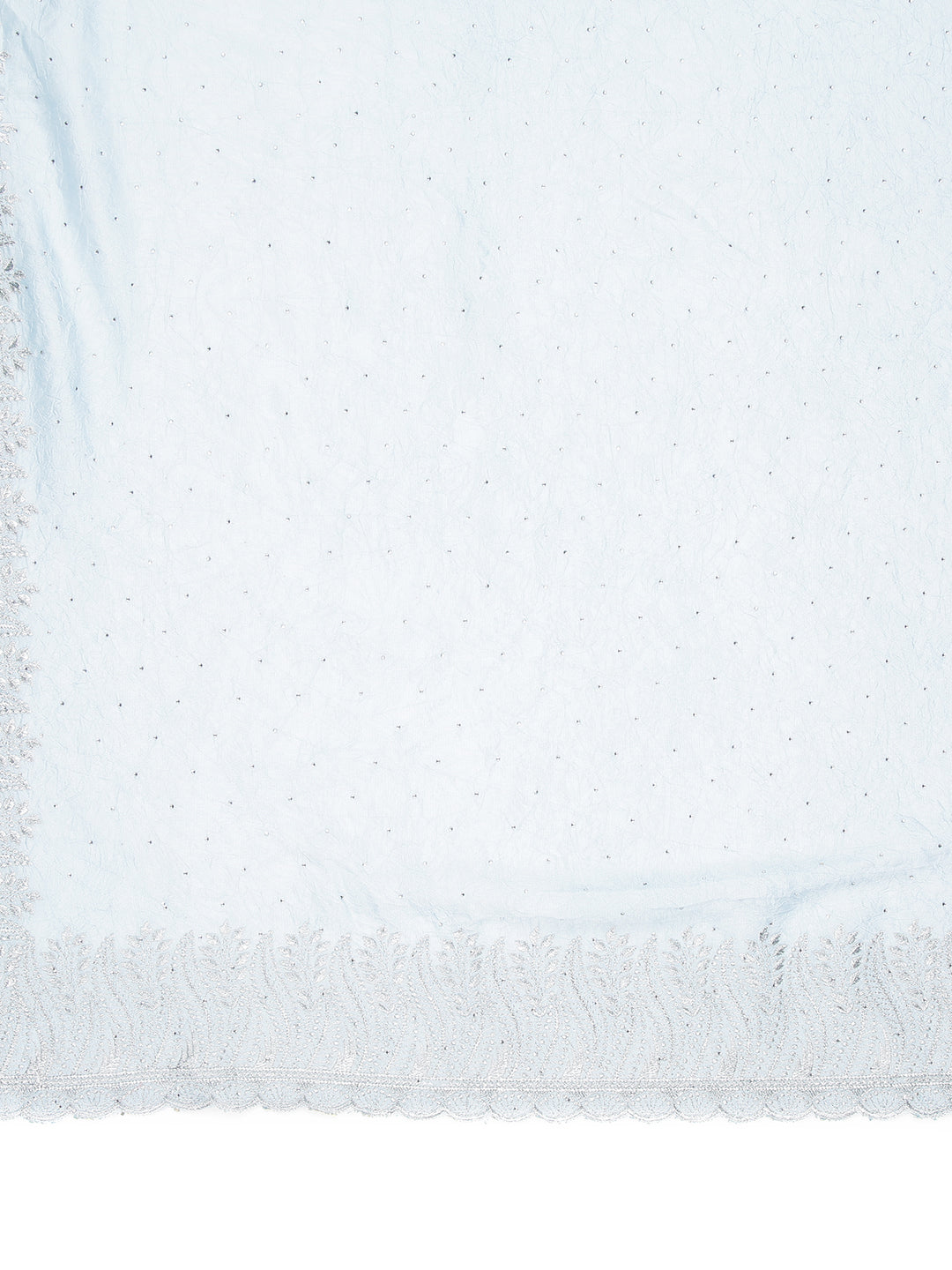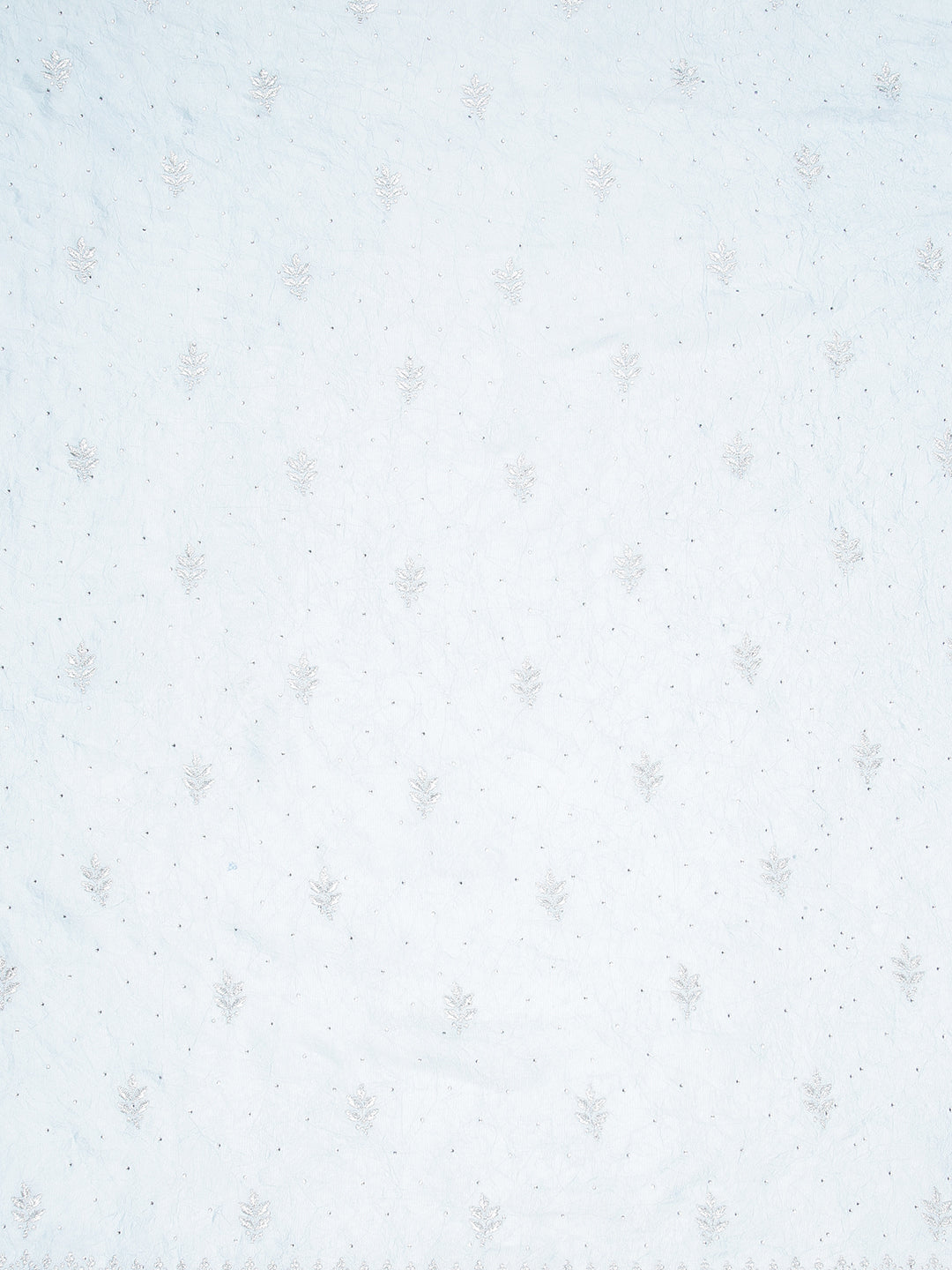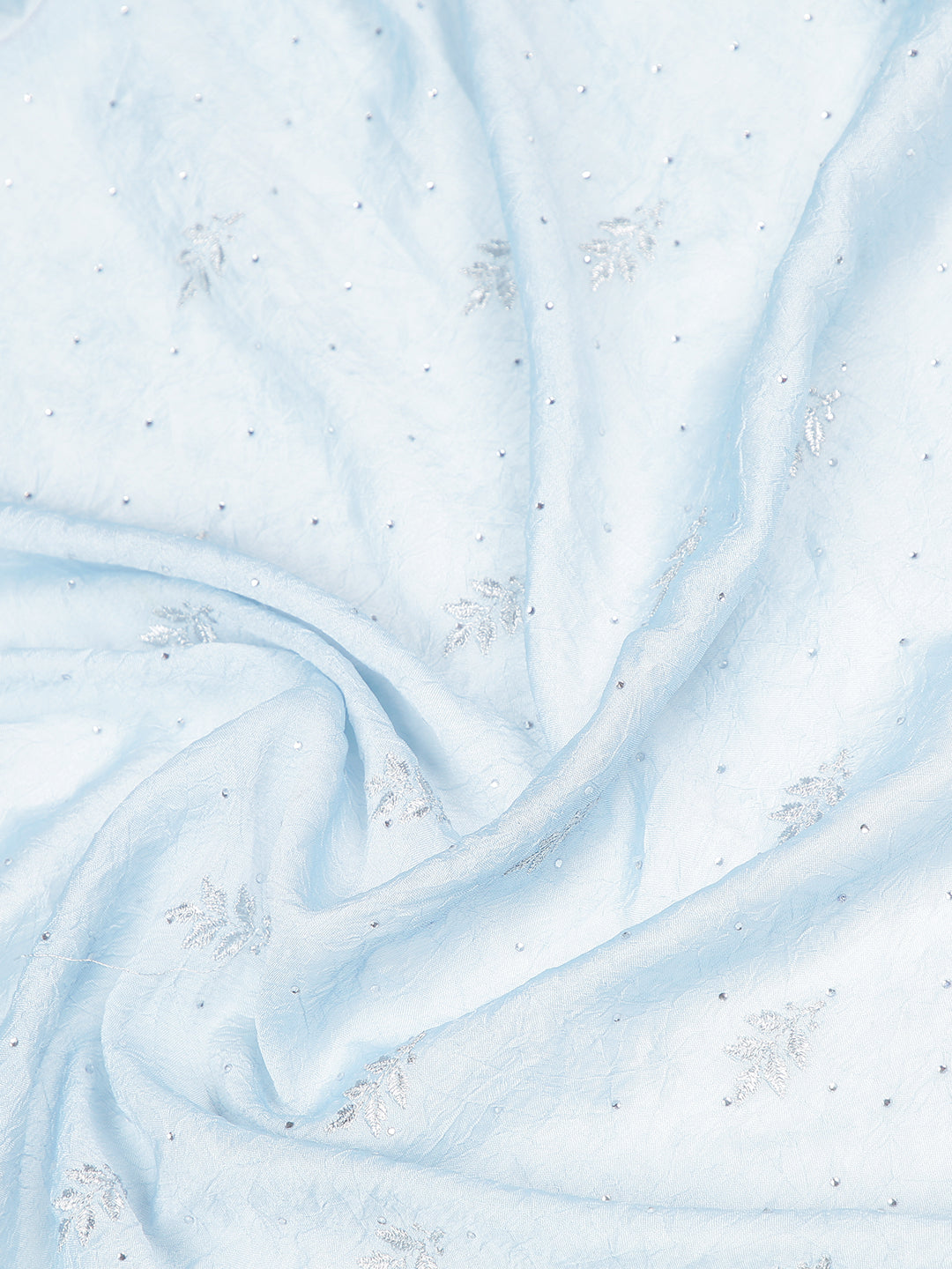 Experience cool elegance in this ice blue crushed chiffon saree, embellished with mini silver stones scattered throughout the body. The lightweight fabric offers a flowing drape ideal for celebrations and special occasions.